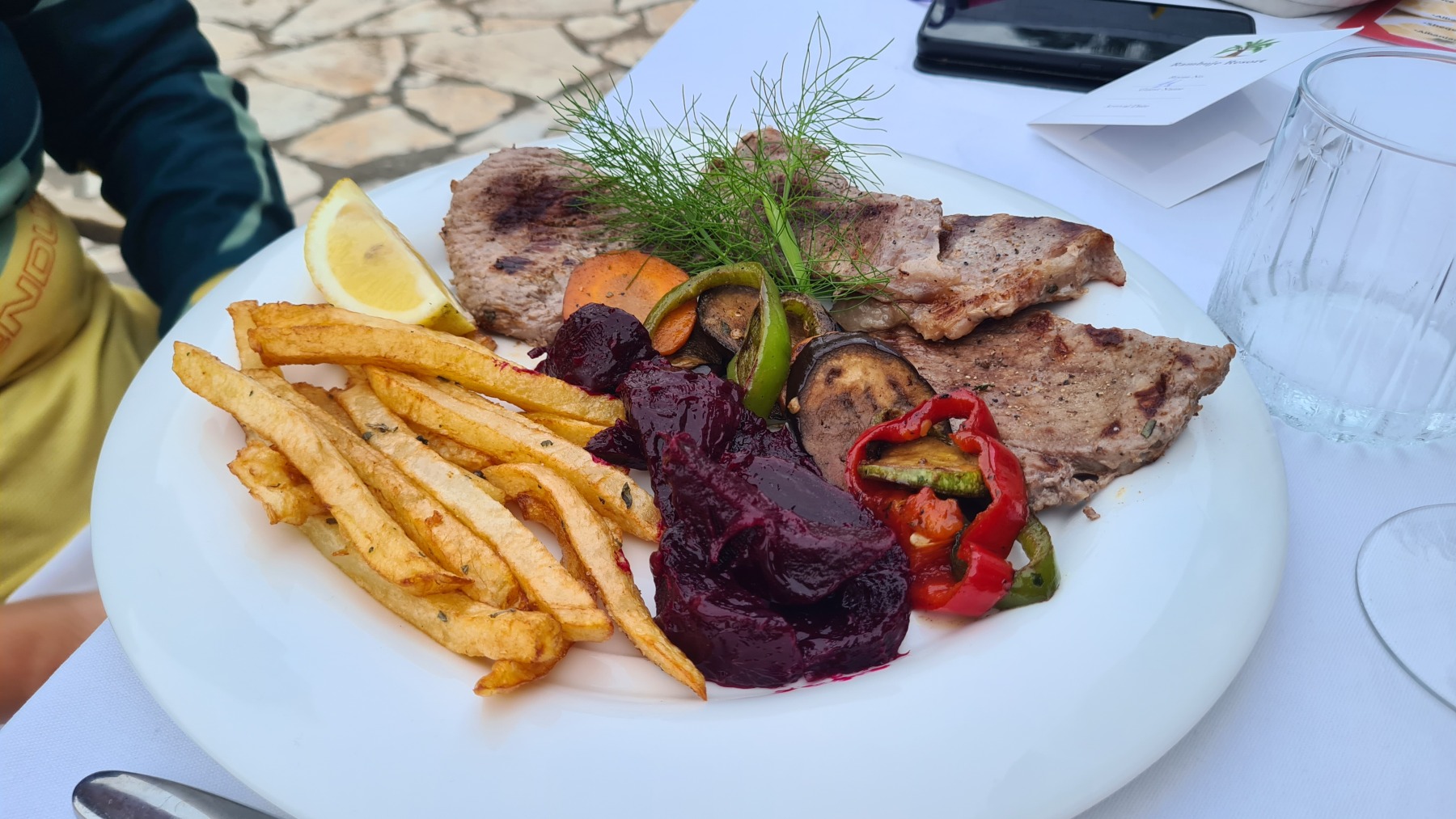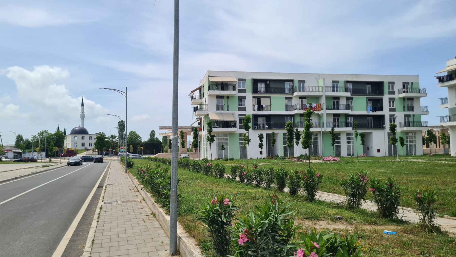Nous avons déjeuné dans un fast-food albanais dans une zone de petits immeubles neufs et propres du village de Thumanë. Un des clients parlait français et nous a servi d’interprète pour la commande. Gisèle lui a expliqué notre périple et, là encore, il a tenu à nous offrir nos boissons. L’hospitalité des Albanais est vraiment touchante.