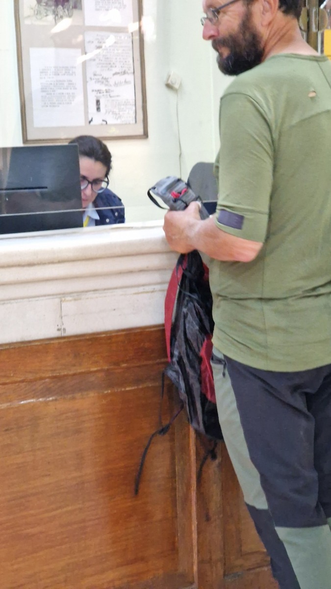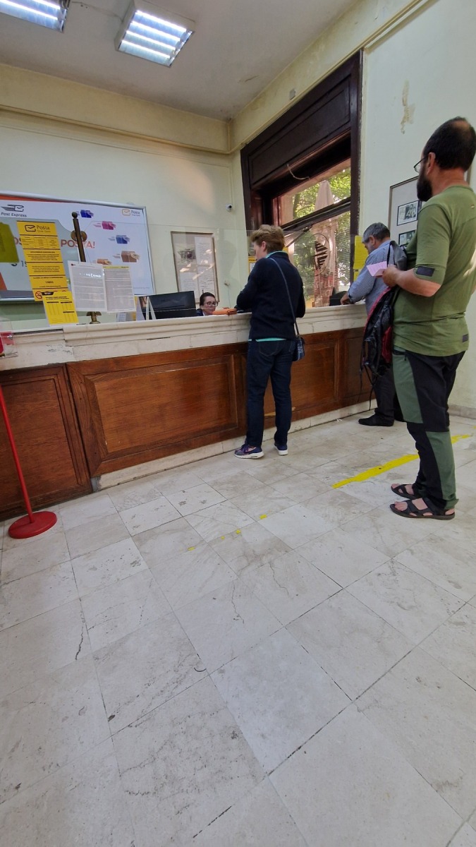 Ce soir nous avons testé le sens de la bureaucratie monténégrine : en principe les touristes doivent se faire enregistrer dans chacun de leurs lieux de résidence. Nous ne l’avions pas fait les jours précédents et nous avons décidé de jouer le jeu. Nous sommes donc allé à l’office du tourisme où une hôtesse a scanné nos cartes d’identité, rentré des données sur son ordinateur et rempli à la main une fiche rose en deux exemplaires avant de nous dire d’aller présenter la fiche à la poste qui encaisserait 1€60. Nous sommes donc allé à la poste où une employée a recopié des informations de la fiche rose sur son ordinateur, gardé une des copies, tamponné l’autre qu’elle nous a rendu contre 1€60. Gisèle a également immortalisé mon passage à la poste…