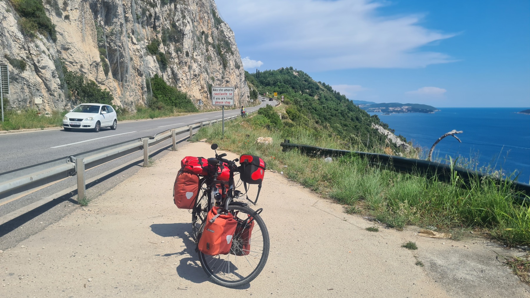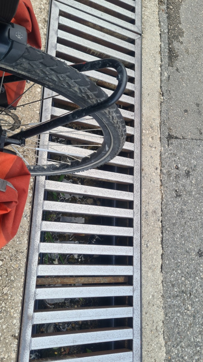 En descendant pour rejoindre le bord de mer nous avons rencontré un de ces pièges à vélo que l’on trouve au Monténégro : des grilles d’évacuation avec des fentes suffisamment larges pour coincer une roue de vélo.