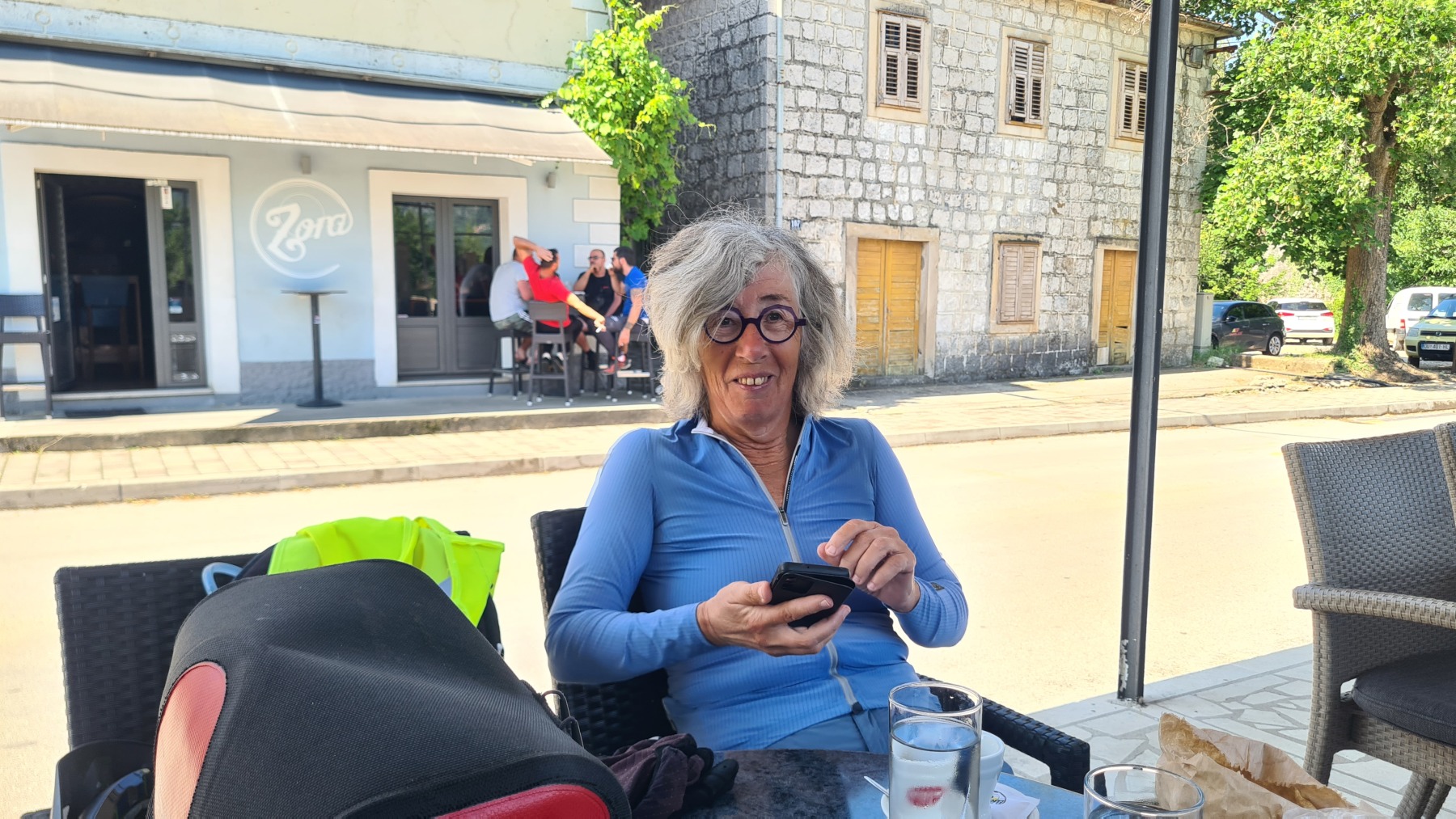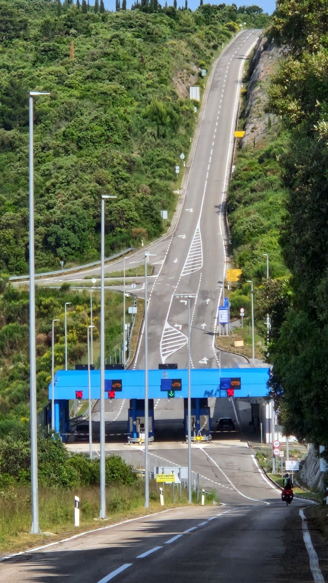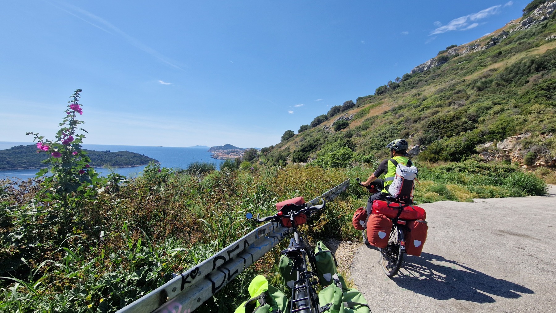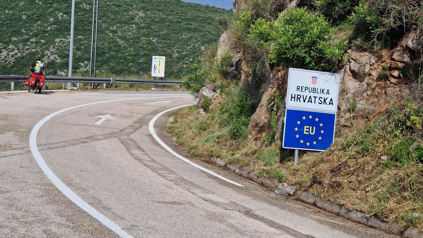 Nous sommes arrivés à la sortie des bouches de Kotor et le passage de la frontière -et notre rentrée dans l’espace Schengen- s’est fait sans problème. La barrière coté croate est situé à la fin d’une belle descente et juste avant une belle montée ce qui a un peu énervé Gisèle !