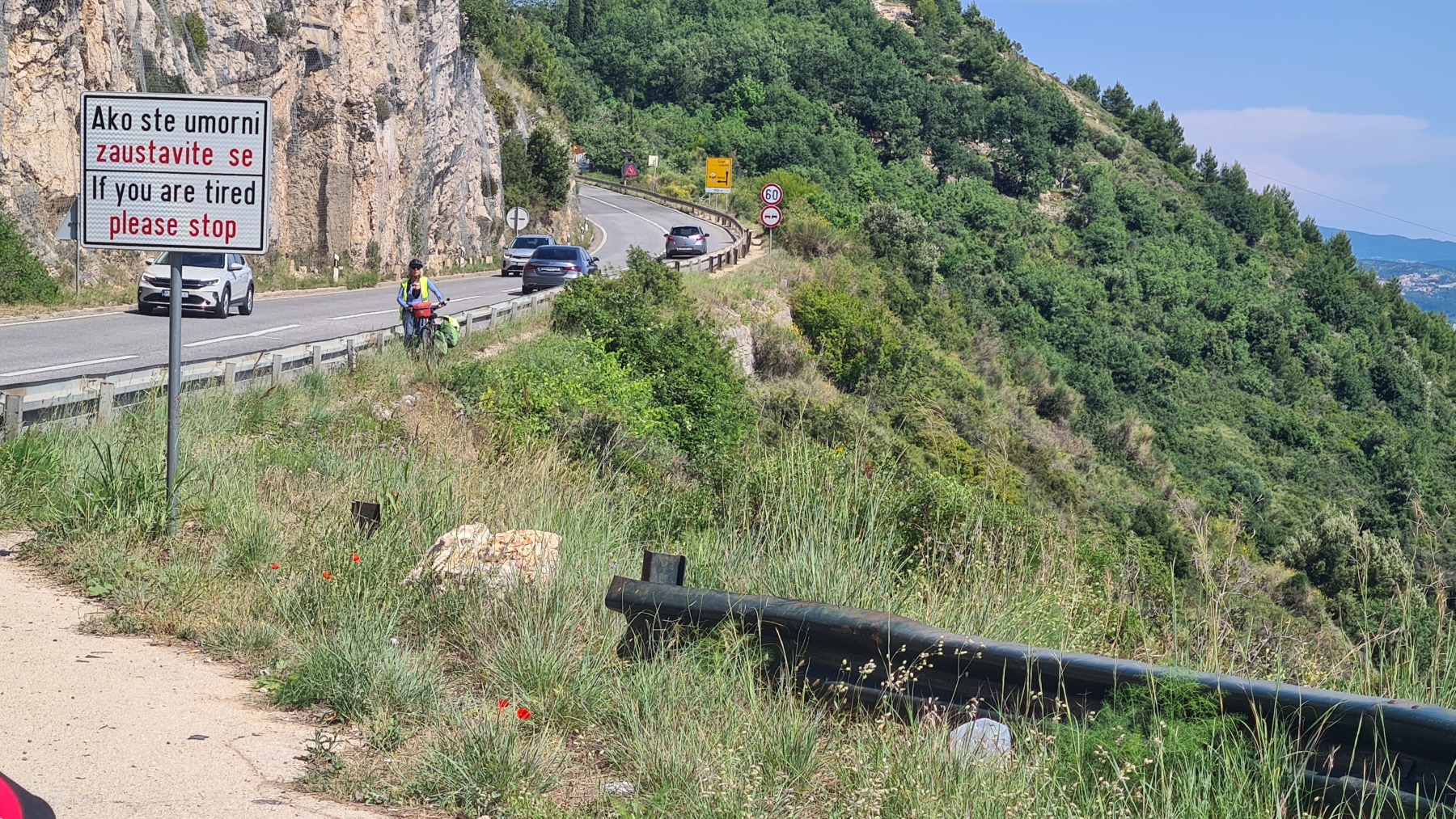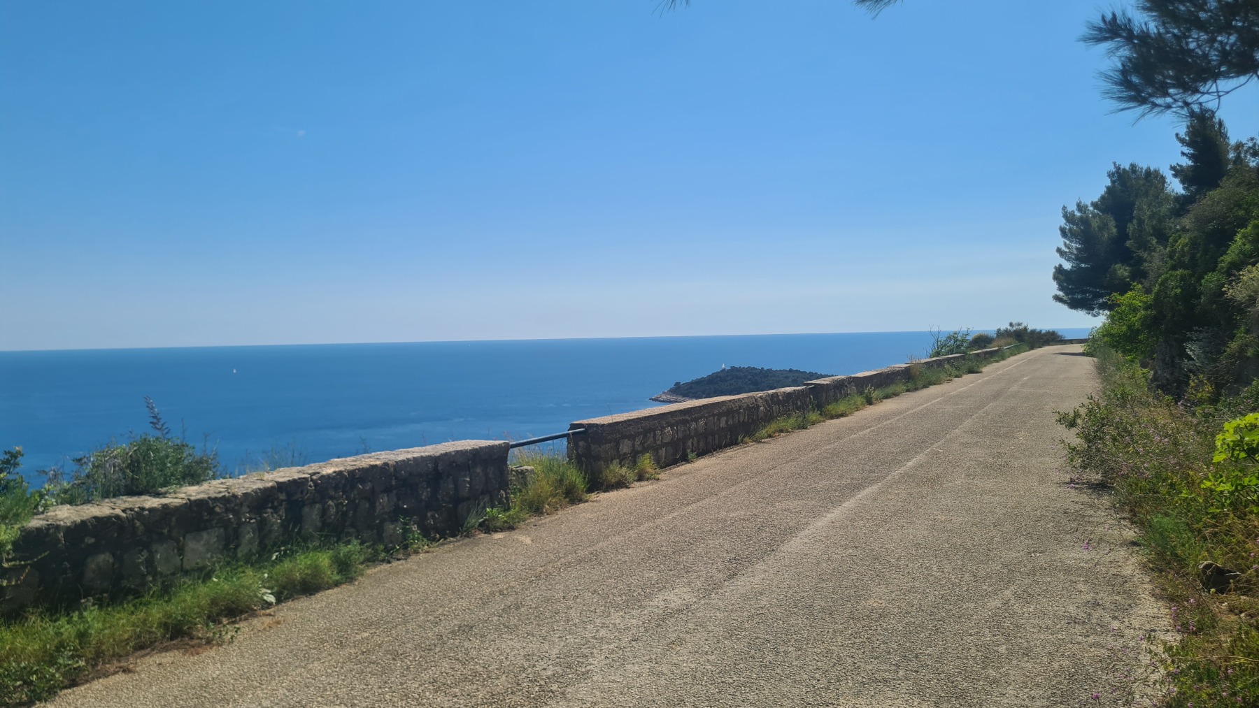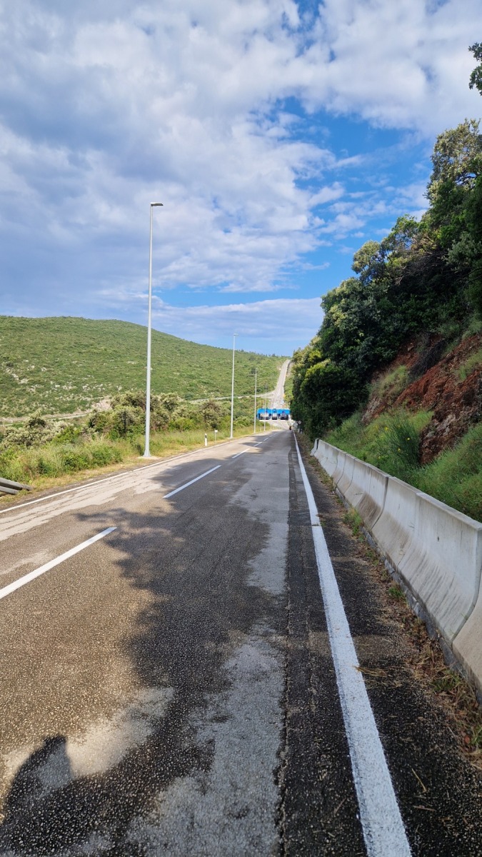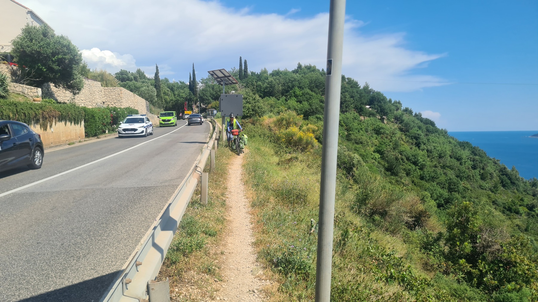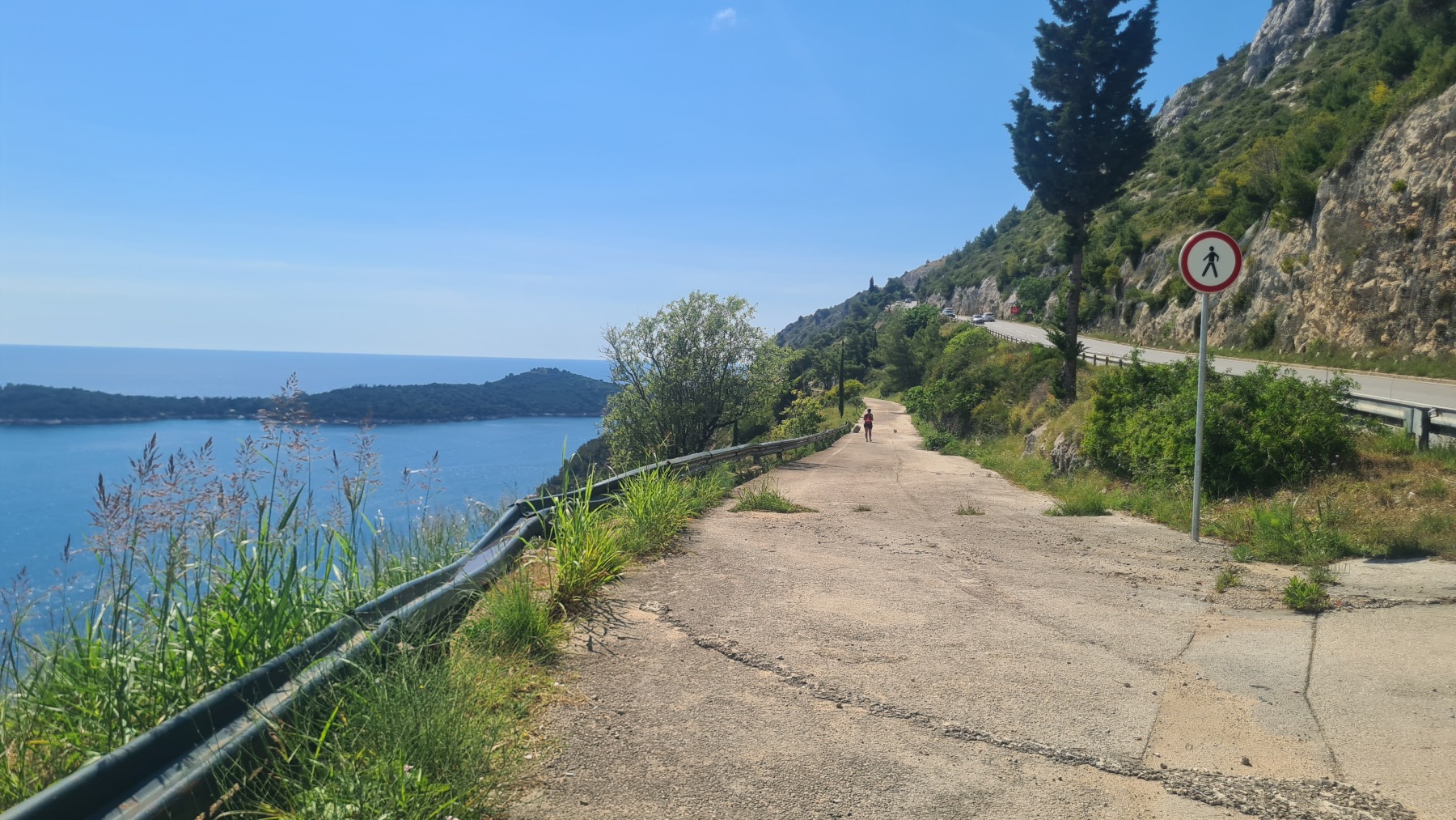 A la sortie de cette section nous étions un peu tendus et nous avons pris un jus d’oranges pressées pour nous remettre de nos émotions. Un peu plus loin, nous avons rejoint la D8 pour une nouvelle section de 1 km. Nous l’avons quitté pour rejoindre une ancienne route qui part sur la gauche pour descendre sur Dubrovnik. L’entrée de cette route est barrée par le rail de sécurité de la D8 et pour la rejoindre il faut traverser la D8 500m avant pour suivre un sentier étroit qui chemine de l’autre côté du rail en surplombant la mer de 180 m de hauteur.