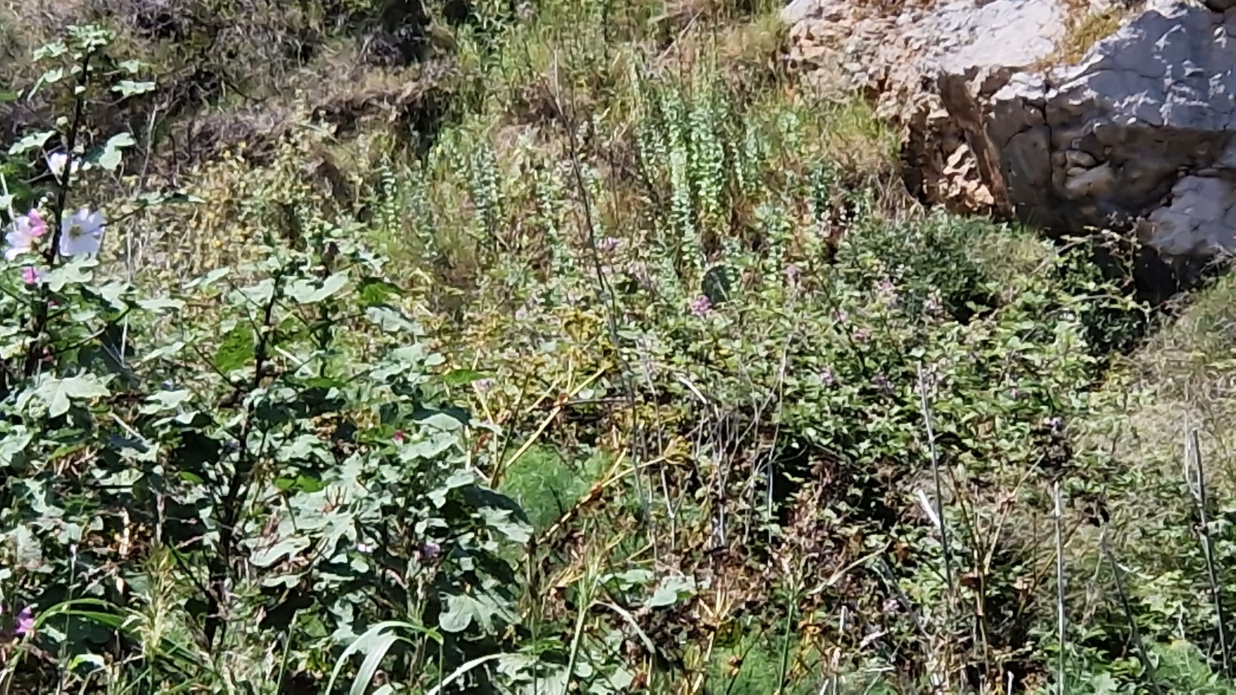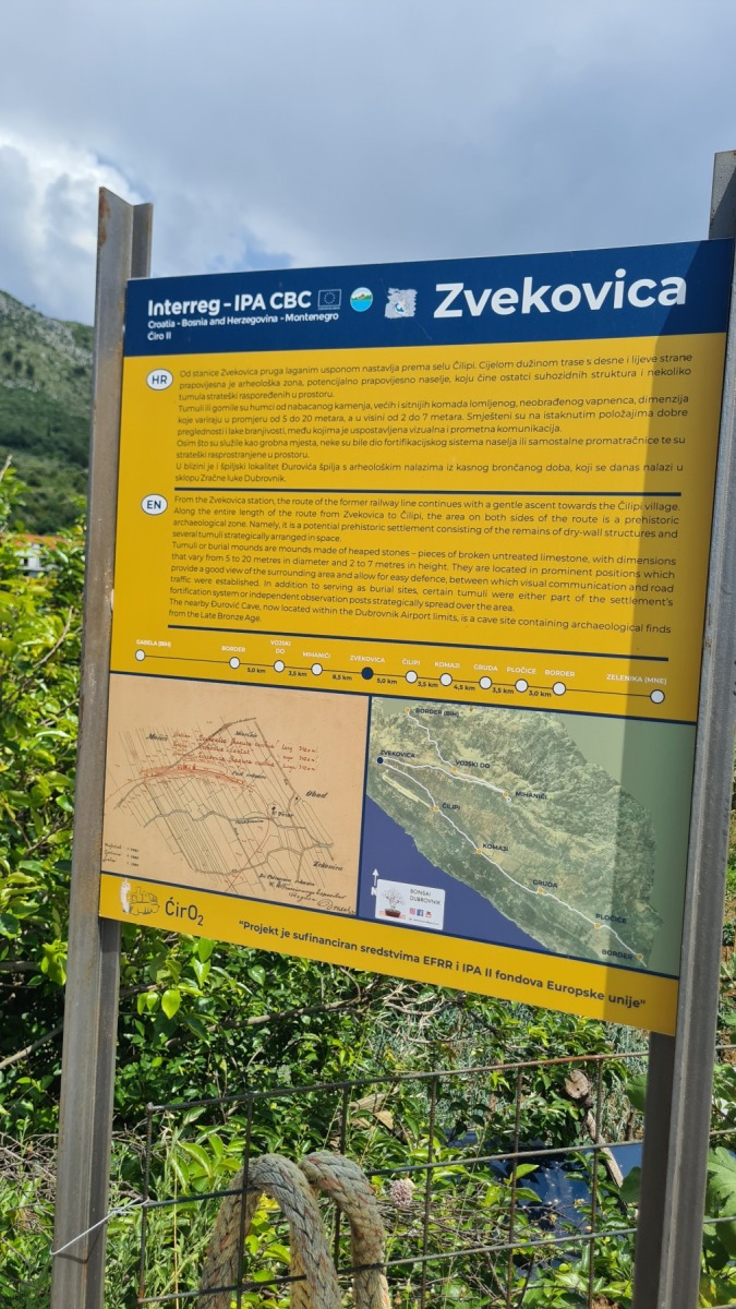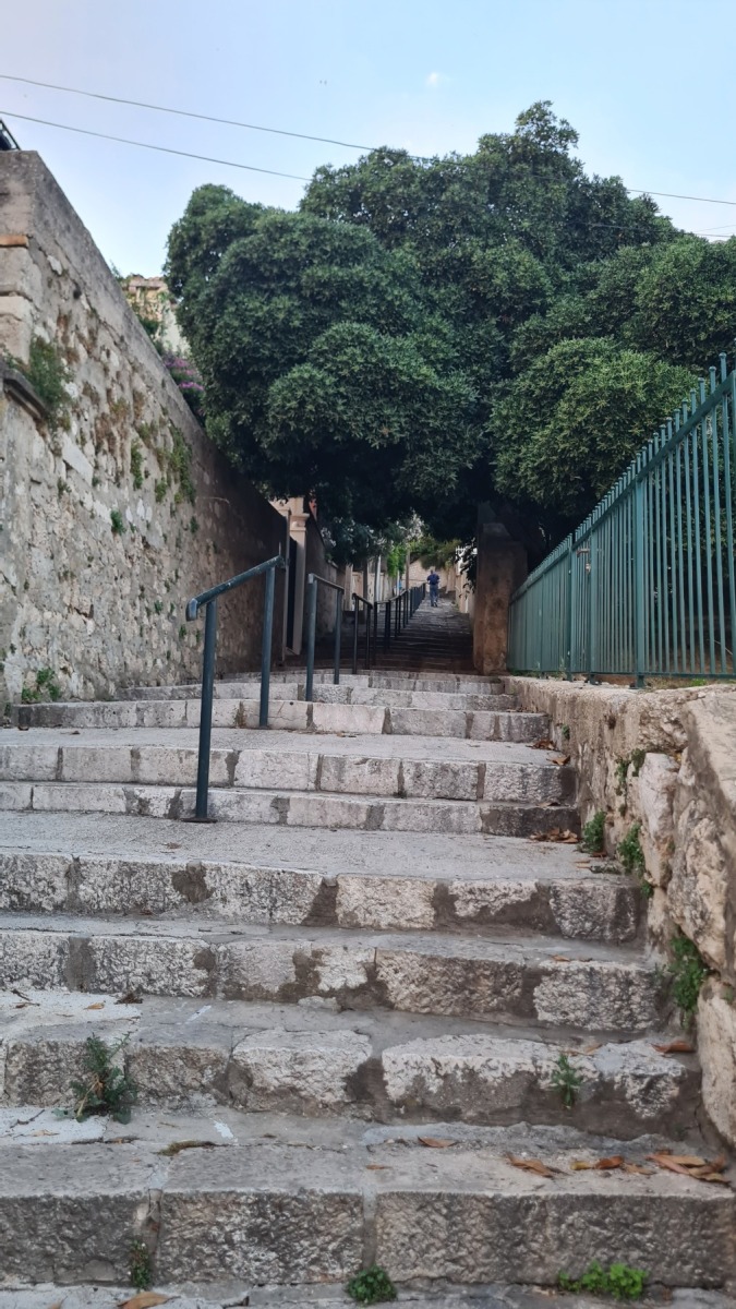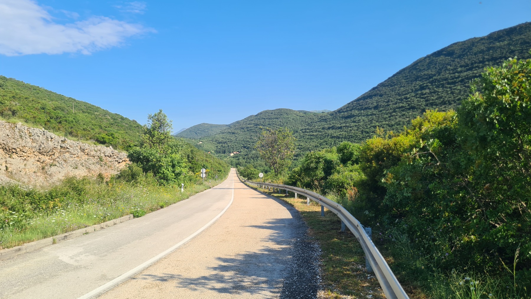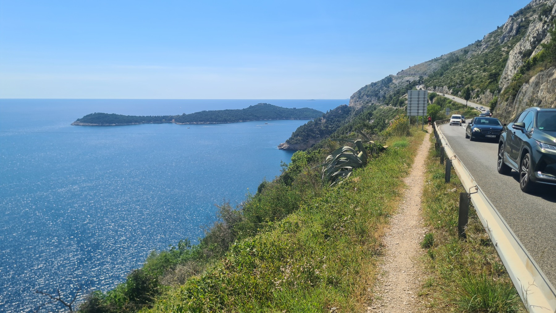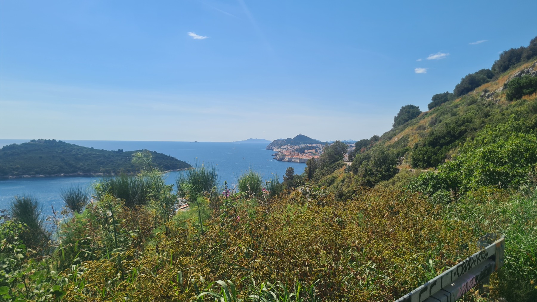A la sortie de cette section nous étions un peu tendus et nous avons pris un jus d’oranges pressées pour nous remettre de nos émotions. Un peu plus loin, nous avons rejoint la D8 pour une nouvelle section de 1 km. Nous l’avons quitté pour rejoindre une ancienne route qui part sur la gauche pour descendre sur Dubrovnik. L’entrée de cette route est barrée par le rail de sécurité de la D8 et pour la rejoindre il faut traverser la D8 500m avant pour suivre un sentier étroit qui chemine de l’autre côté du rail en surplombant la mer de 180 m de hauteur.