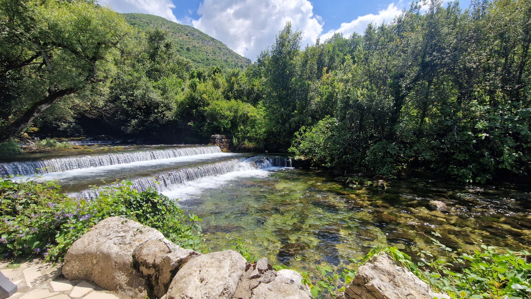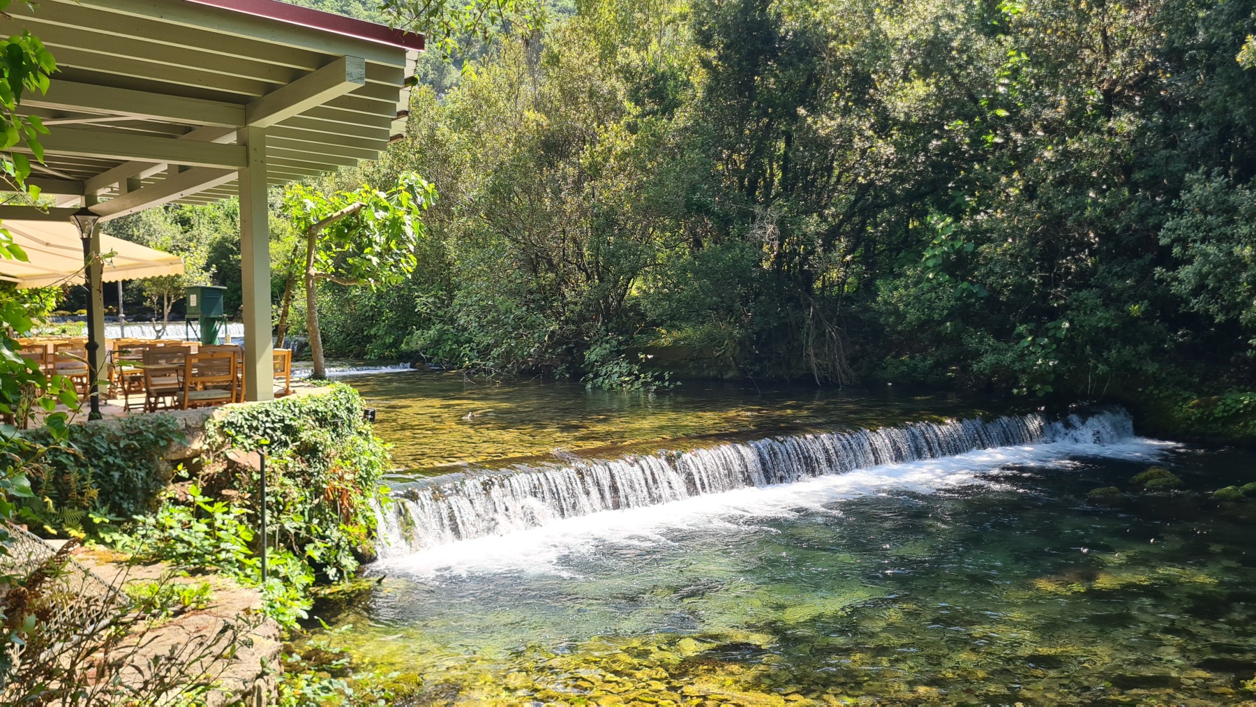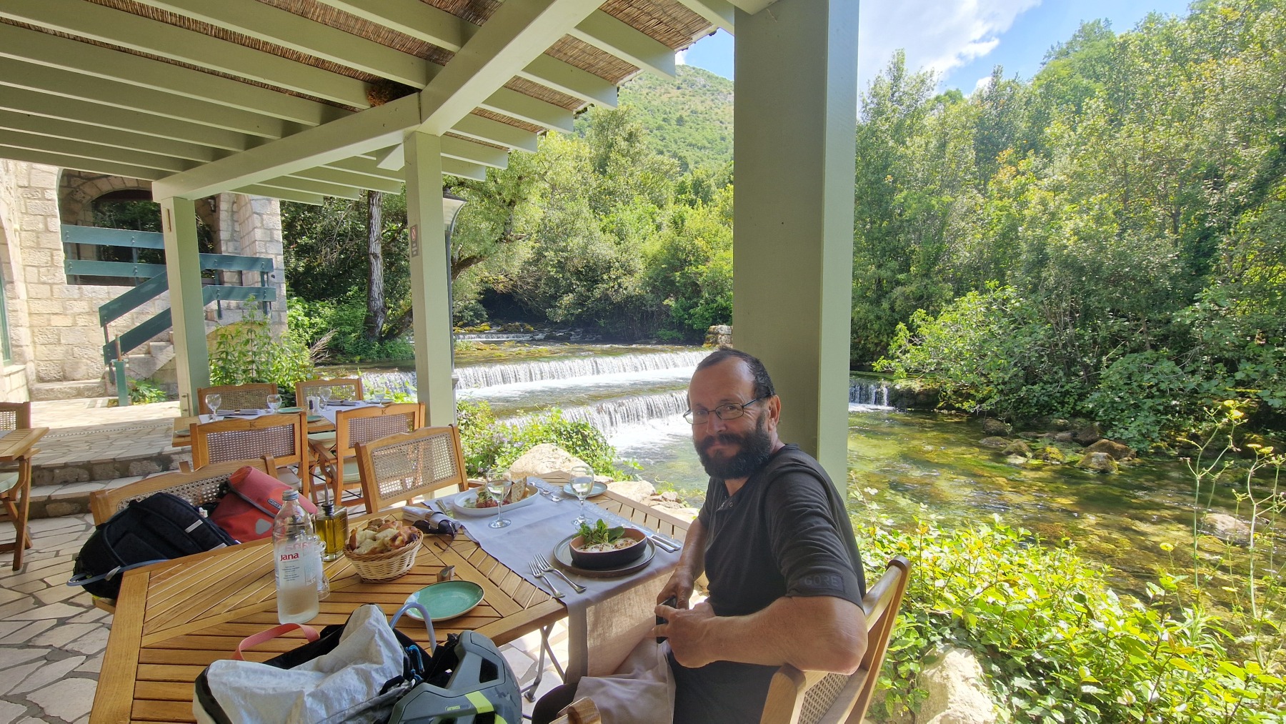 Nous sommes arrivés à Ljuta (célèbre pour ses moulins à eau) un peu avant 11h00 et nous avons suivi la rivière et visité quelques moulins avant de nous installer en terrasse au restaurant installé dans un de ces moulins. En Croatie comme au Monténégro les gens semblent manger à toute heure et les restaurants sont souples sur les horaires. Le notre commençait à servir à 11h00 ce qui nous convenait bien. Pendant le déjeuner nous avons observé le balais d’un couple de cincles plongeurs qui se relayaient pour aller pécher et nourrir leurs rejetons dans un nid installé sur une poutre de la terrasse. Je ne connaissais pas ces oiseaux et leur technique de pêche est impressionnante.