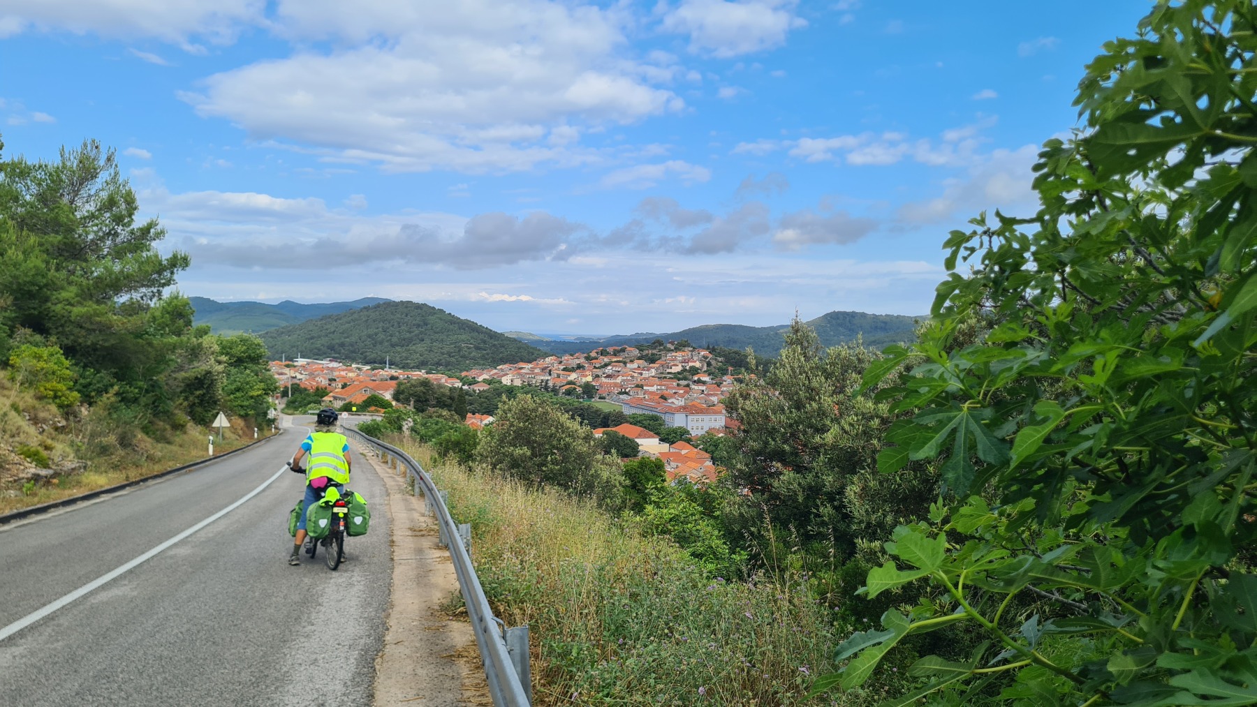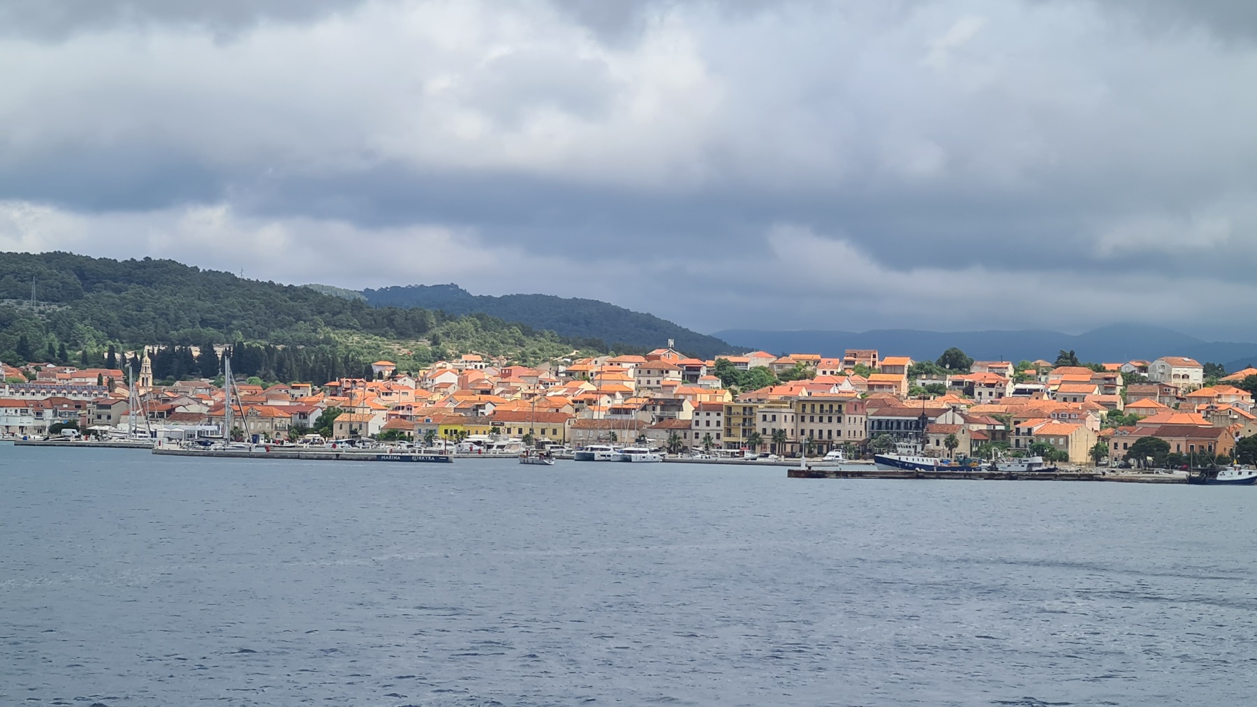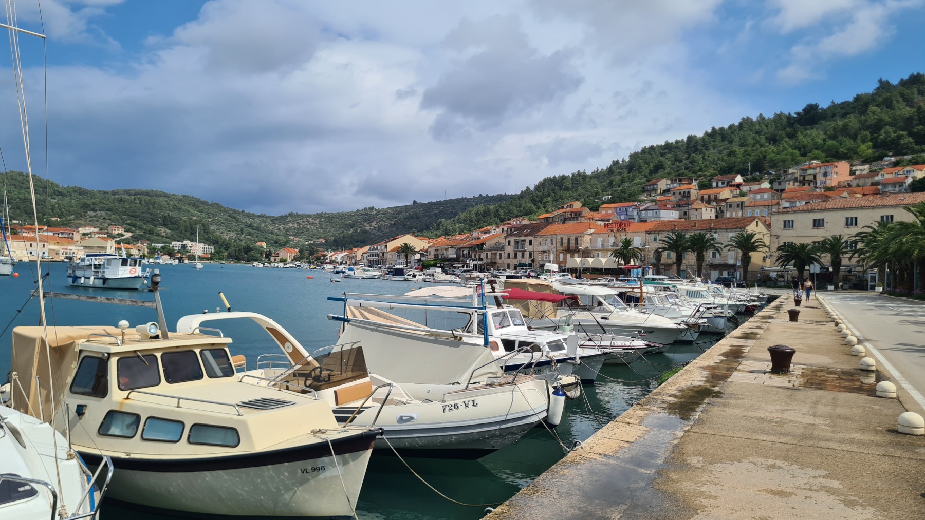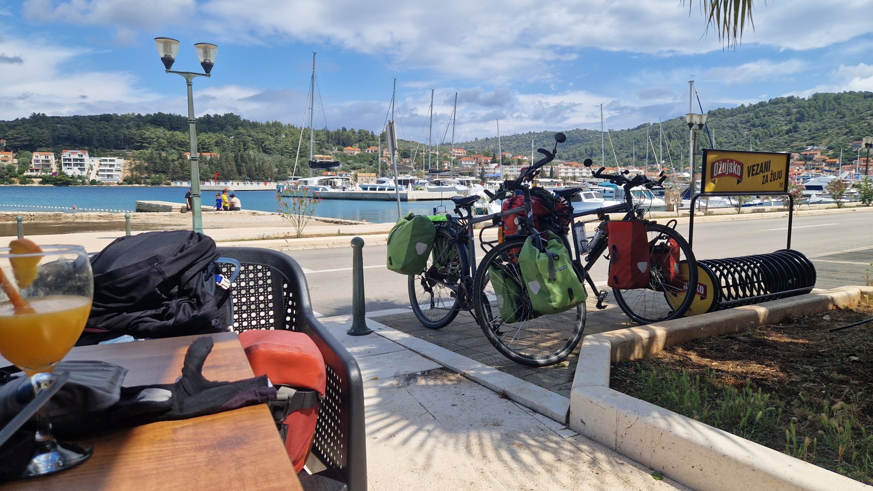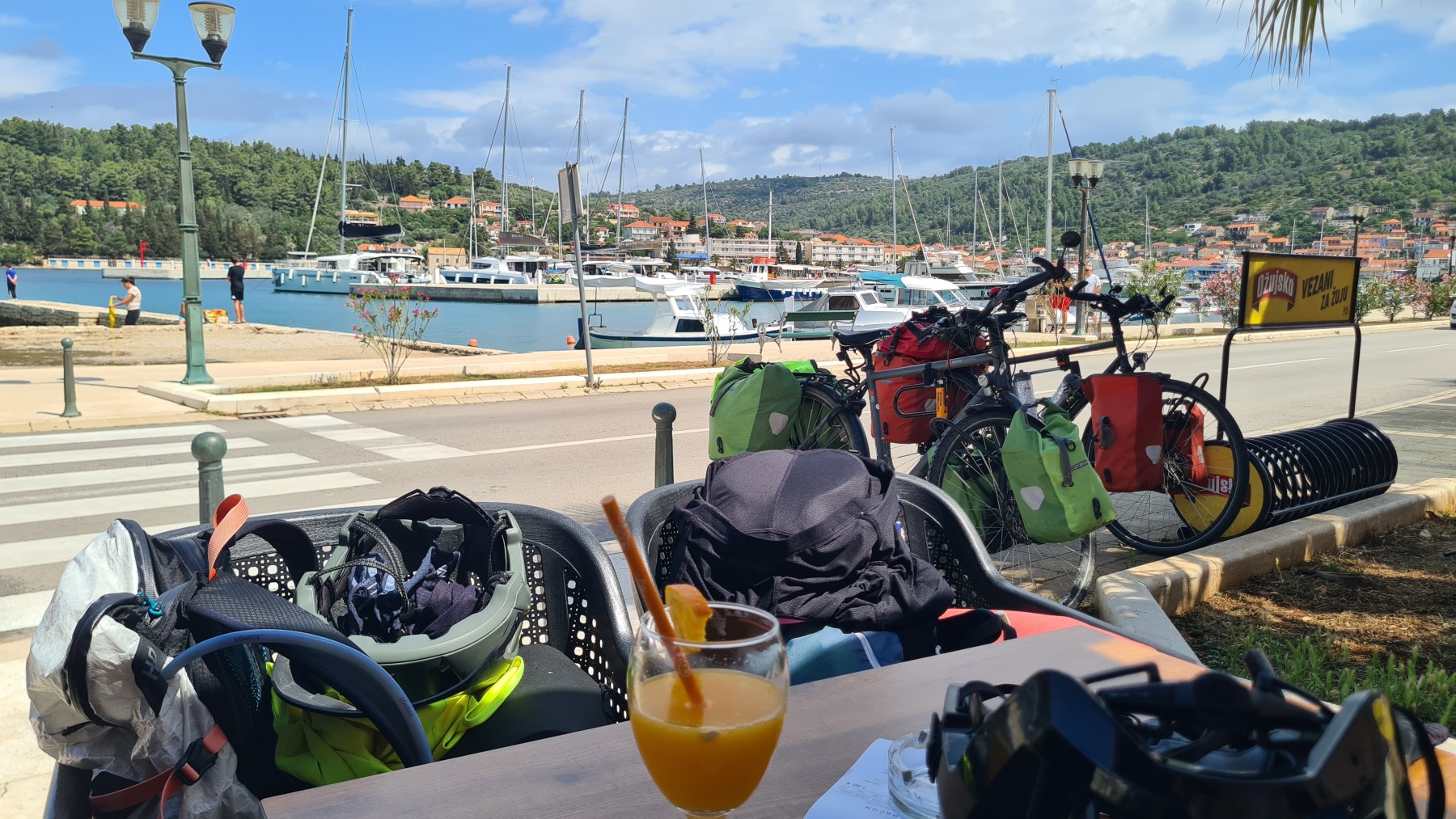 Ce matin nous avons rejoint le port de Vela Luka. Les 250 m de montée à 6% à la fraiche ont été un vrai bonheur par rapport à celle d’hier et nous sommes arrivés à Vela Luka pour le premier café.