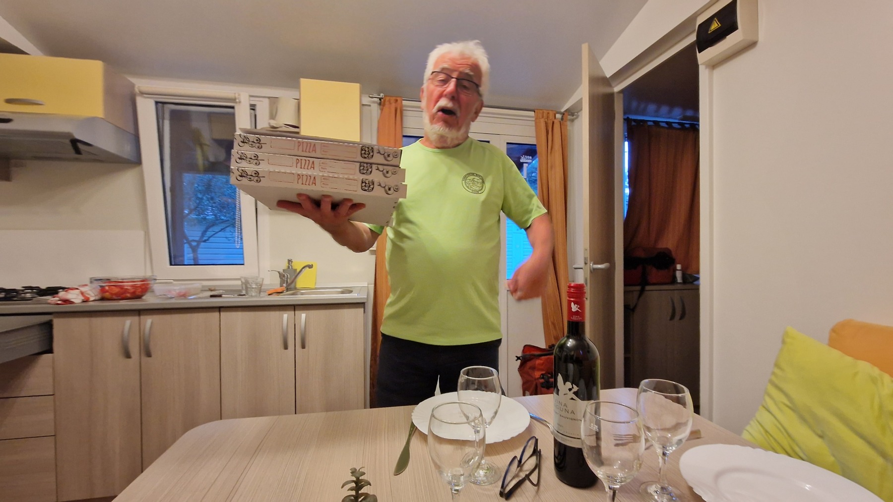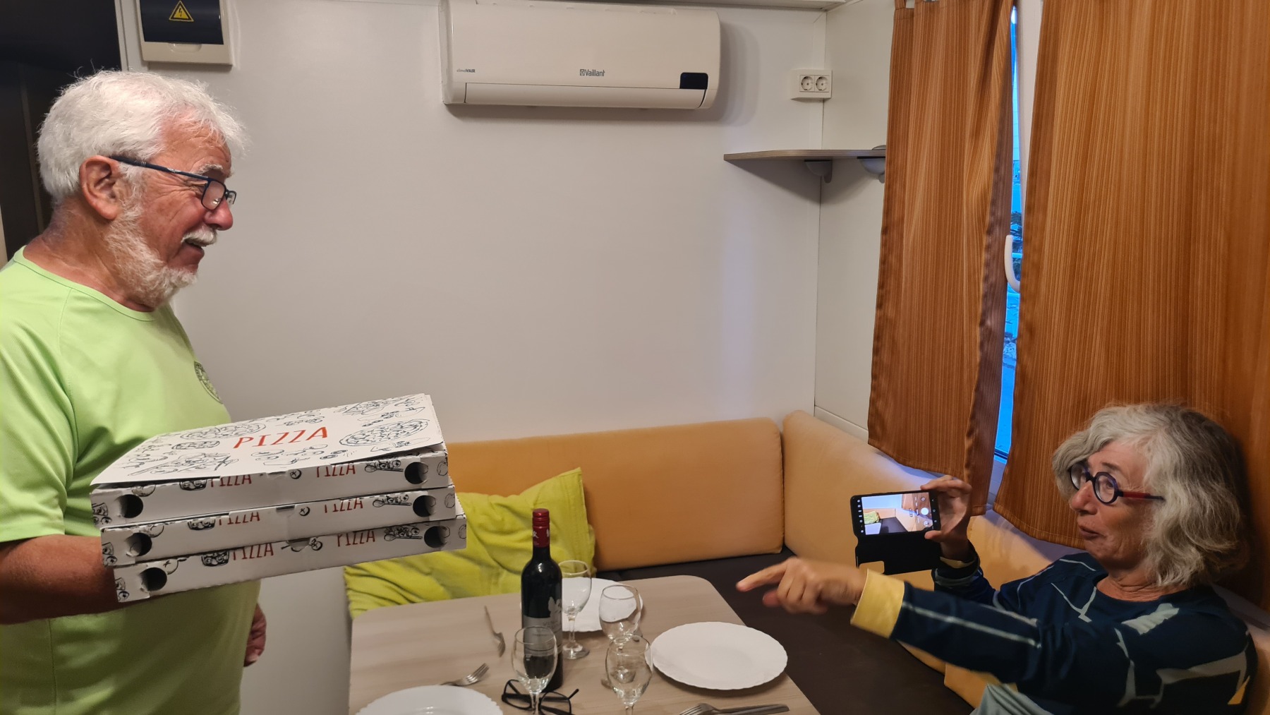 Ce soir nous dormons dans un mobile home dans lequel nous avons fait une soirée pizza…