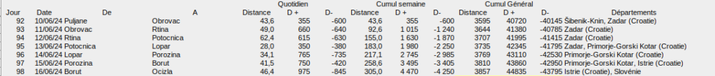 Sept jours de vélo et pas mal de traversées en ferry (en bleu sur la carte et non comptabilisées dans les distances) cette semaine, le kilométrage n’est pas impressionnant, le dénivelé un peu plus et nous avons bien progressé vers Ljubljana que nous devrions atteindre dans deux jours.