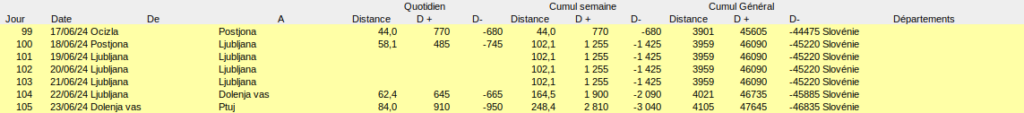 Quatre jours de vélo et trois jours de repos (en vert). Cette semaine nous avons quasiment traversé la Slovénie en diagonale et nous avons dépassé les 4000 km. Nous progressons vers le nord mais aussi vers l’est pour continuer à remonter en évitant les plus hauts sommets des Alpes.