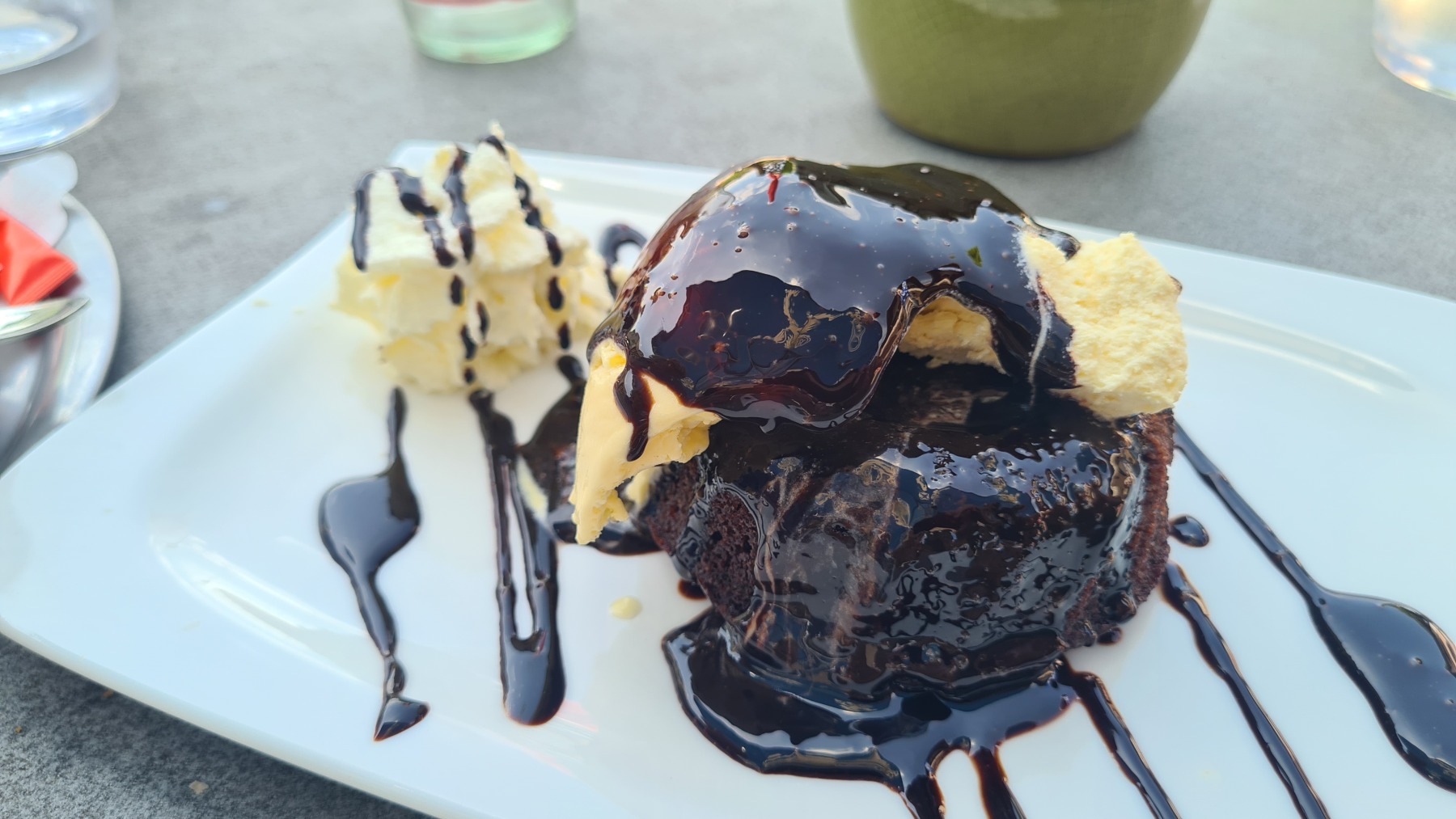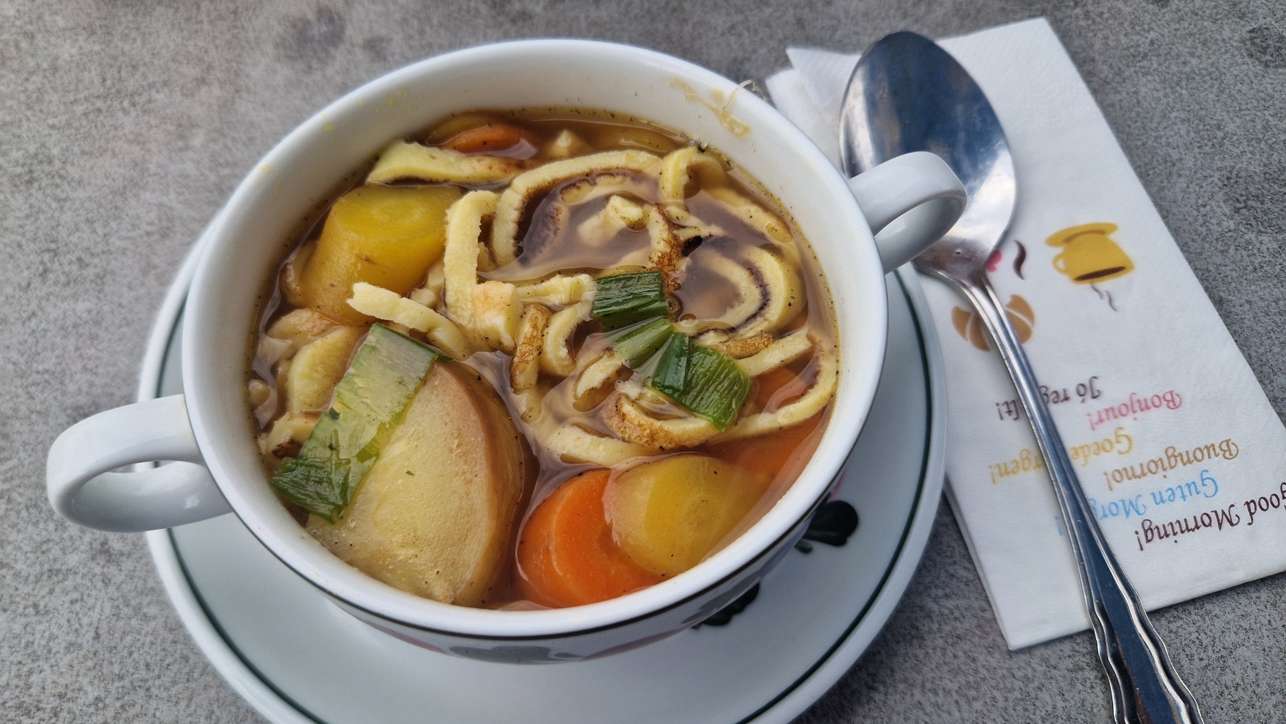 Au déjeuner nous avons gouté aux spécialités locales, notamment une très bonne soupe aux crêpes (frittatensuppe en allemand, heureusement que nous ne nous sommes pas arrêtés à la traduction de Google : « soupe de pommes de terre frites » ) et un fondant au chocolat « mohr im hemd » (« amarrer en chemise » d’après Google).