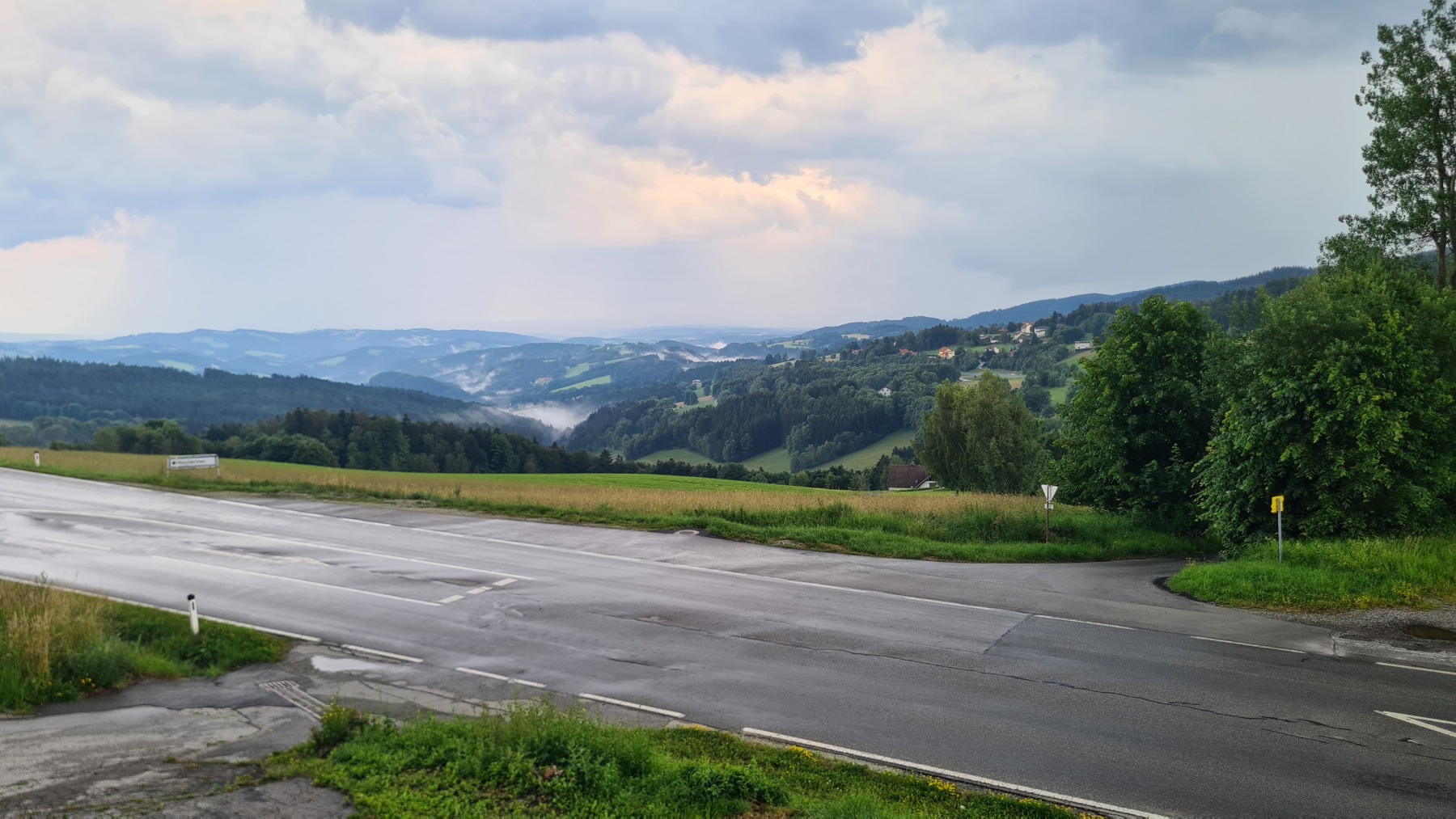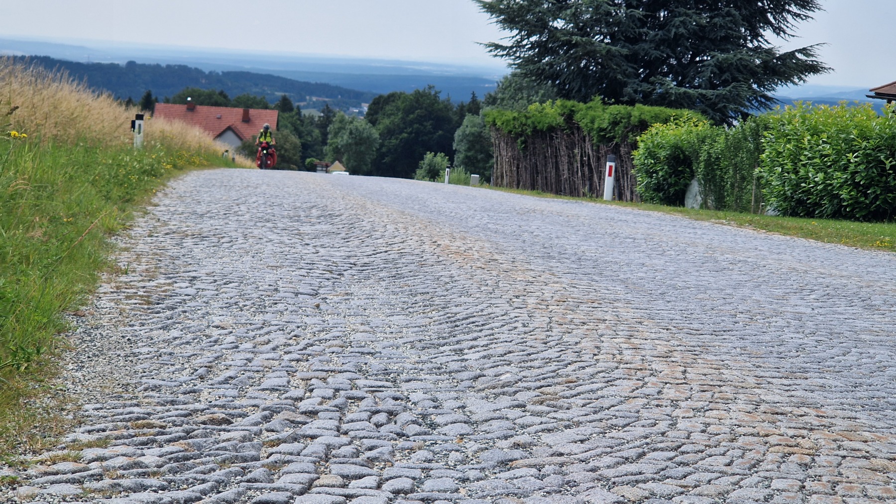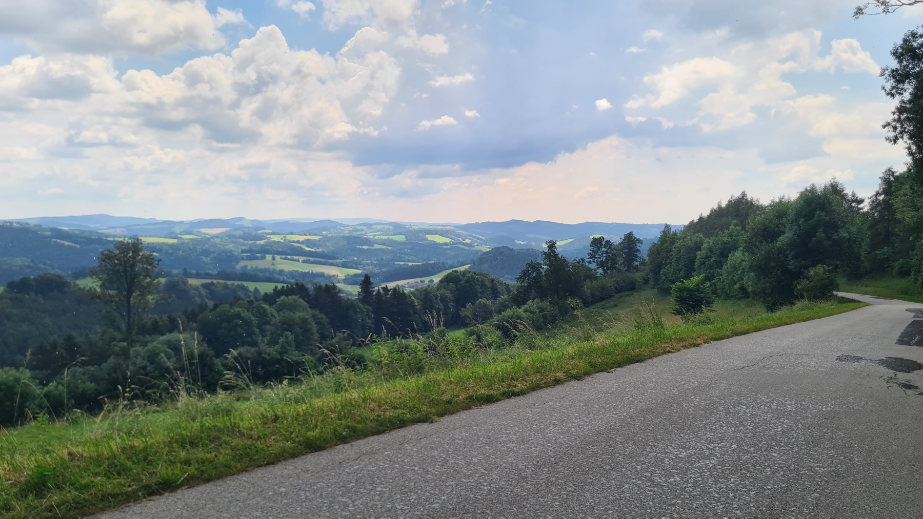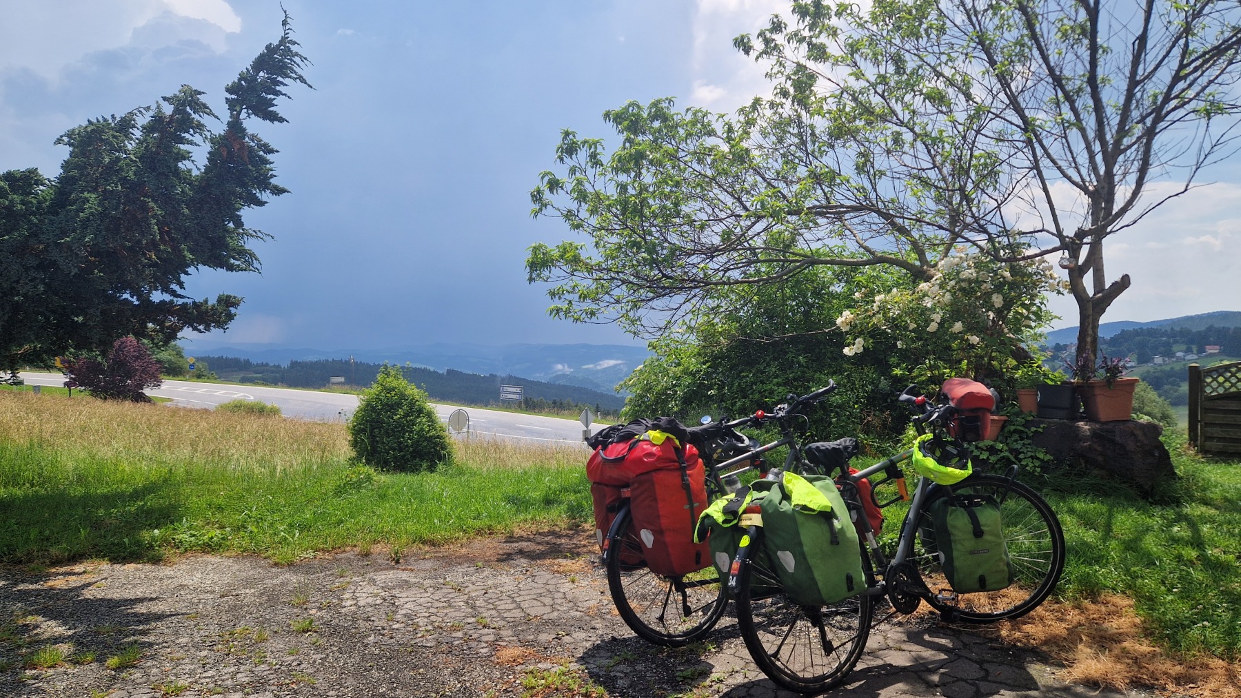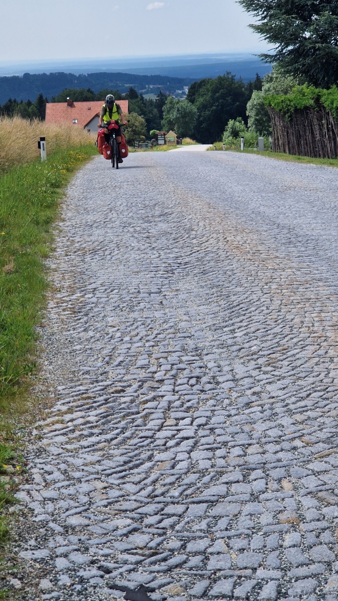 Aujourd’hui nous nous sommes attaqués au Wechsel, cette extrémité est des Alpes qui sépare la Styrie de la Basse Autriche et nous dormons à Mönichkirchen. Nous n’avons gagné que 650 m d’altitude mais le parcours est très ondulant avec des passages raides et des descentes et le dénivelé positif est bien plus important. Une des montées, pavée avec de jolis petits pavés disjoints est particulièrement éprouvante.