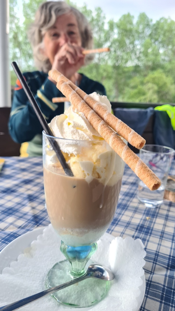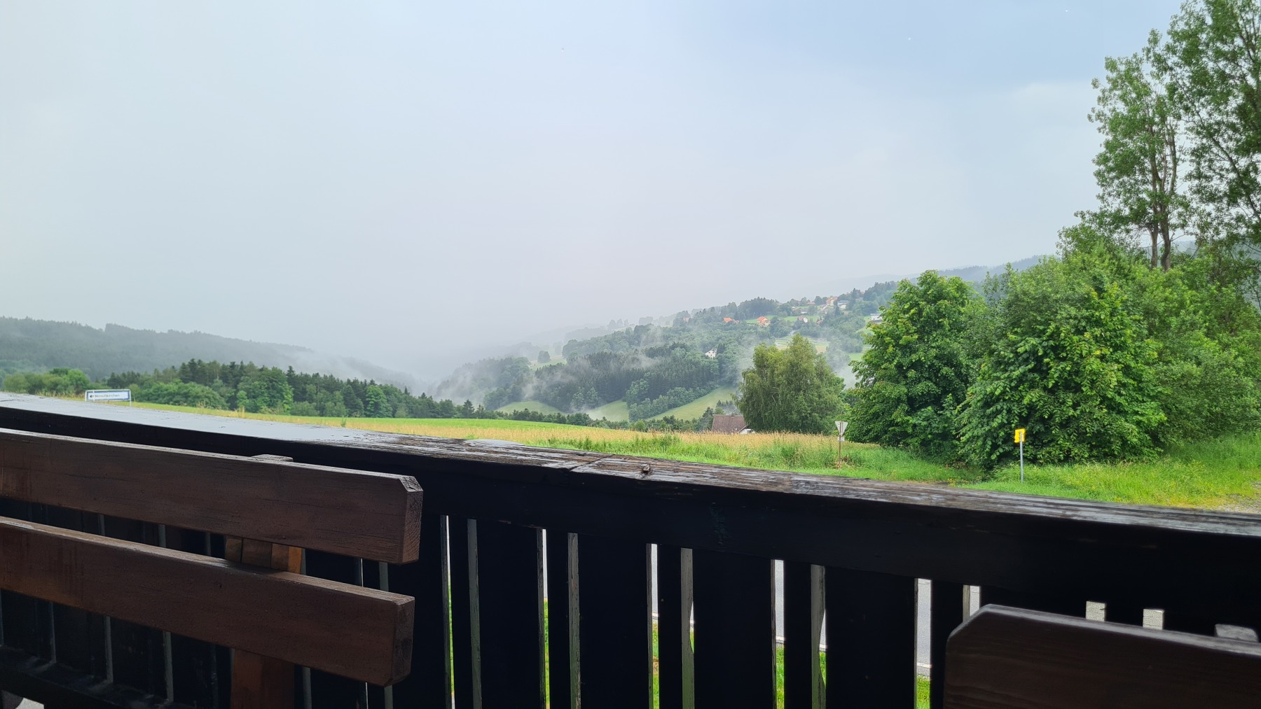 Sur la fin du parcours nous avons pris une belle ondée et sommes arrivés trempés à l’auberge. Heureusement, notre chambre était disponible et nous avons pu nous changer avant d’aller déjeuner. Le temps est resté très variable dans l’après midi et c’était impressionnant de voir se succéder des périodes de soleil où il faisait chaud et des ondées qui tombaient sur le sol chaud et s’évaporaient immédiatement en brume et nuages.