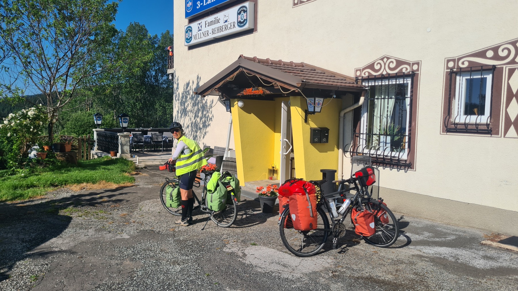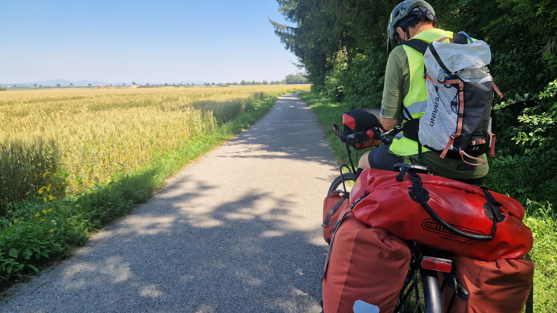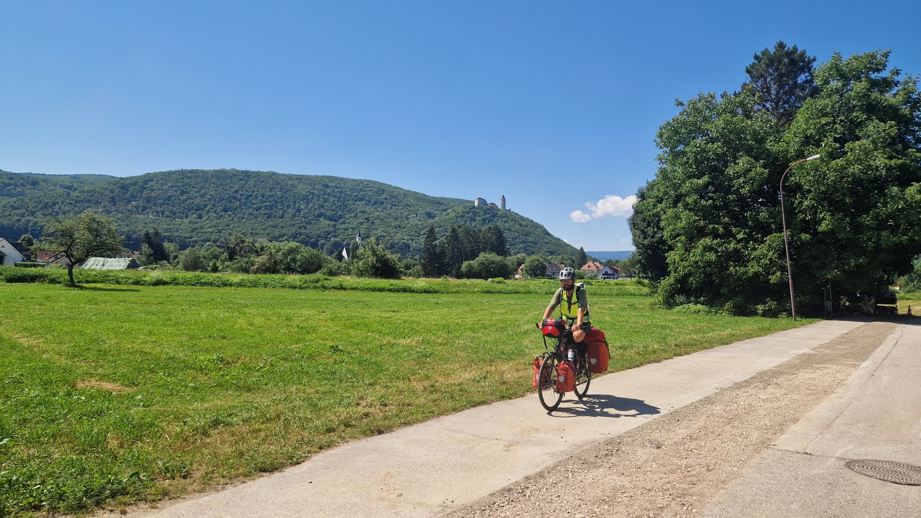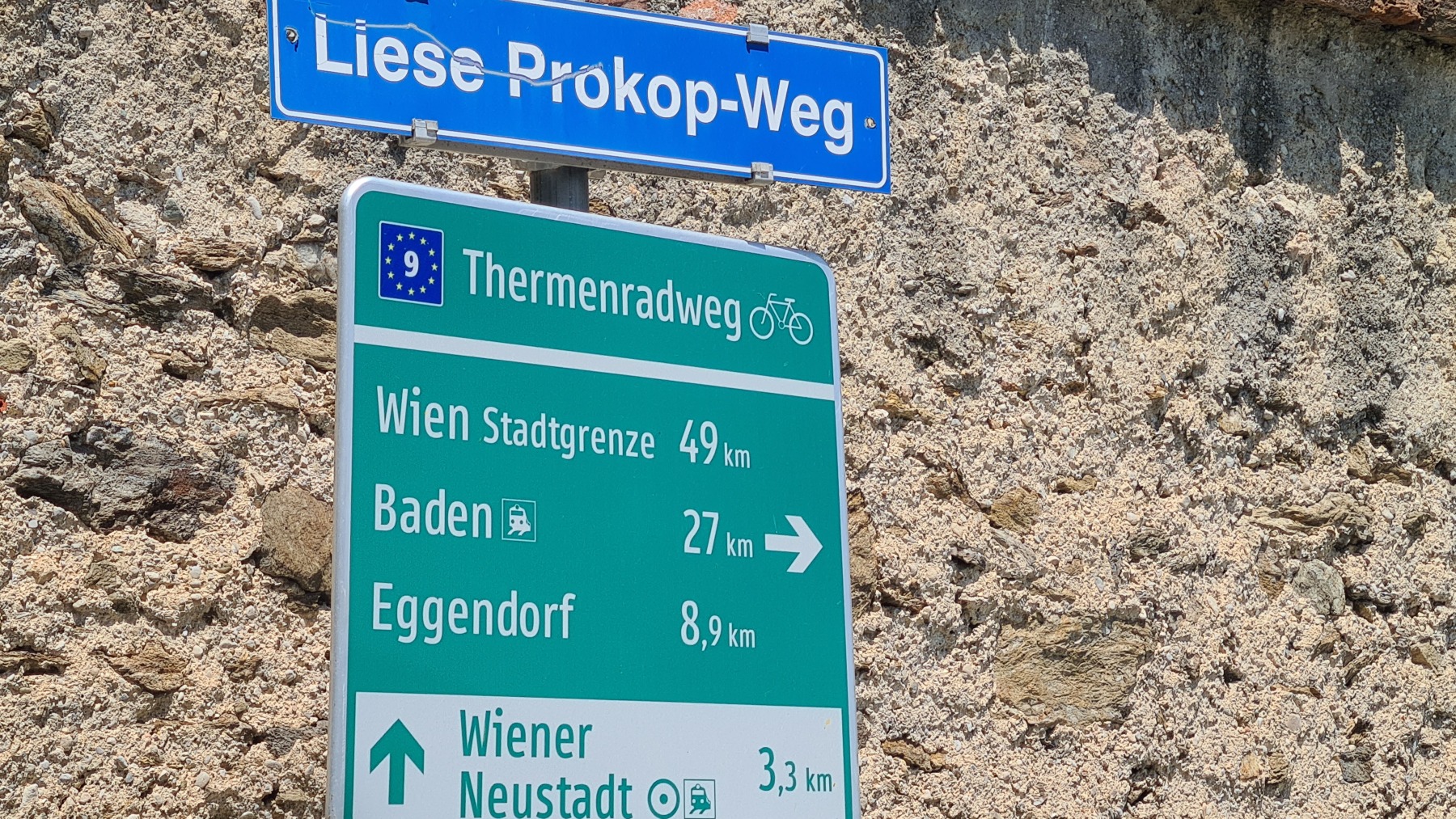 Après une courte descente/montée nous avons quitté les Alpes en descendant du Wechsel pour rejoindre la plaine qui va nous mener à Vienne. Nous avons quitté Eurovelo 9 (toujours aussi bien aménagée et balisée) pour aller déjeuner à Wiener Neustadt et nous avons pu constater que l’itinéraire pour aller en ville puis rejoindre Eurovelo 9 depuis la ville est balisé !