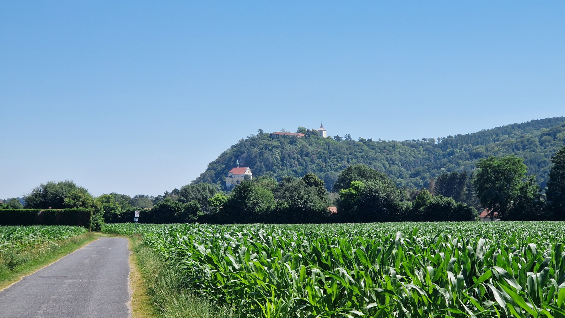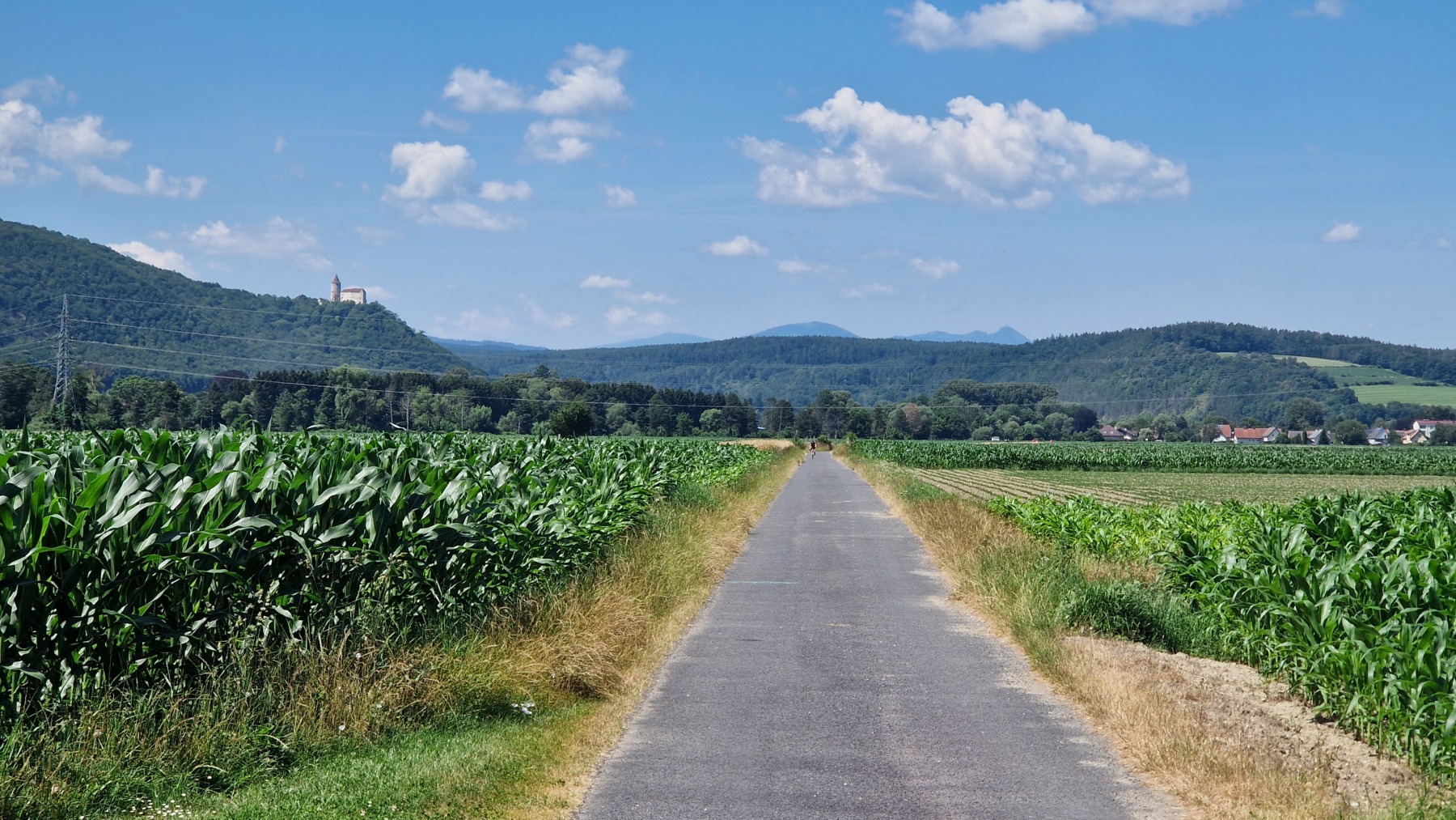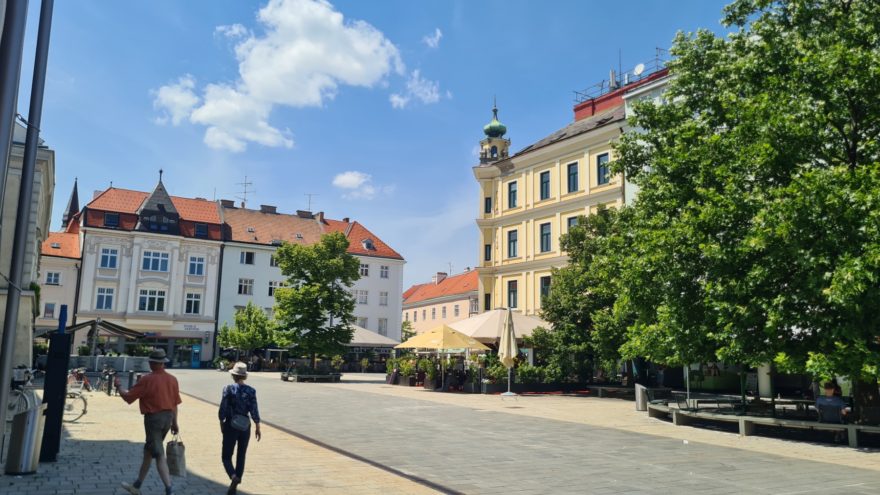 Après une courte descente/montée nous avons quitté les Alpes en descendant du Wechsel pour rejoindre la plaine qui va nous mener à Vienne. Nous avons quitté Eurovelo 9 (toujours aussi bien aménagée et balisée) pour aller déjeuner à Wiener Neustadt et nous avons pu constater que l’itinéraire pour aller en ville puis rejoindre Eurovelo 9 depuis la ville est balisé !