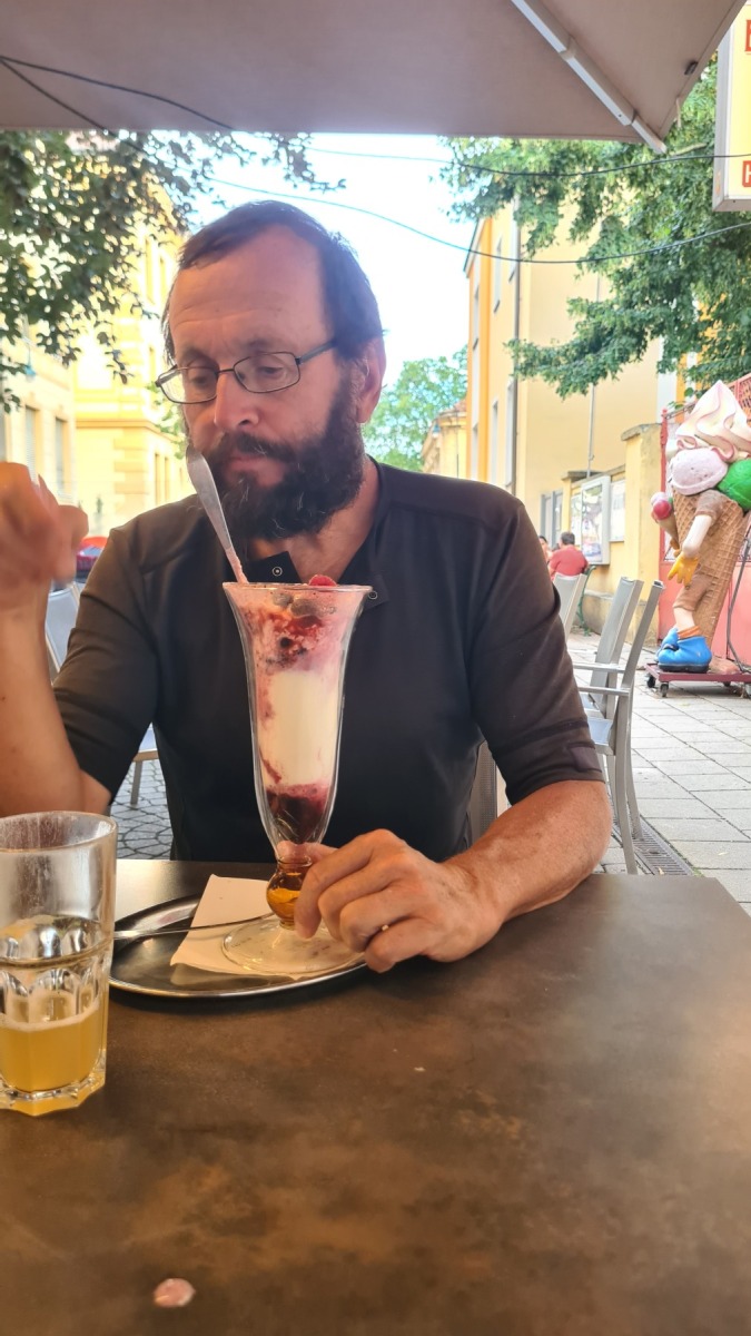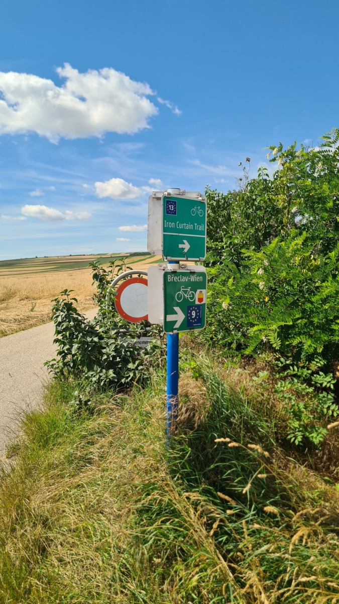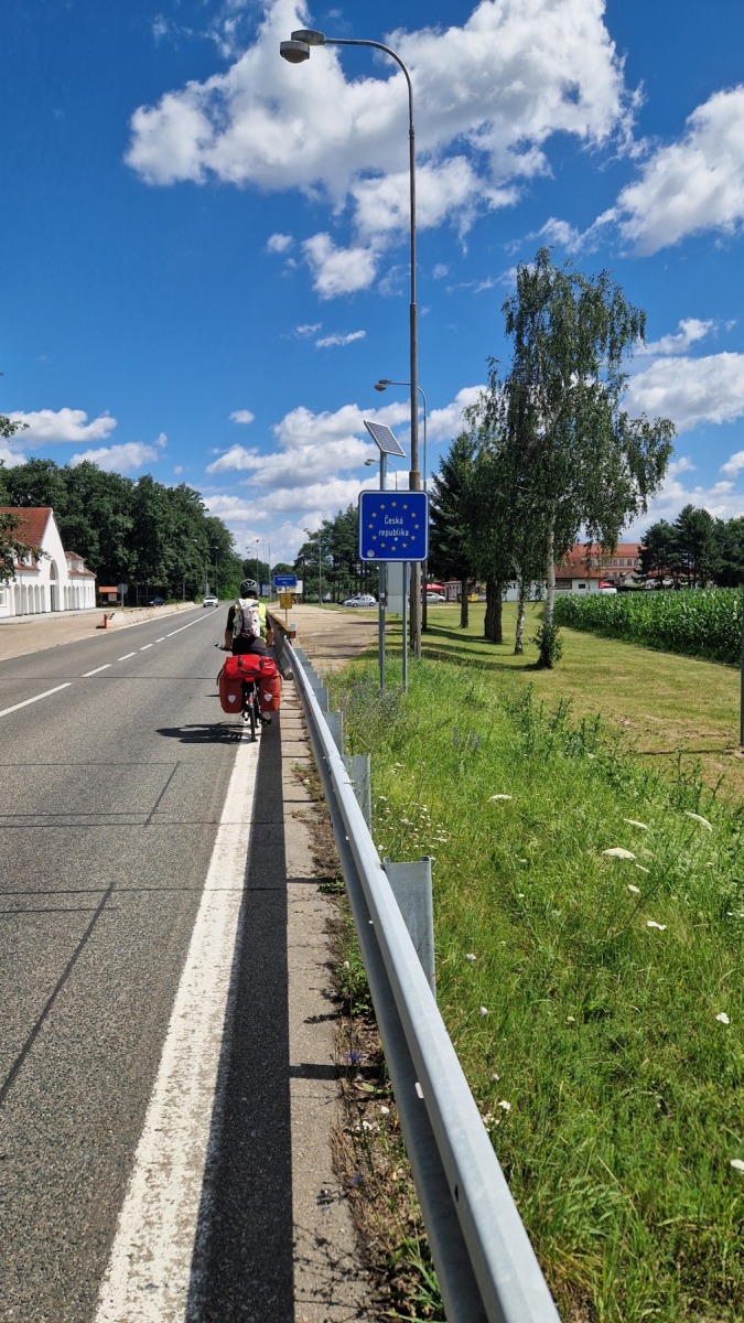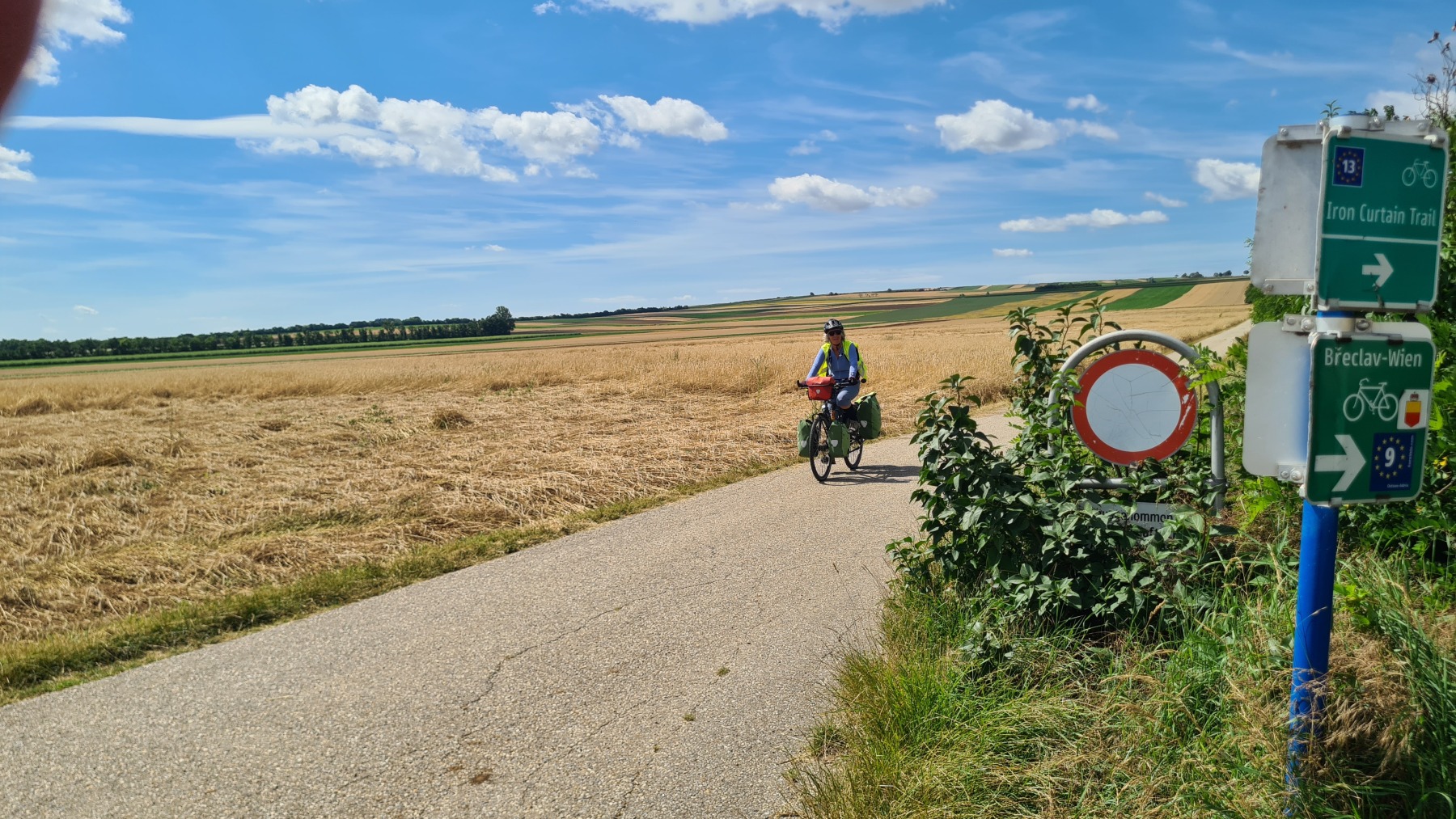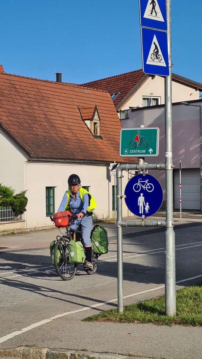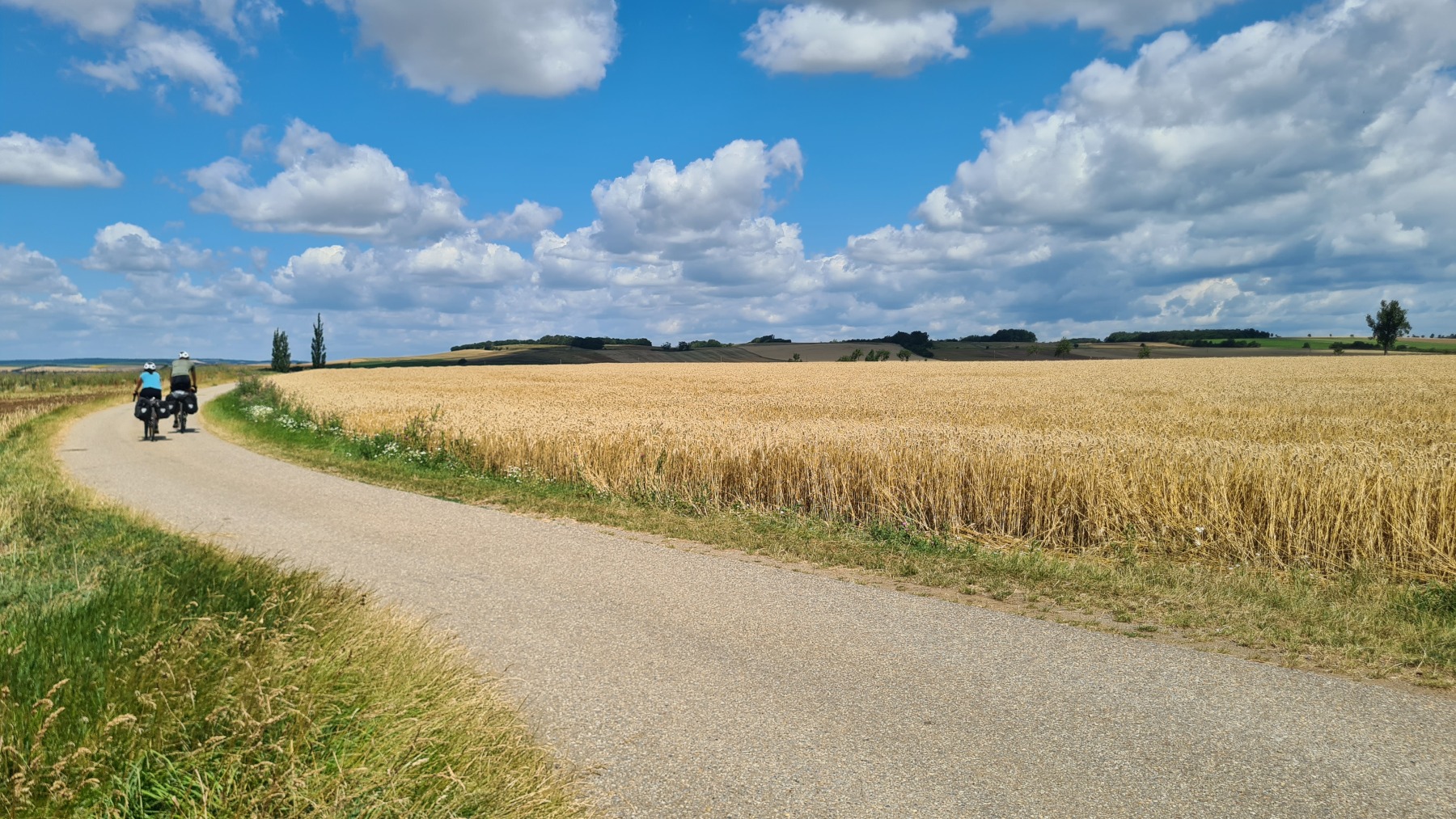 Hier soir nous avons pris notre dernier diner autrichien dans un café bien sympathique. Ce matin nous sommes partis de bonne heure et avons pris notre petit déjeuner en route. Le relief est agréablement vallonné et nous avons à nouveau progressé dans les champs de tournesol, de blé, de courges et aussi de millet. Il y a beaucoup d’arbres fruitiers au bord de la piste et nous avons pu ramasser des pommes, des cerises et des prunes.