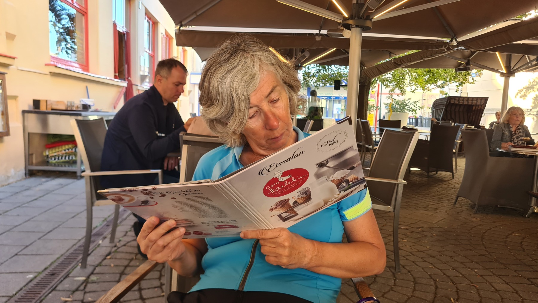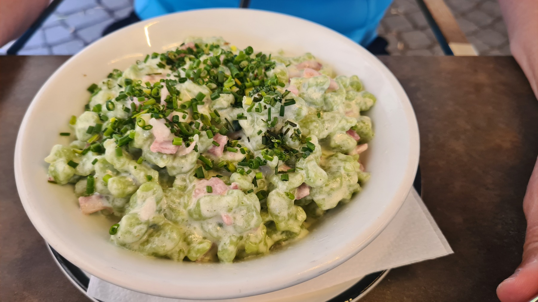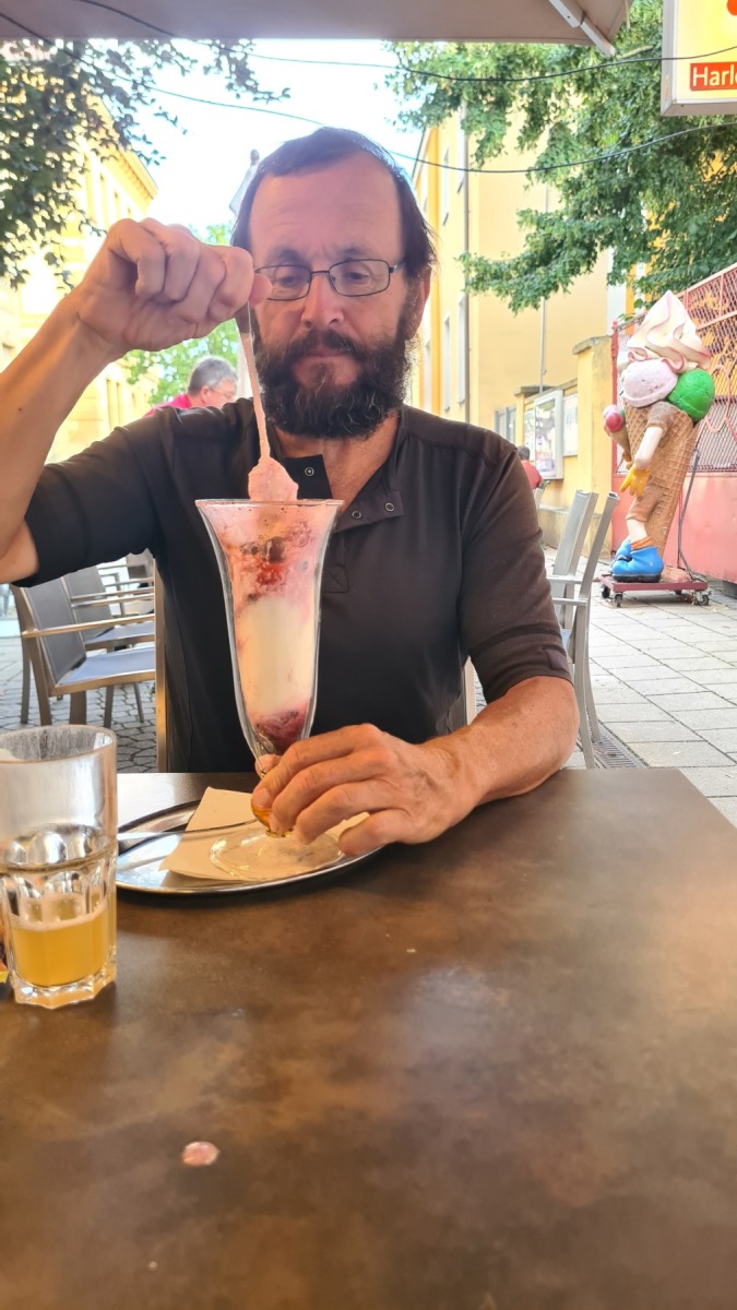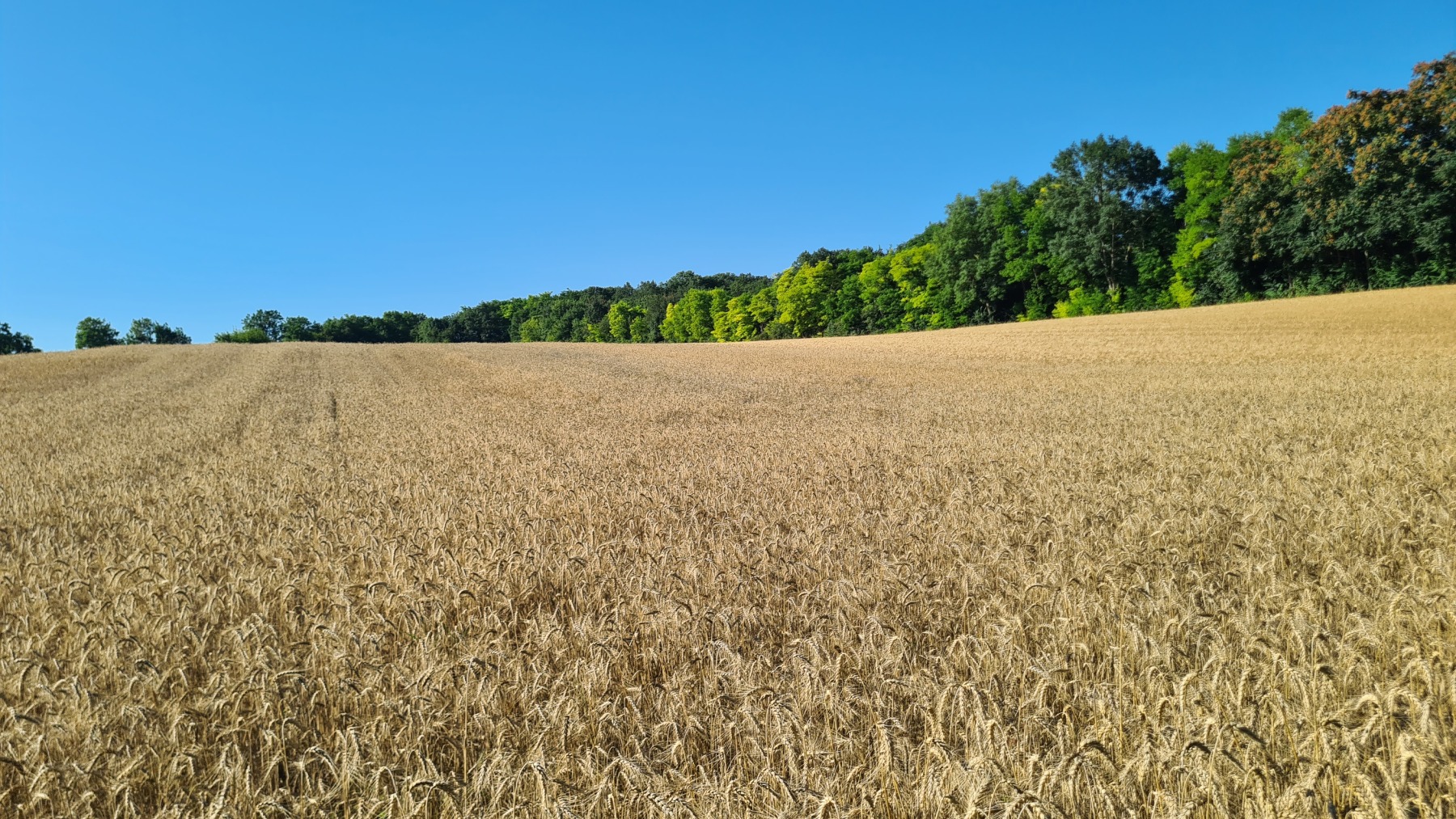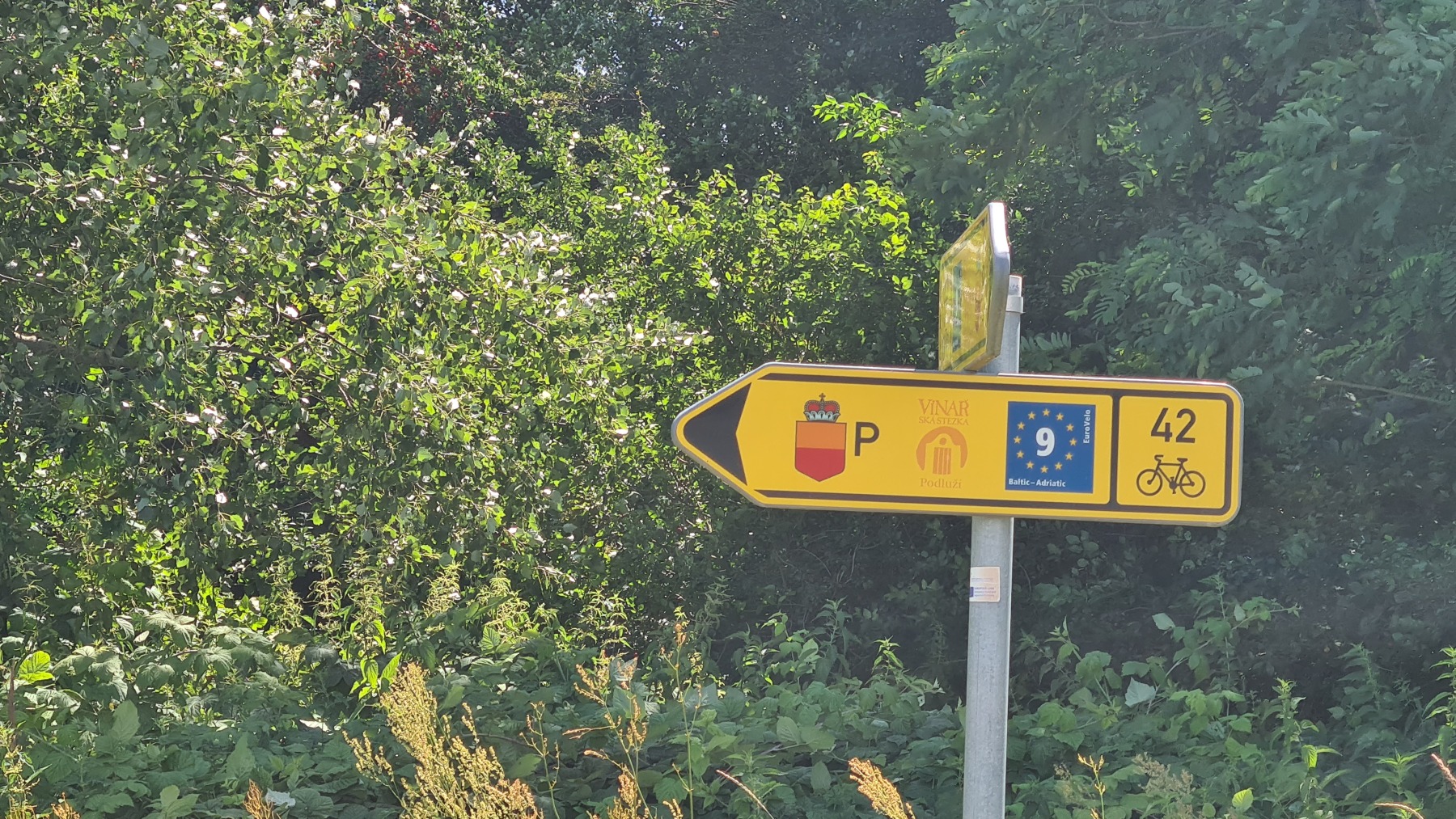 Hier soir nous avons pris notre dernier diner autrichien dans un café bien sympathique. Ce matin nous sommes partis de bonne heure et avons pris notre petit déjeuner en route. Le relief est agréablement vallonné et nous avons à nouveau progressé dans les champs de tournesol, de blé, de courges et aussi de millet. Il y a beaucoup d’arbres fruitiers au bord de la piste et nous avons pu ramasser des pommes, des cerises et des prunes.