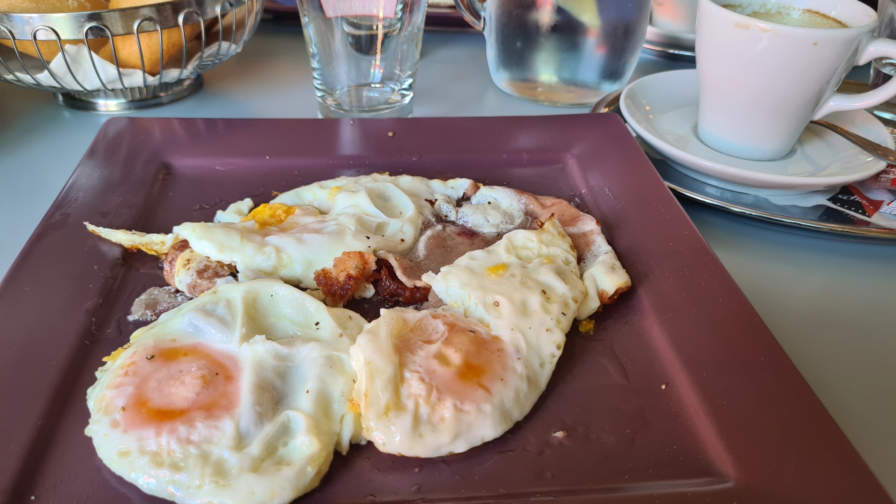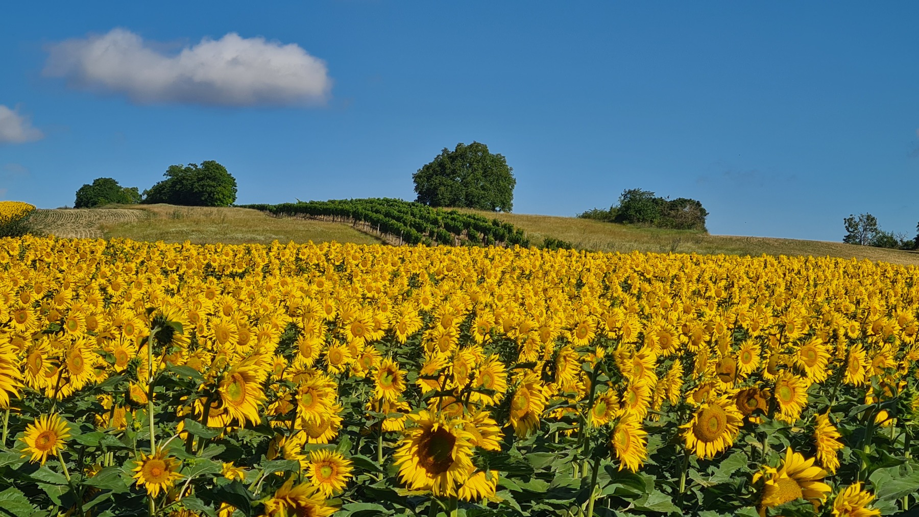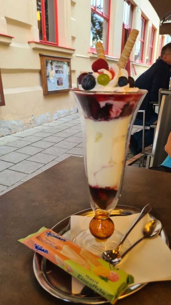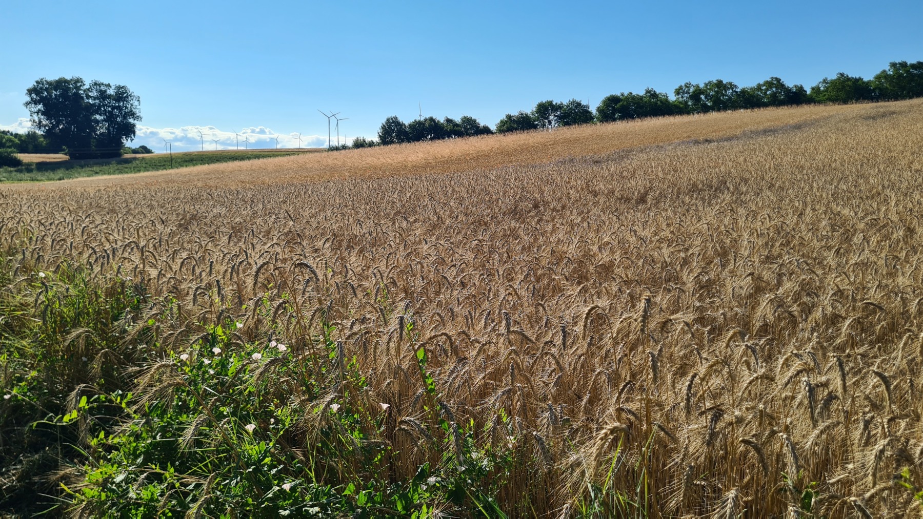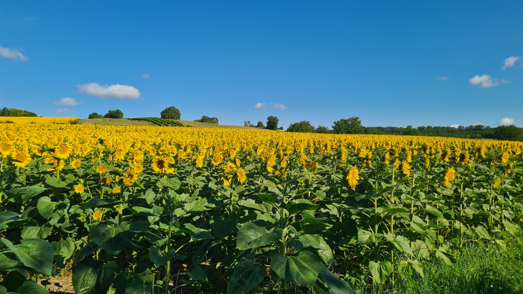 Hier soir nous avons pris notre dernier diner autrichien dans un café bien sympathique. Ce matin nous sommes partis de bonne heure et avons pris notre petit déjeuner en route. Le relief est agréablement vallonné et nous avons à nouveau progressé dans les champs de tournesol, de blé, de courges et aussi de millet. Il y a beaucoup d’arbres fruitiers au bord de la piste et nous avons pu ramasser des pommes, des cerises et des prunes.