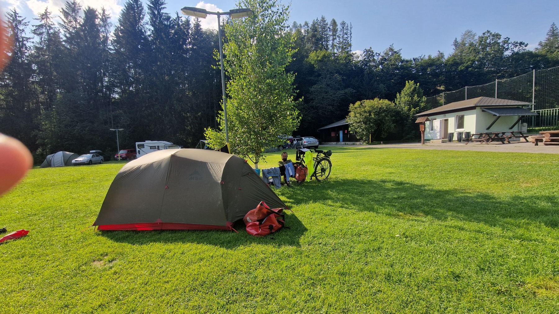 Ce soir nous avons planté la tente dans le camping de Sloup où la chaleur commence à se dissiper (il a fait 32° cet après midi) maintenant que le soleil a disparu derrière les arbres qui bordent de camping.