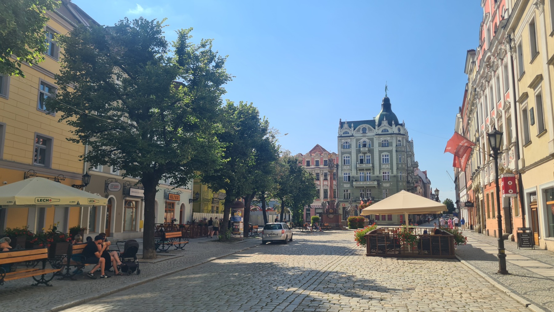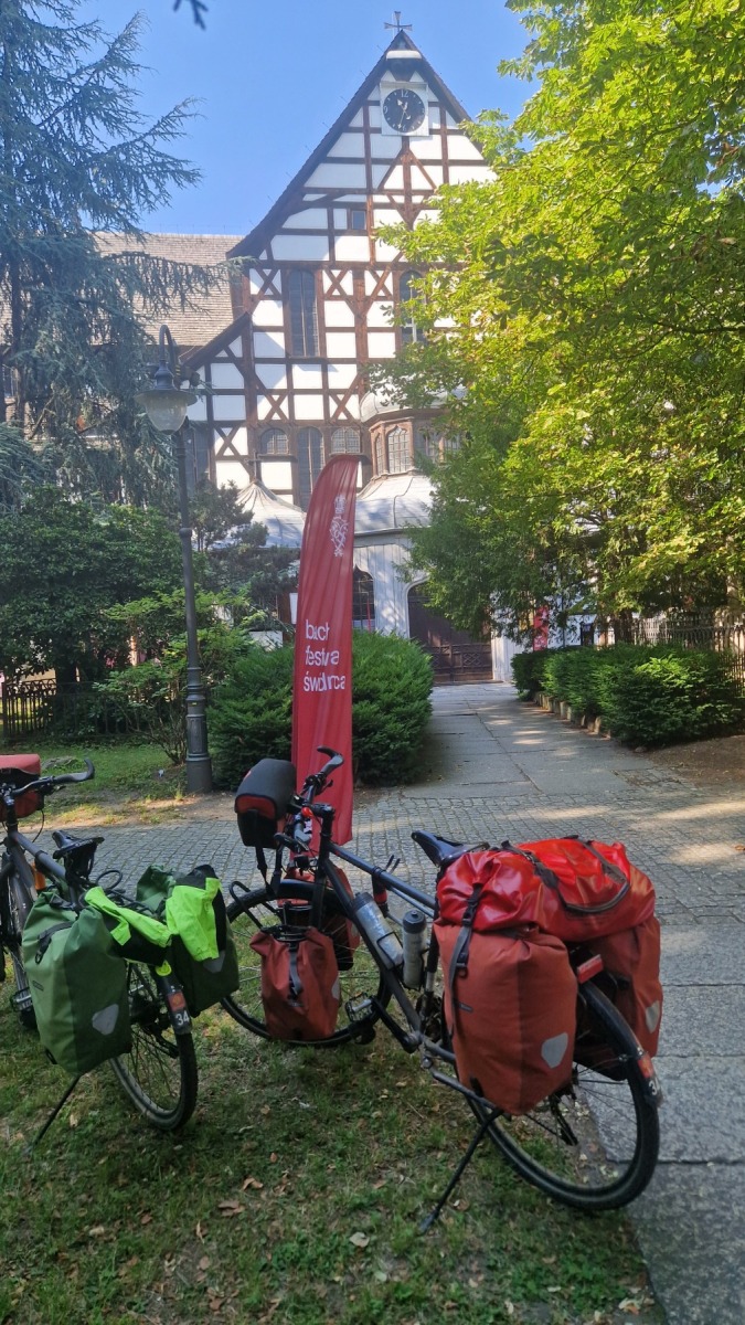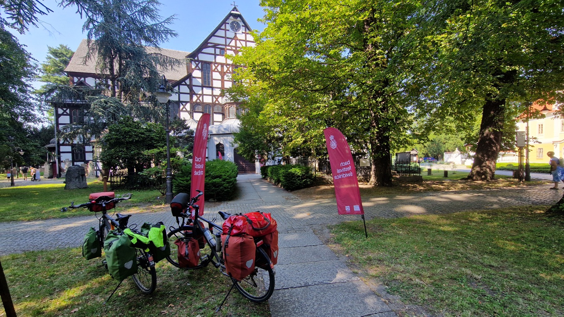 Nous avons rejoint Eurovelo 9 à une grosse dizaine de kilomètres de Złoty Stok et l’avons suivi jusqu’à Świdnica où nous passons la nuit. Le parcours est agréable, alternant petites routes plus ou moins fréquentées et chemins de terre ou de graviers plus ou moins défoncés.