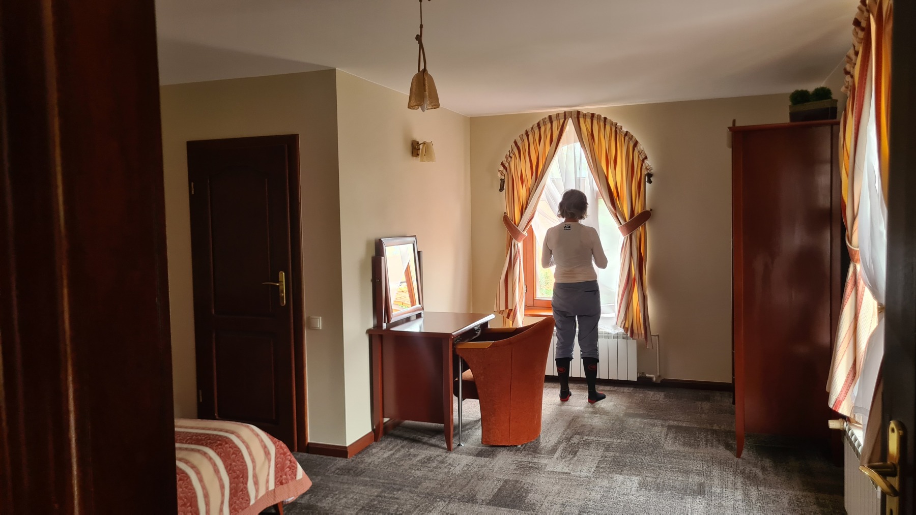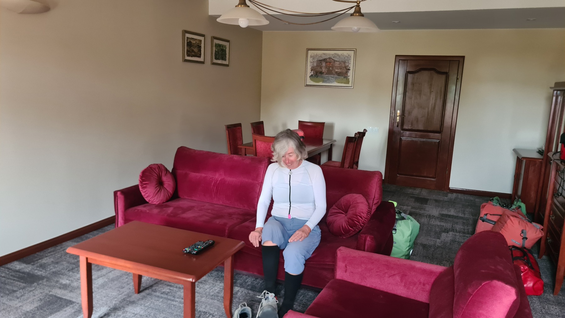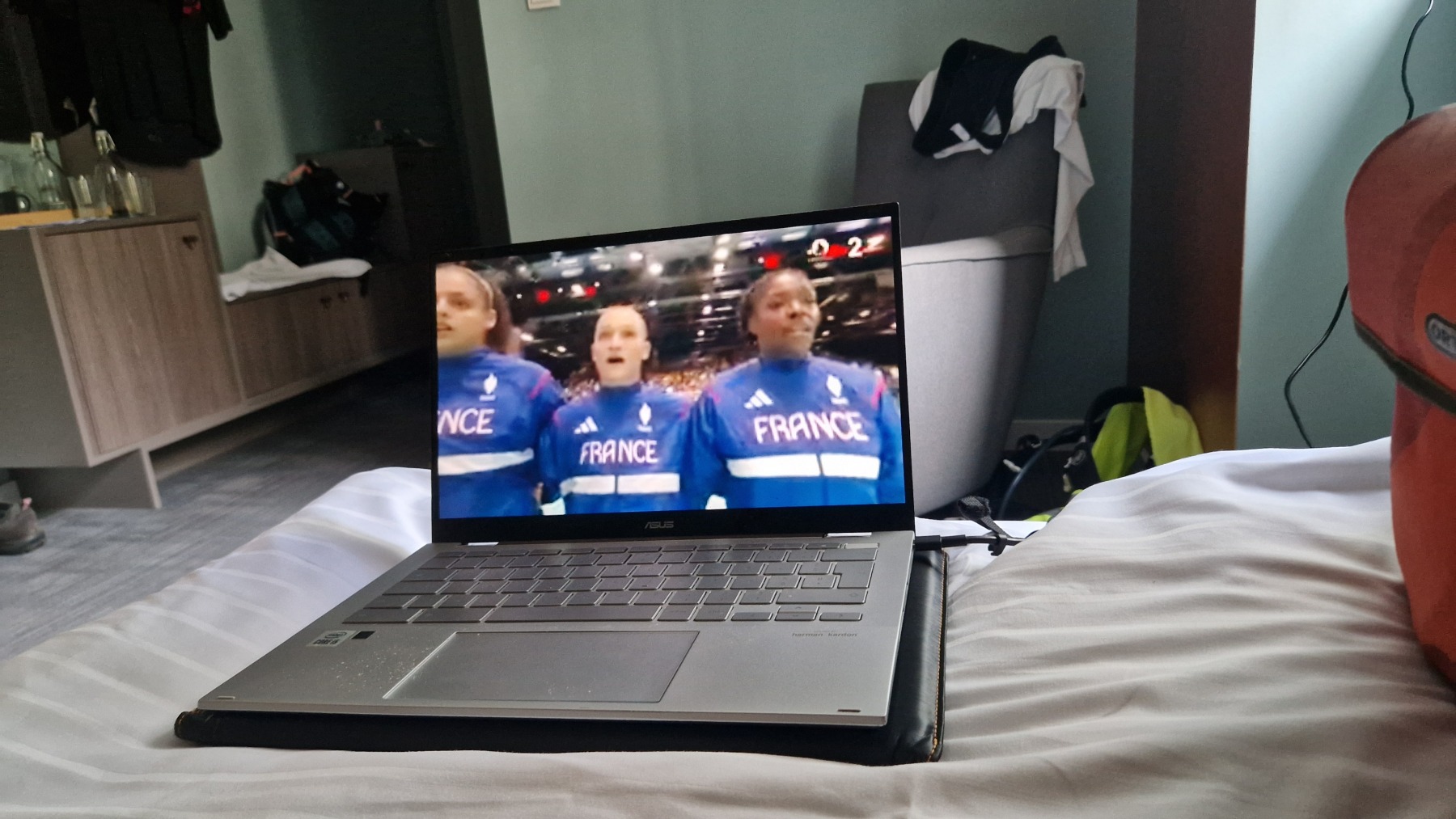 Hier soir nous avons regardé la première mi-temps de l’entrée en lice de l’équipe féminine de handball dans notre chambre à la décoration « Narcisse » avant de prendre un diner plus frugal que le déjeuner.