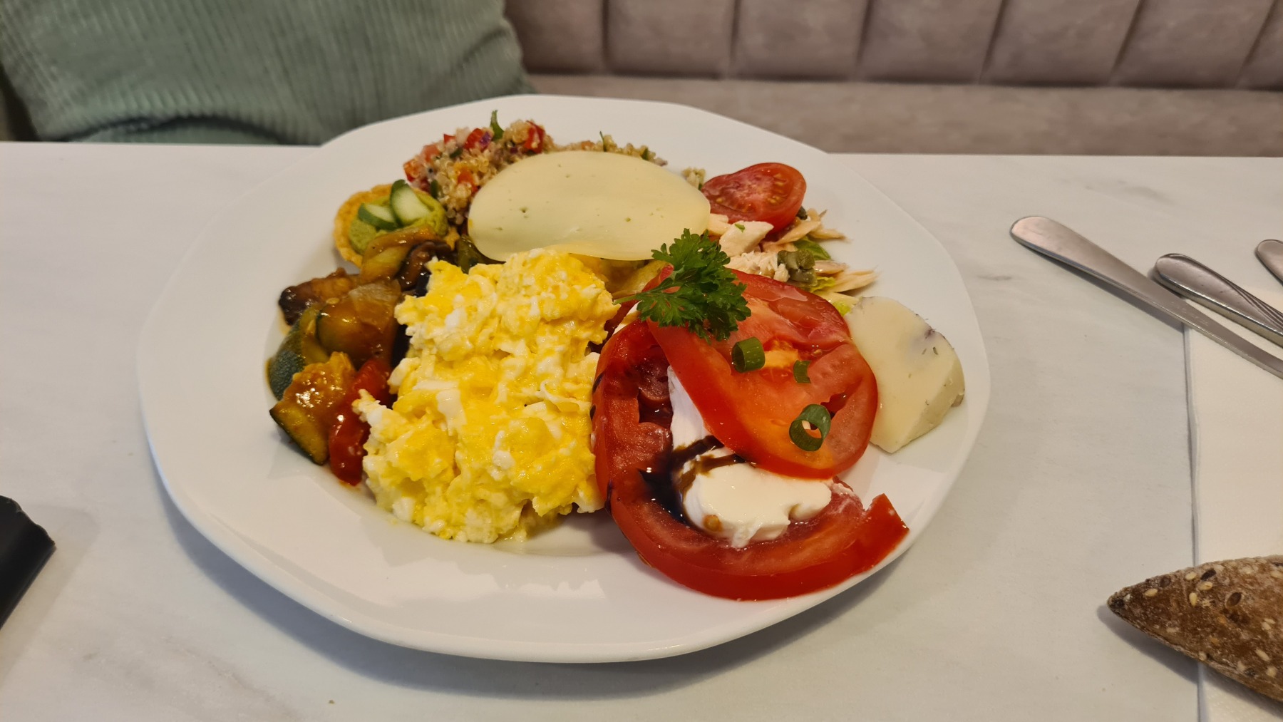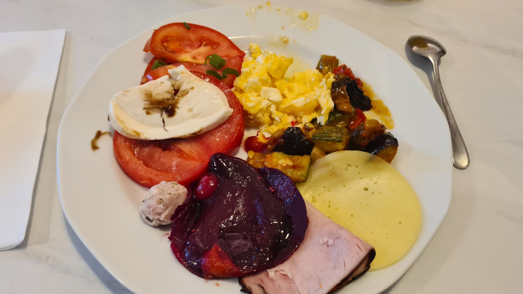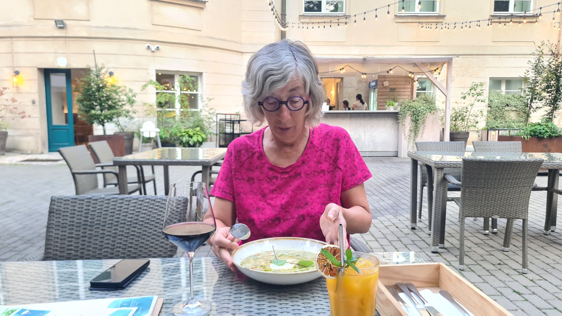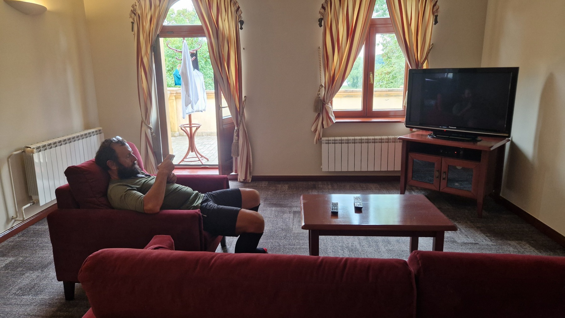 Hier soir nous avons regardé la première mi-temps de l’entrée en lice de l’équipe féminine de handball dans notre chambre à la décoration « Narcisse » avant de prendre un diner plus frugal que le déjeuner.