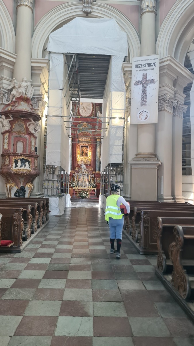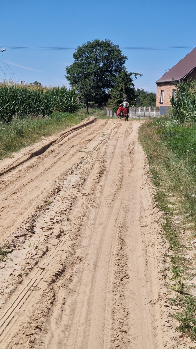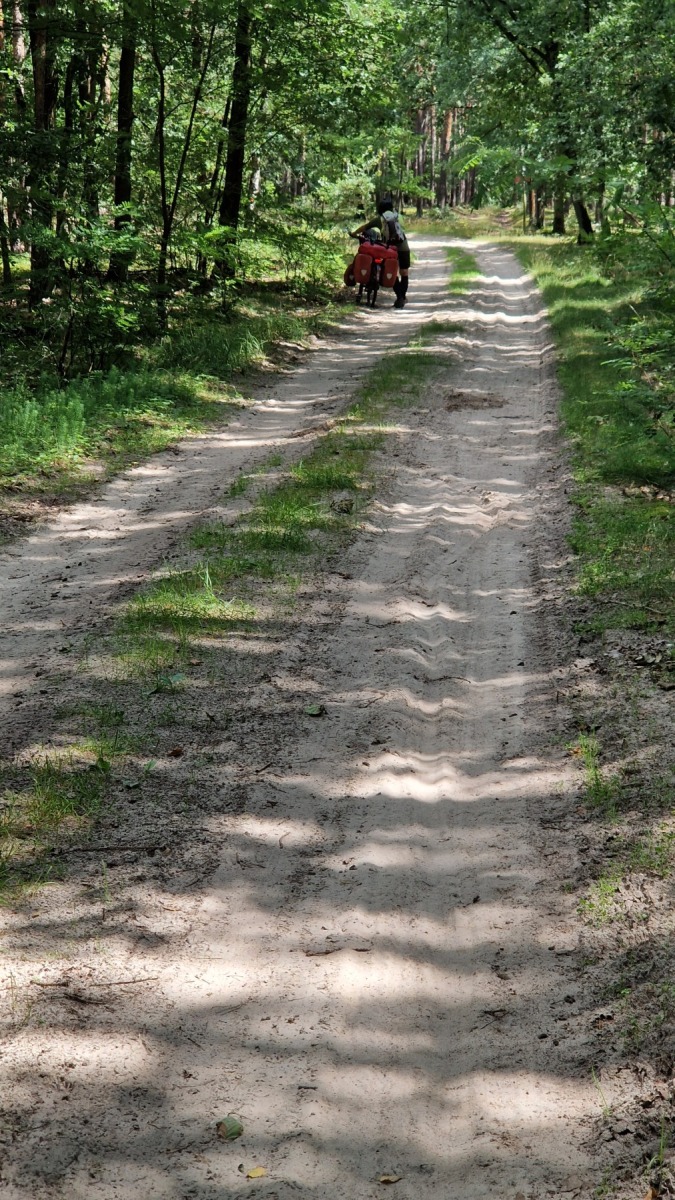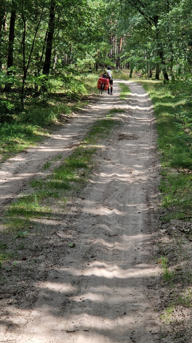 Nous avons quitté Eurovelo 9 au niveau de la basilique de Sainte-Colline (devant laquelle nous avons fait une pause) pour rejoindre notre hôtel à Dolsk et les choses sont devenues plus intéressantes et plus éprouvantes. Le terrain est très sablonneux, c’est bien visibles dans les champs qui viennent d’être labourés et aussi sur les pistes que bous nous avons emprunté et il nous a fallu fréquemment pousser les vélos. Par contre les forêts que nous avons traversé sont bien agréables.