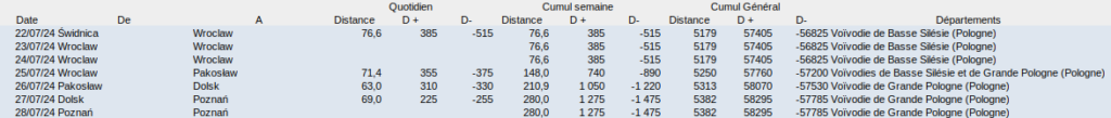Quatre jours de vélo et trois jours de repos à Wroclaw et Poznań (en vert) pour cette semaine qui nous amène à une latitude proche de celles de Berlin et Amsterdam.