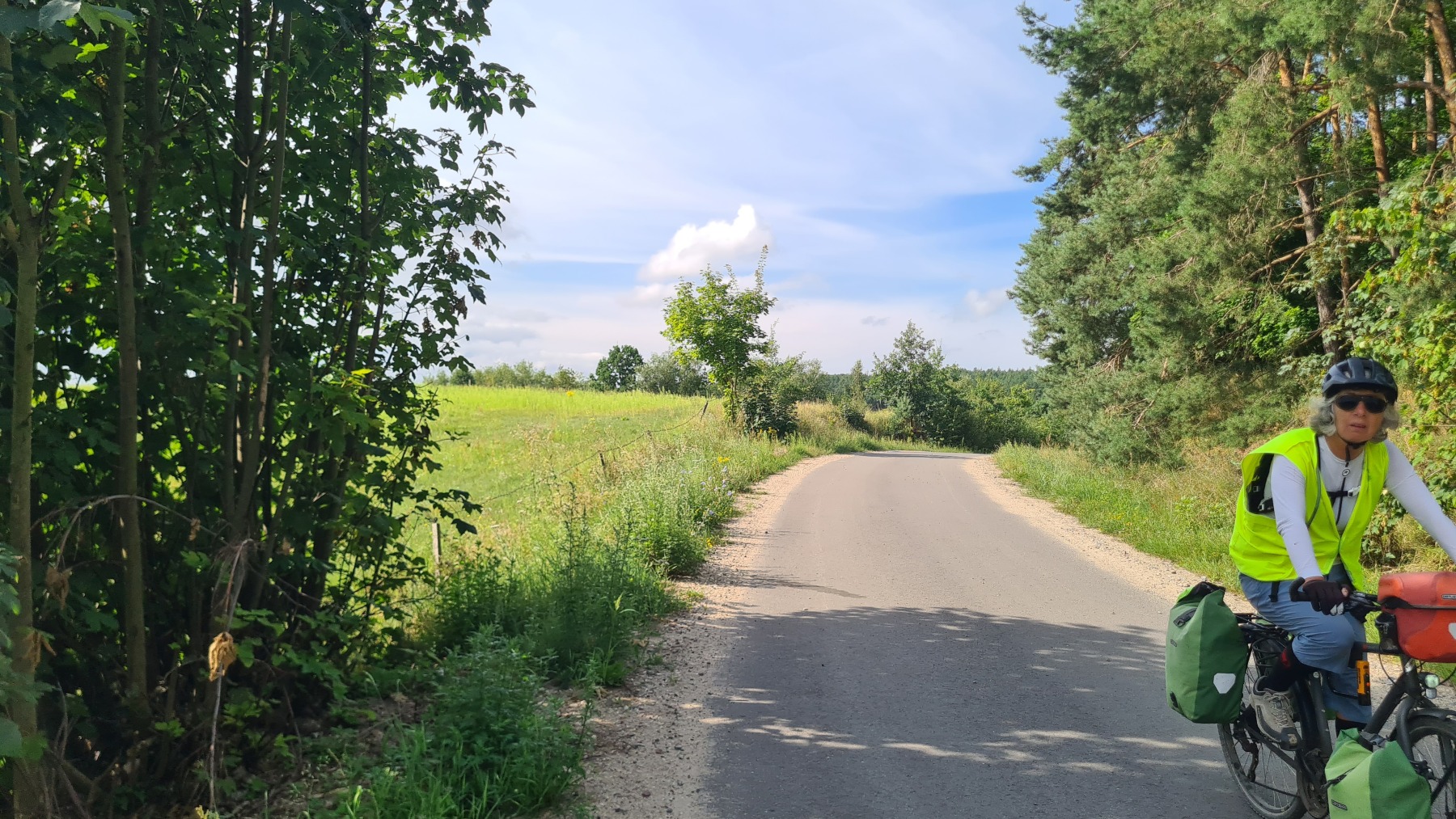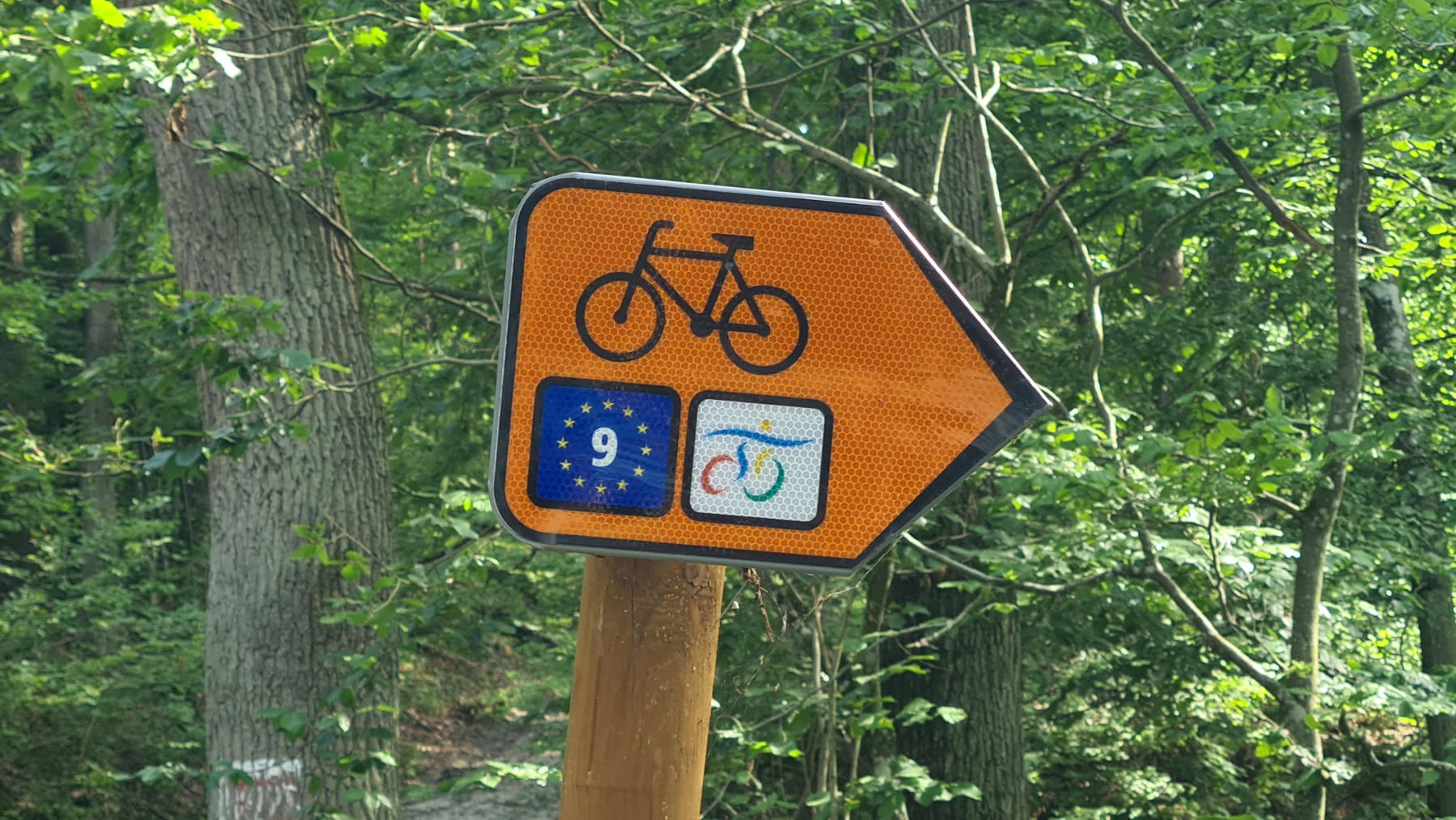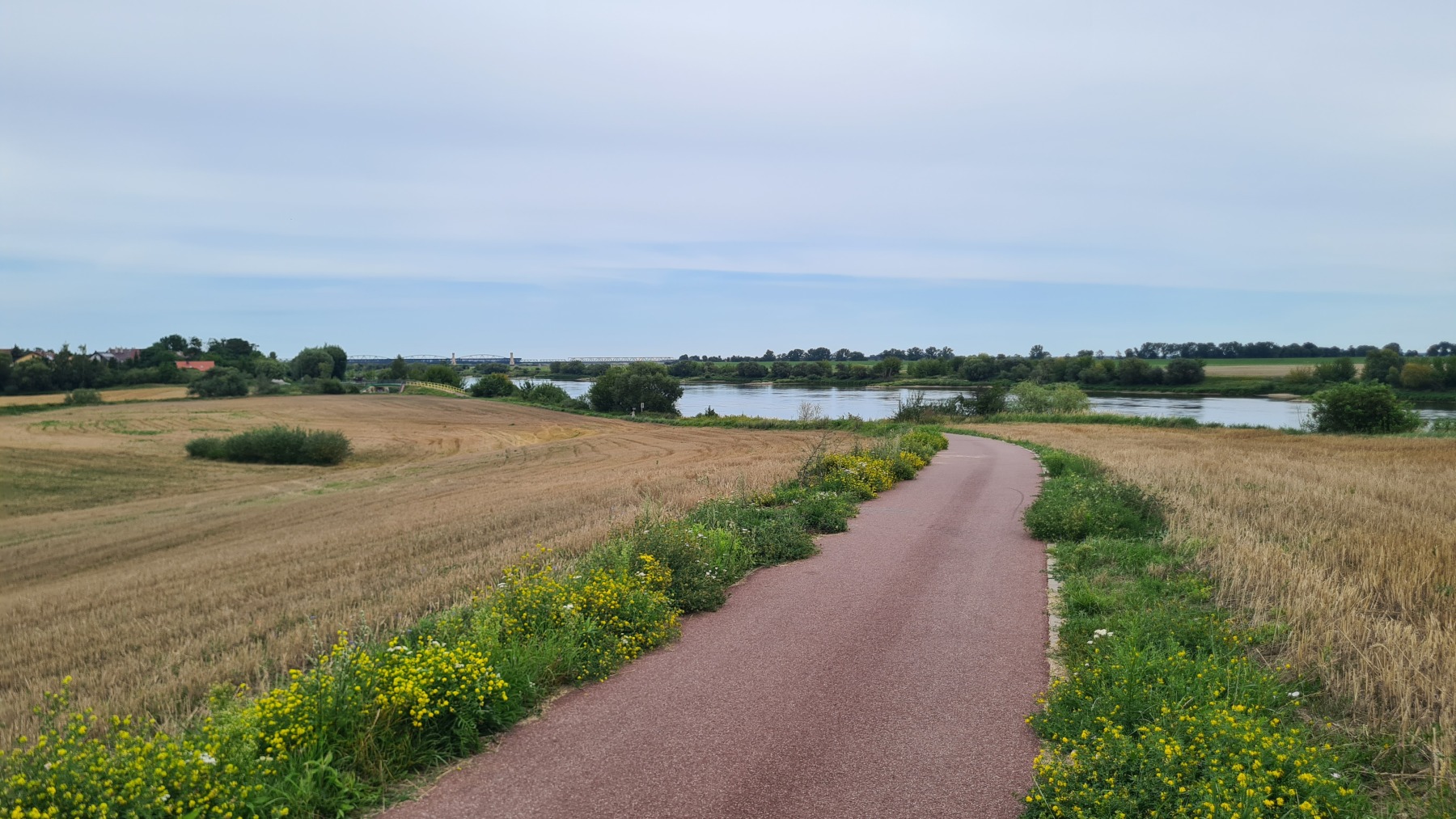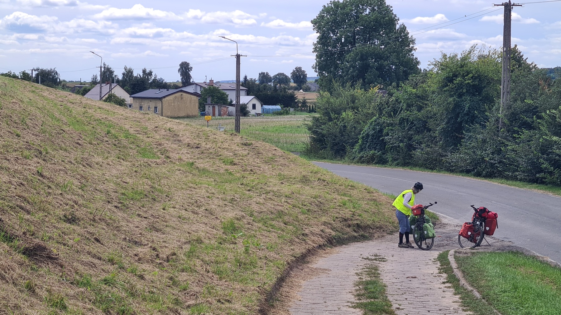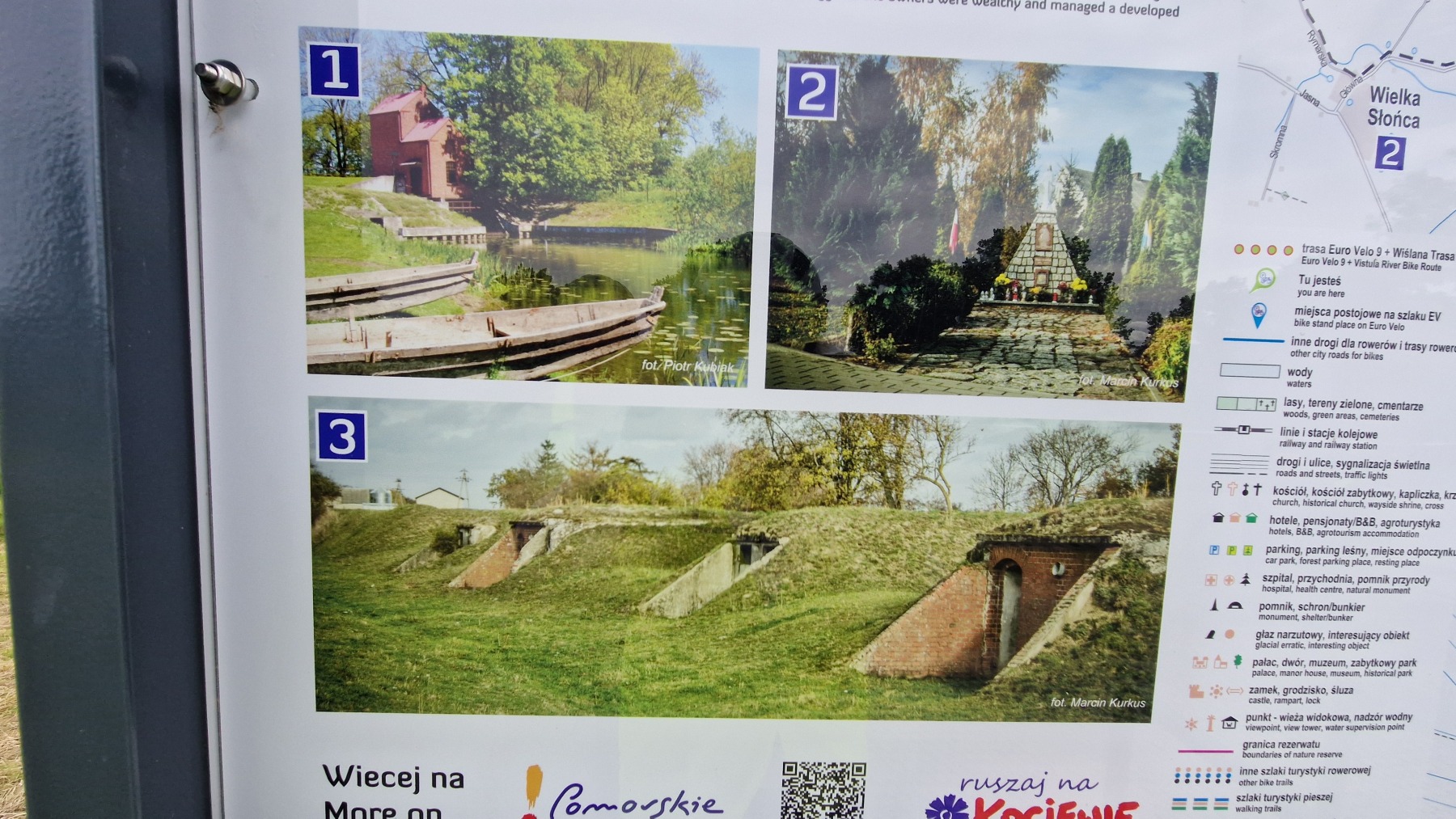 Ce matin nous avons commencé par aller voir le point de vue sur la Vistule qui nous avait été conseillée hier. Les 10 premiers kilomètres de l’étape sur Eurovelo 9 a été bien pénible, sur des pistes mêlant graviers, cailloux et sable. La fin de la galère s’est matérialisée, au beau milieu de la forêt, par une balise Eurovélo 9, avec sa couronne d’étoiles européenne, la première depuis la frontière polonaise et la piste caillouteuse s’est transformée en une vraie piste cyclable goudronnée : nous venions d’atteindre la voïvodie de Poméranie qui semble beaucoup plus soucieuse d’ Eurovelo 9 que la voïvodie de Couïavie-Poméranie que nous venions de quitter.