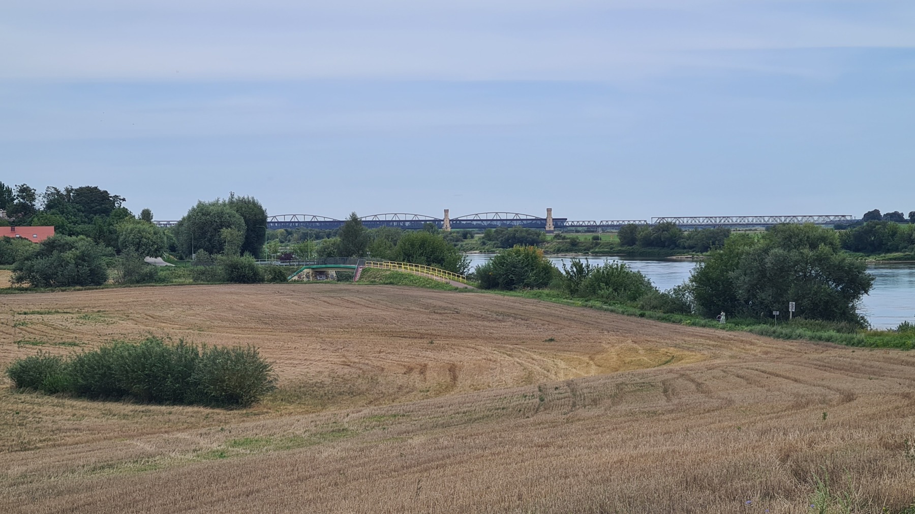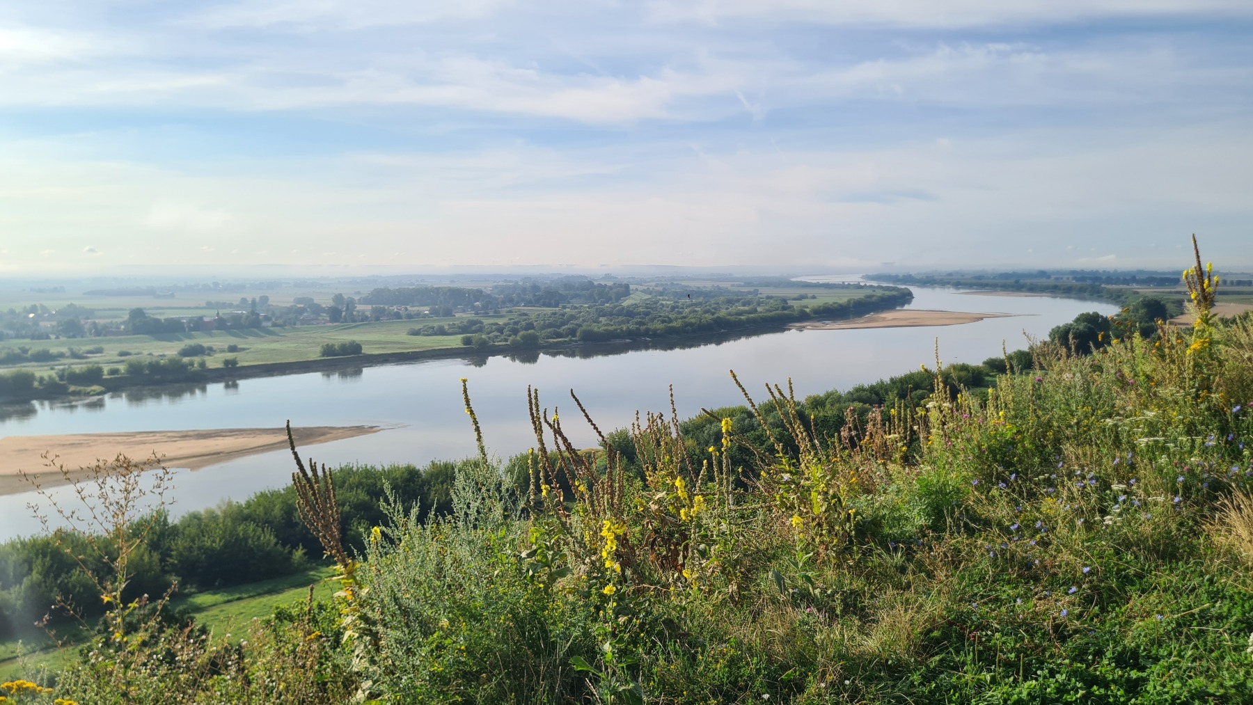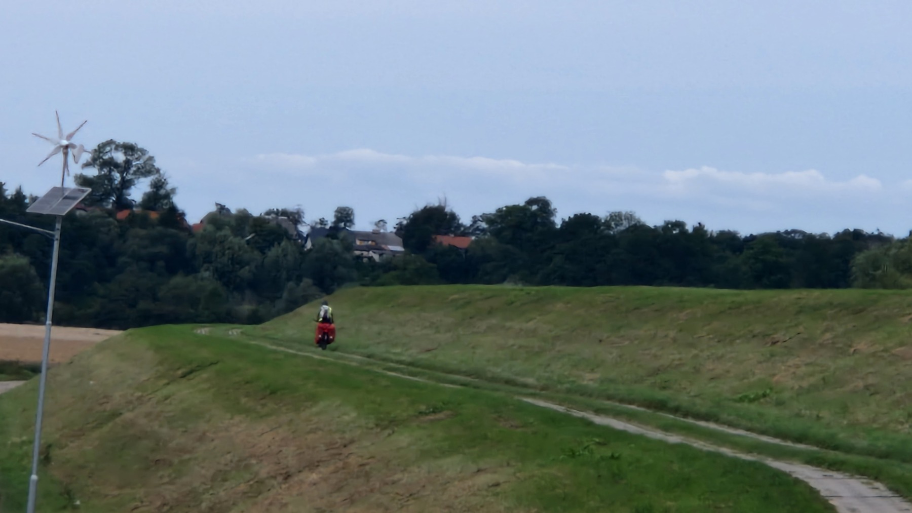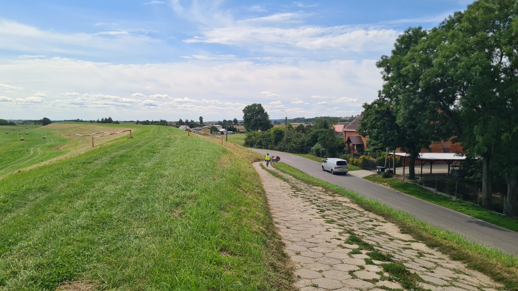 Ce matin nous avons commencé par aller voir le point de vue sur la Vistule qui nous avait été conseillée hier. Les 10 premiers kilomètres de l’étape sur Eurovelo 9 a été bien pénible, sur des pistes mêlant graviers, cailloux et sable. La fin de la galère s’est matérialisée, au beau milieu de la forêt, par une balise Eurovélo 9, avec sa couronne d’étoiles européenne, la première depuis la frontière polonaise et la piste caillouteuse s’est transformée en une vraie piste cyclable goudronnée : nous venions d’atteindre la voïvodie de Poméranie qui semble beaucoup plus soucieuse d’ Eurovelo 9 que la voïvodie de Couïavie-Poméranie que nous venions de quitter.