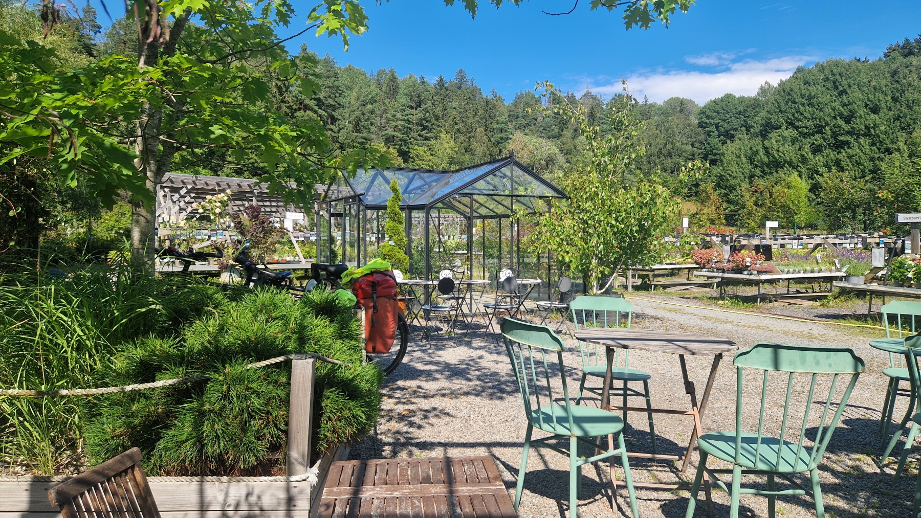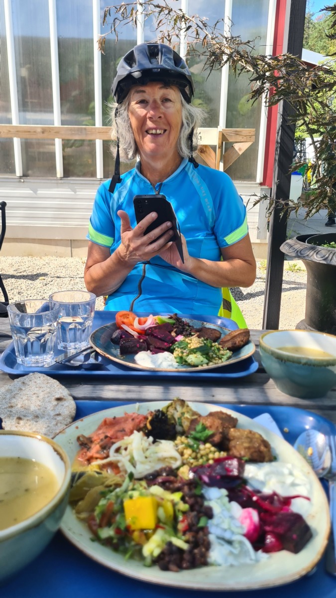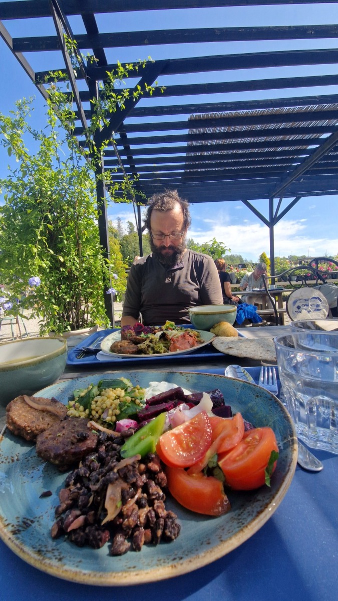 Nous avons pu apprécier les pistes cyclables suédoises dès la descente du ferry. Nous sommes sortis de Nynäshamn et après quelques kilomètres nous avons cherché un restaurant. OpenStreetMap en indiquait un à proximité de notre chemin mais quand nous sommes arrivés à l’endroit indiqué nous nous sommes trouvés devant un magasin de jardinage. Un peu dépité, je suis tout de même allé demander si on pouvait déjeuner et la caissière m’a dit de rentrer dans la cour du magasin et de suivre un chemin au milieu des arbustes en vente avec nos vélo. Nous y avons trouvé, installé dans une serre, un petit restaurant en libre service avec un buffet plein de bonnes choses.