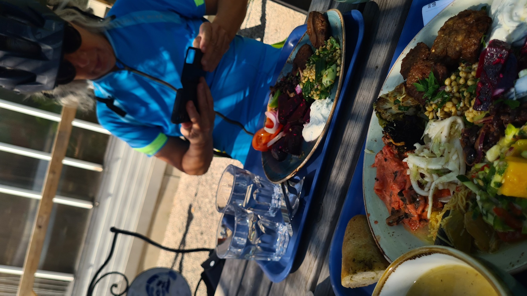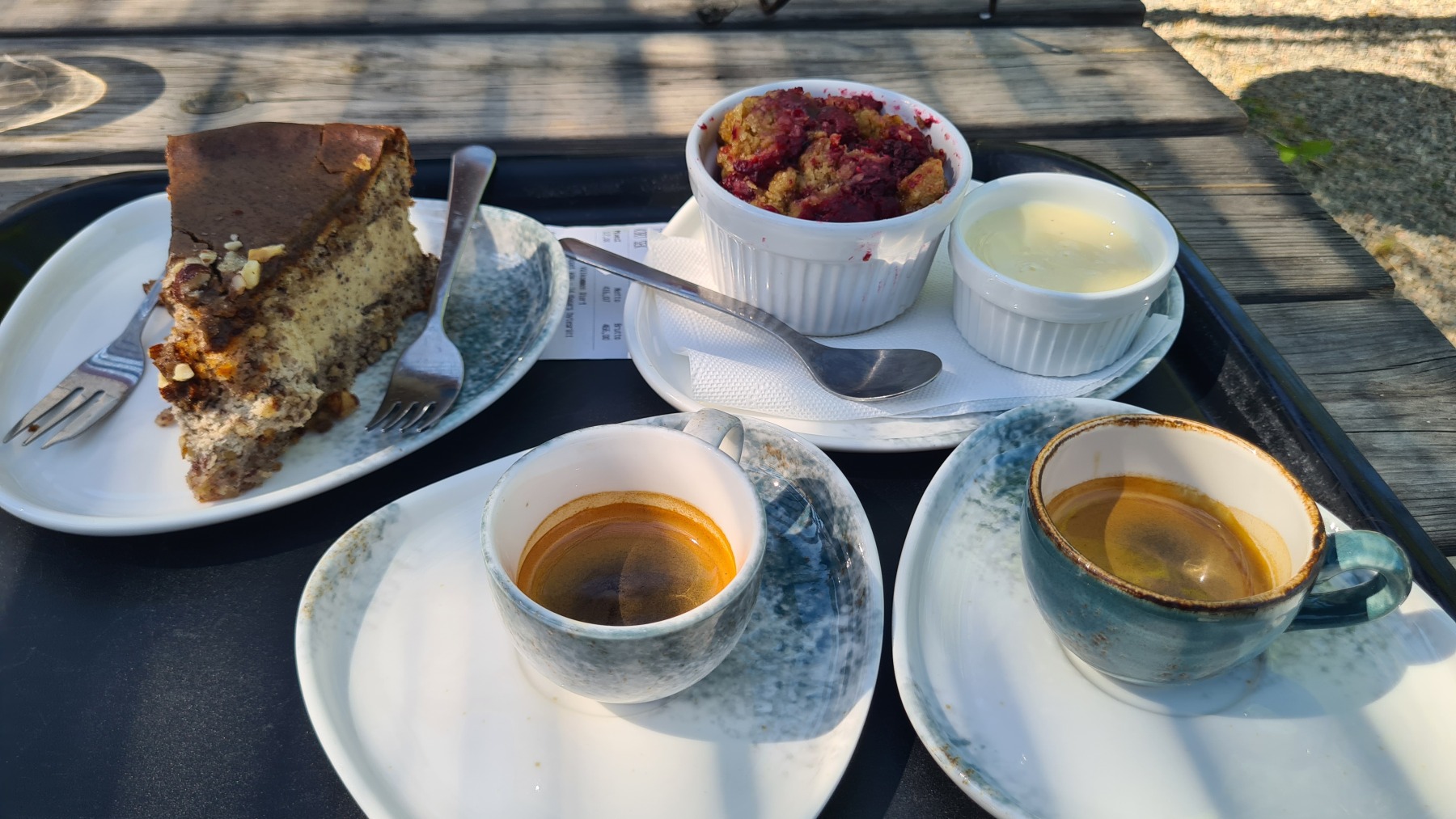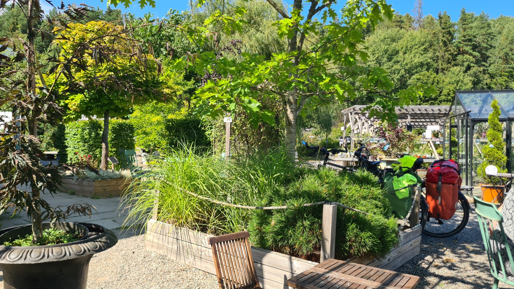 Nous avons pu apprécier les pistes cyclables suédoises dès la descente du ferry. Nous sommes sortis de Nynäshamn et après quelques kilomètres nous avons cherché un restaurant. OpenStreetMap en indiquait un à proximité de notre chemin mais quand nous sommes arrivés à l’endroit indiqué nous nous sommes trouvés devant un magasin de jardinage. Un peu dépité, je suis tout de même allé demander si on pouvait déjeuner et la caissière m’a dit de rentrer dans la cour du magasin et de suivre un chemin au milieu des arbustes en vente avec nos vélo. Nous y avons trouvé, installé dans une serre, un petit restaurant en libre service avec un buffet plein de bonnes choses.