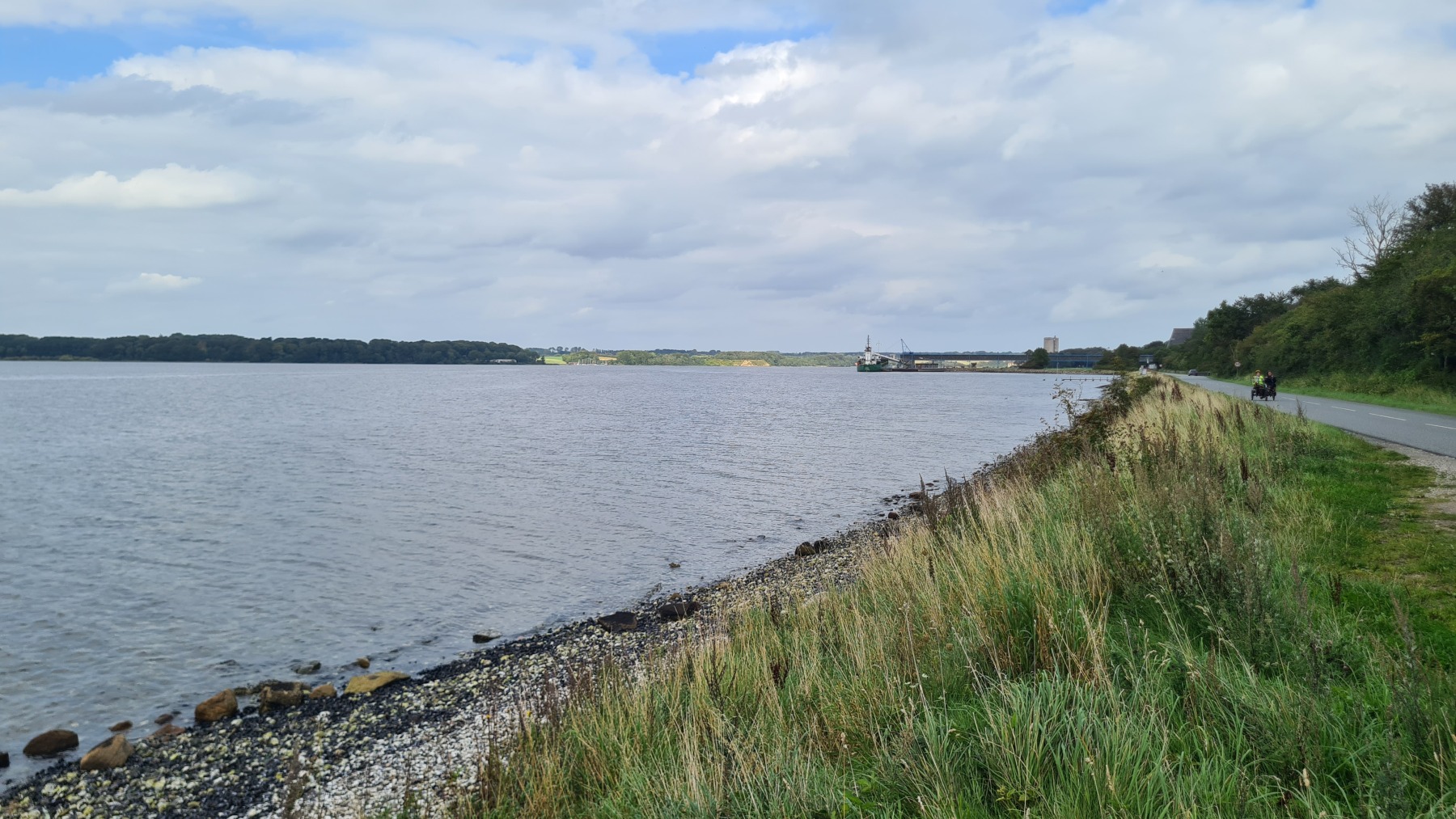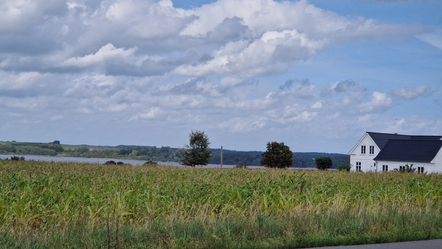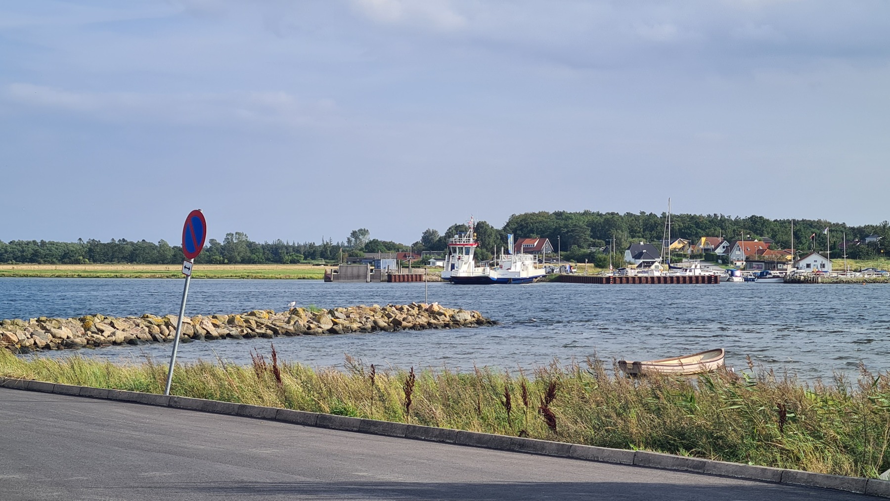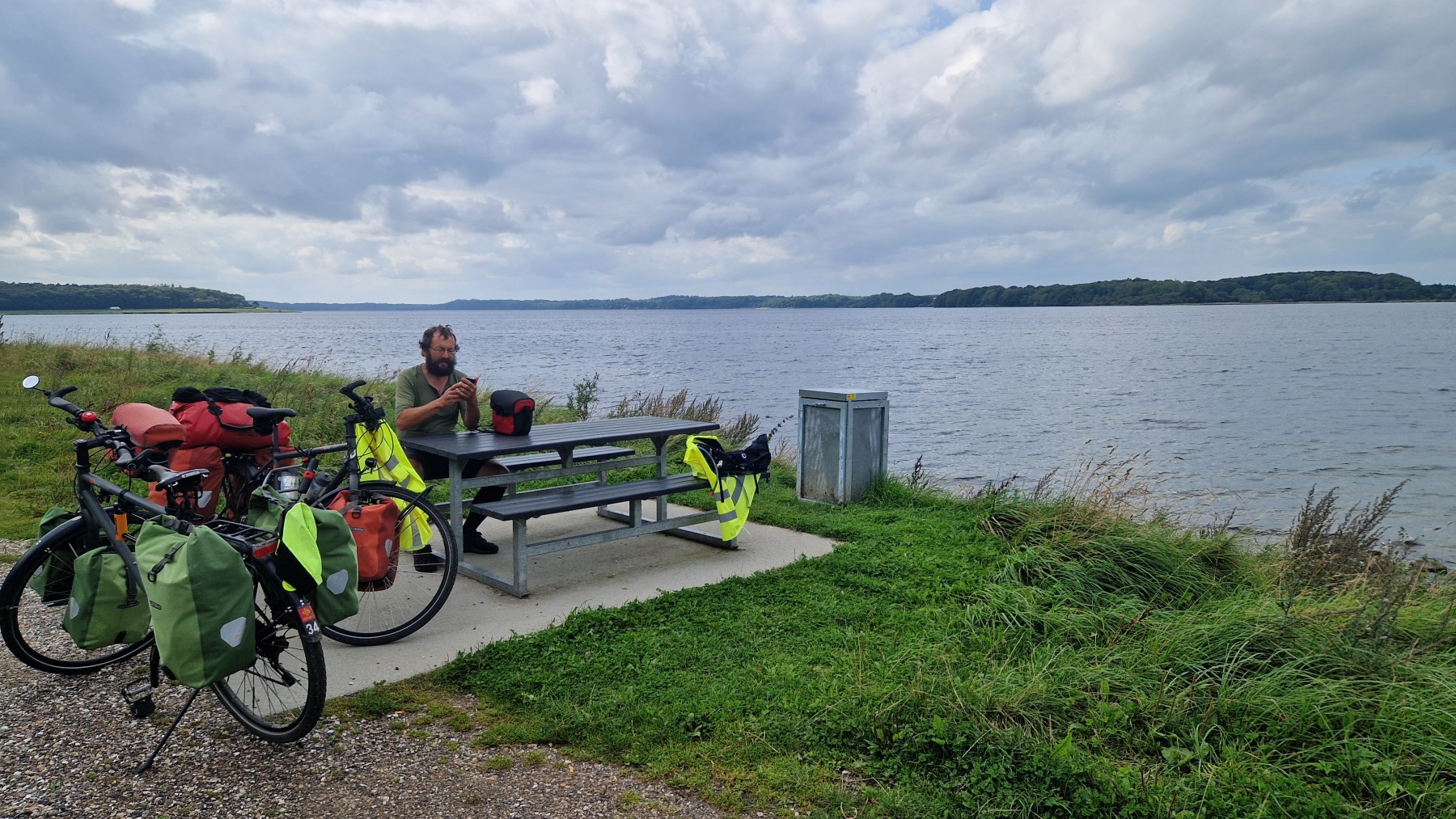 Nous sommes repartis et nous nous sommes installés un peu plus loin en bord du fjord pour chercher un autre hébergement et avons réservé un appartement à quelques mètres du ferry à cable d’Udbyhøj qui nous avait été conseillé ce matin. Nous avons modifié notre itinéraire en conséquence et avons bifurqué sur Eurovelo 12 après avoir quitté la route 32.