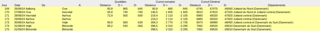 Cinq jours de vélo, un jour de repos à pied à Aarhus (en vert) et un jour de repos à pied et en voiture avec Pierre et Lena (en vert) pour cette semaine danoise.