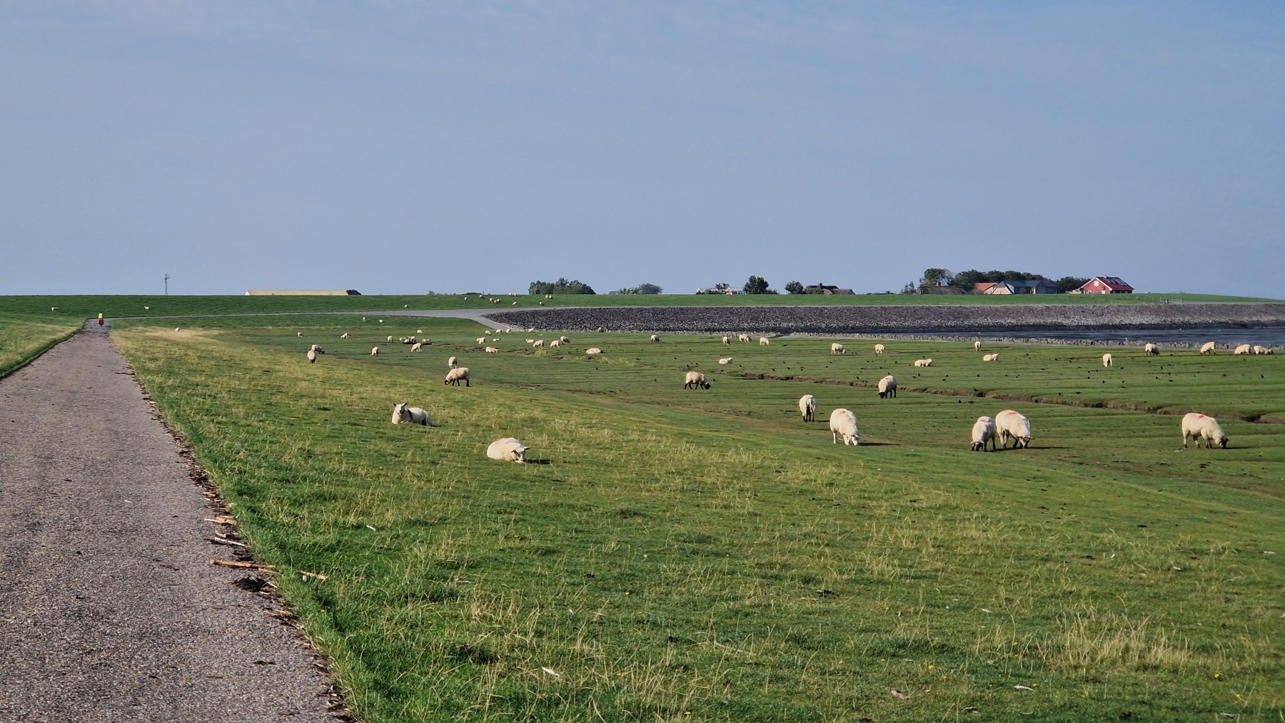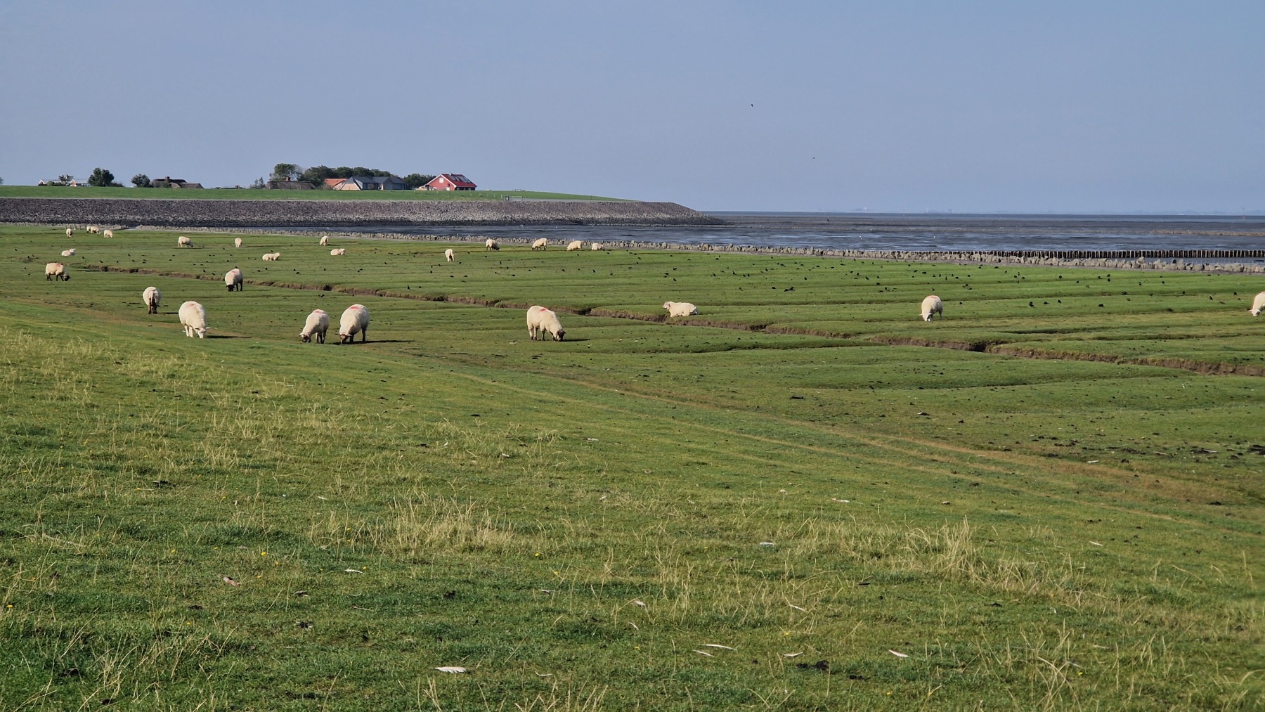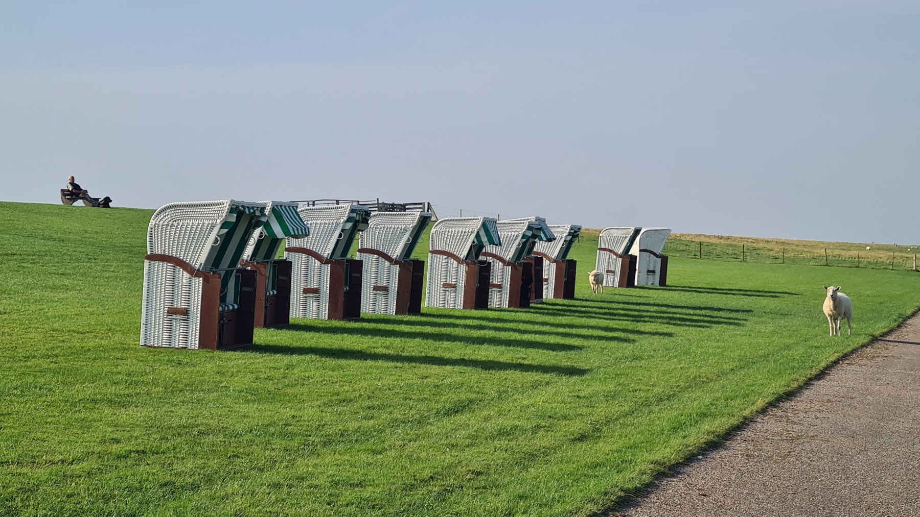 La presqu’île est protégée par des digues enherbées où paissent des moutons. Nous avons donc cheminé au milieu des troupeaux… Les pâturages sont parfois interrompus par des plages de gazon ponctuées de bancs protégés par des toits.