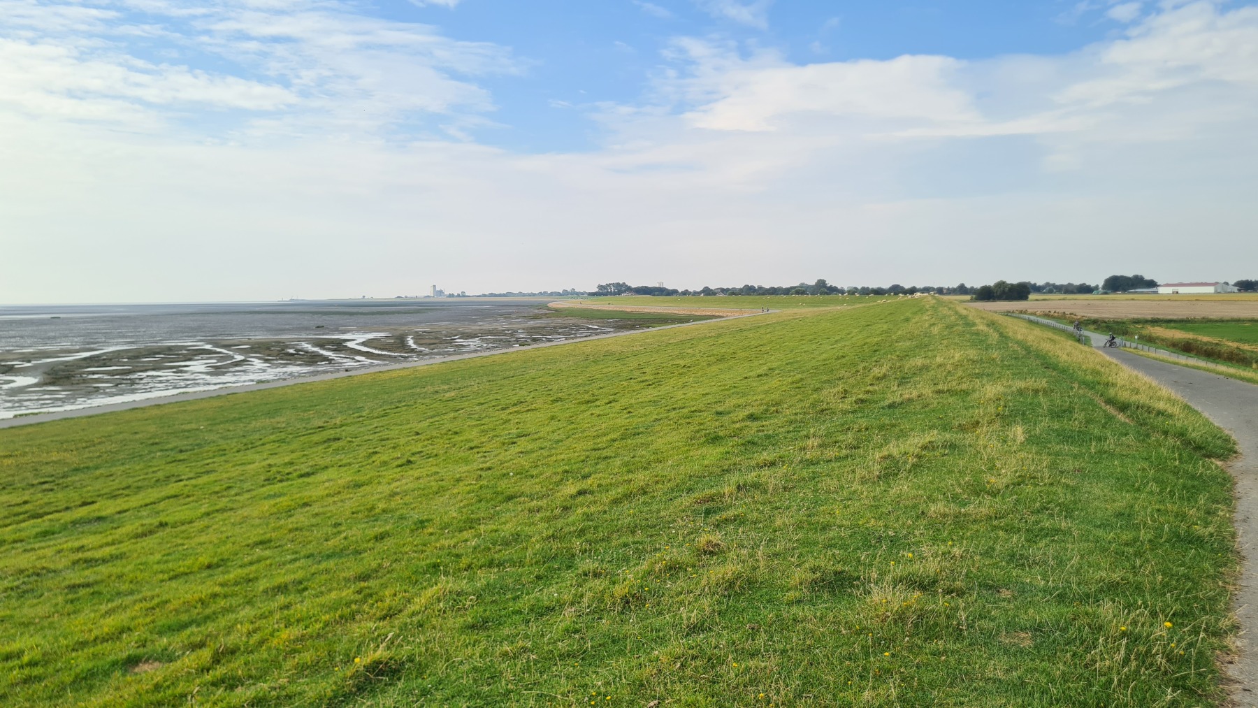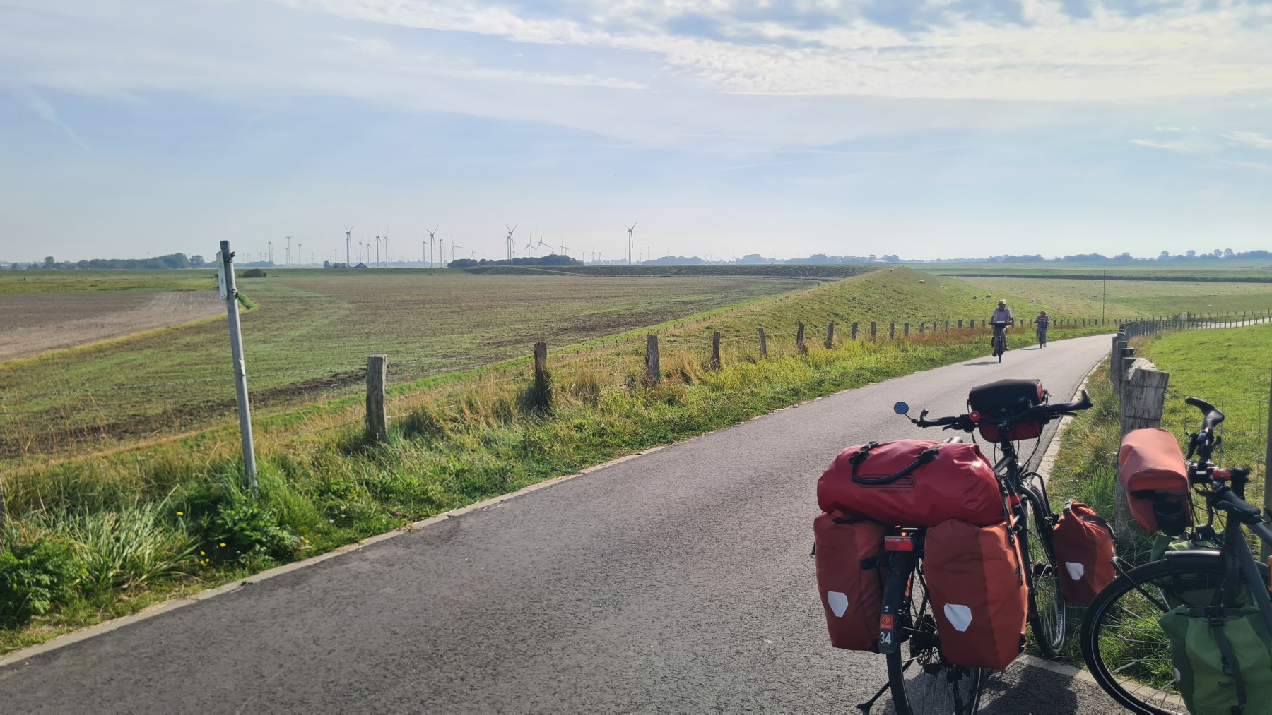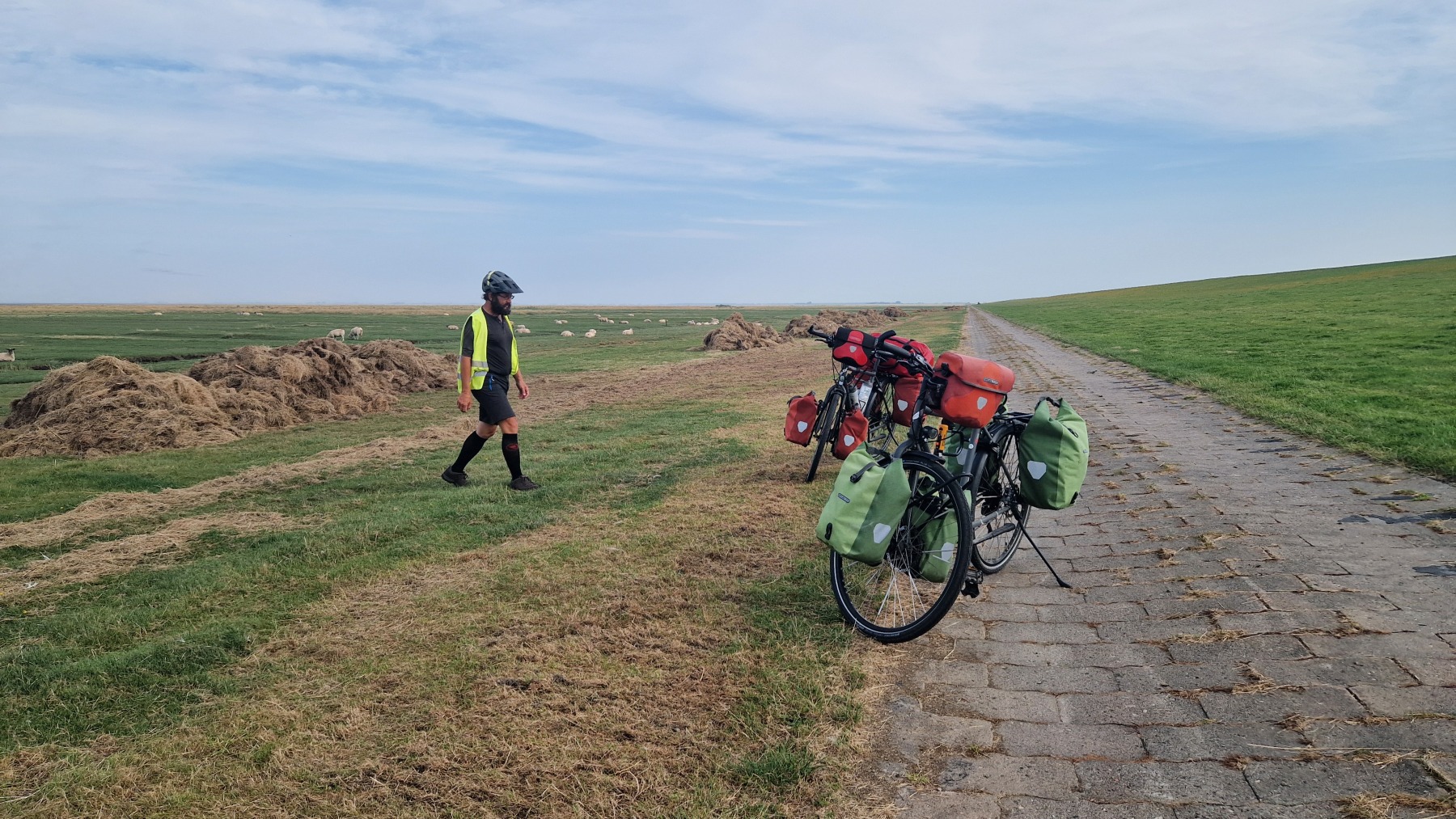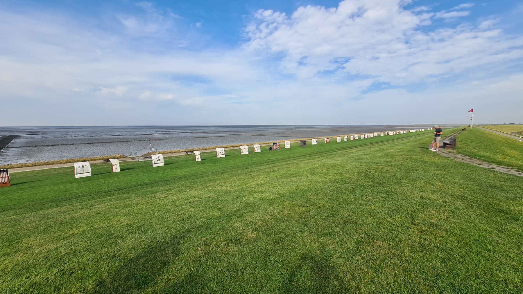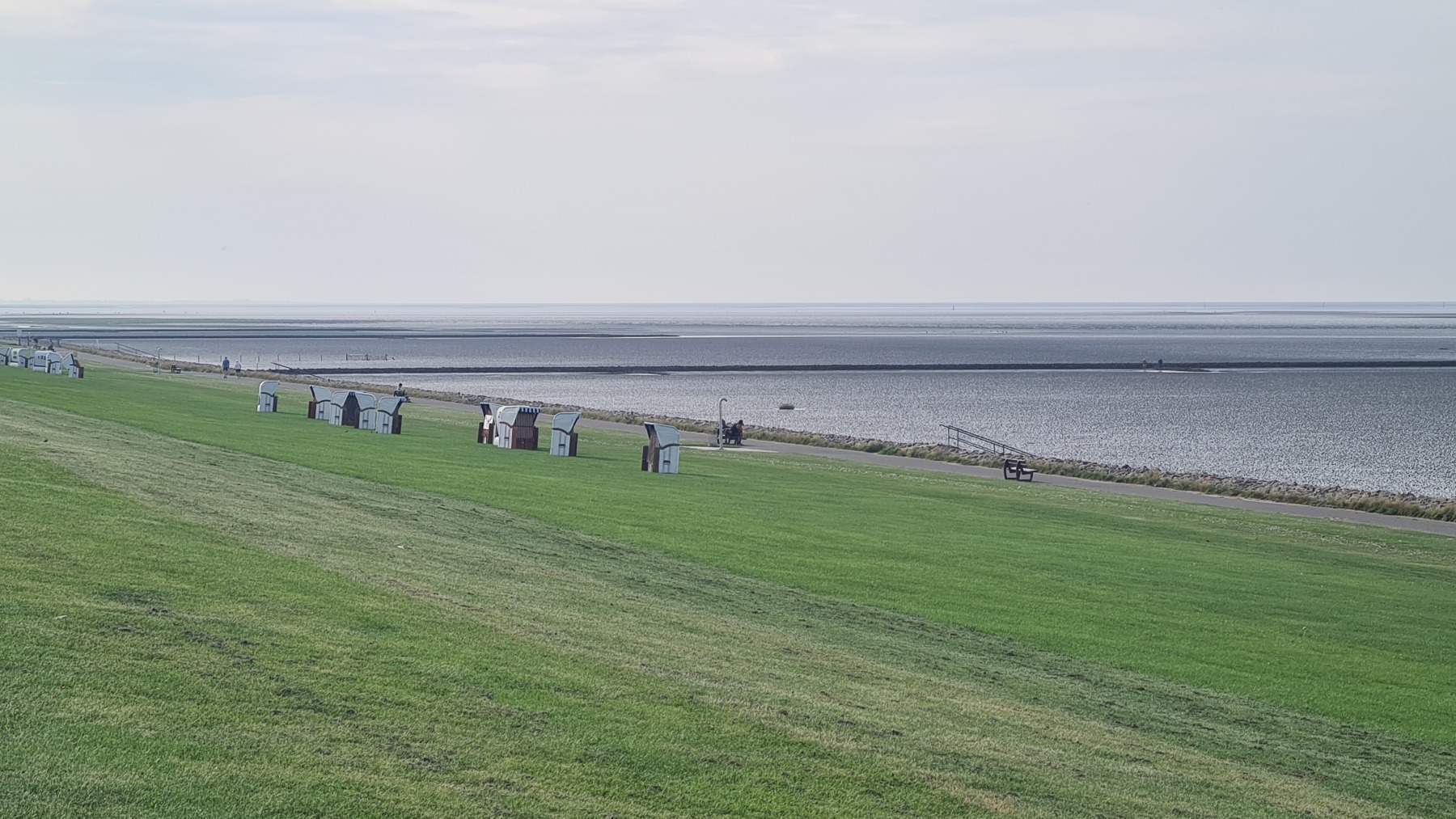 Ce matin nous avons retrouvé Eurovelo 12 à l’embouchure de l’Eider pour suivre la côte. Nous avons de nouveau roulé sur une piste goudronnée entre la mer et la digue enherbé dans ce ruban qui forme un énorme pâturage pour les moutons interrompu par des « plages » de gazon avec leurs sièges en location.