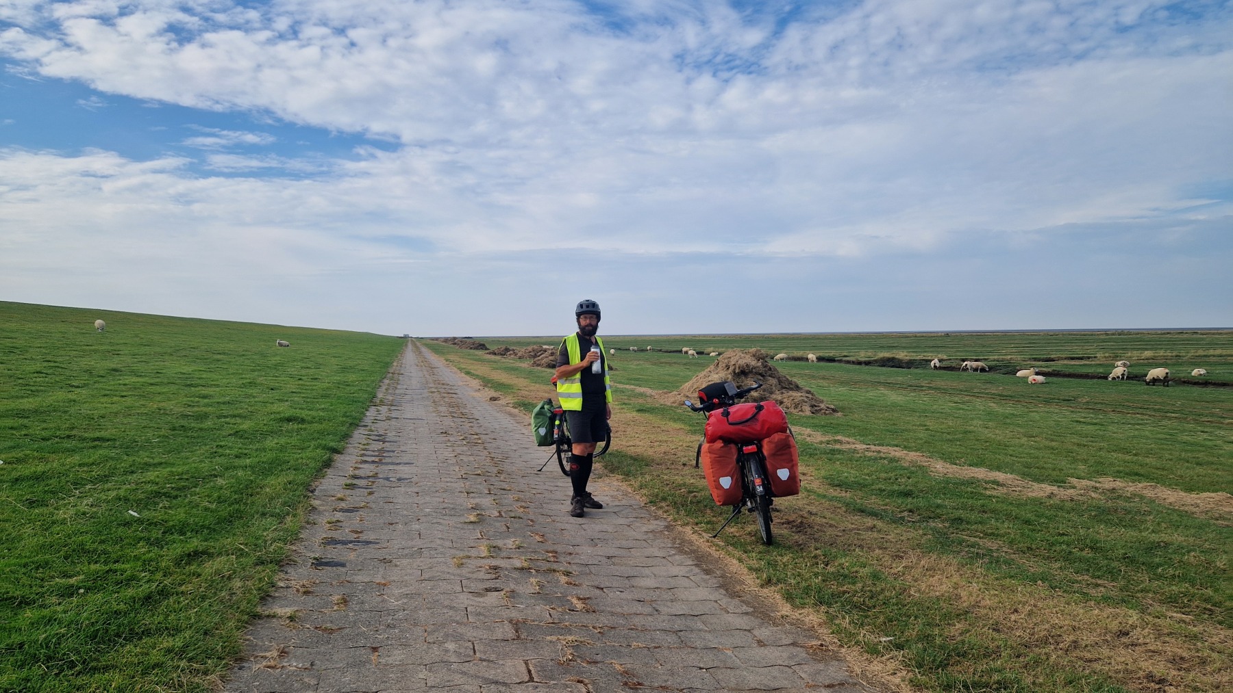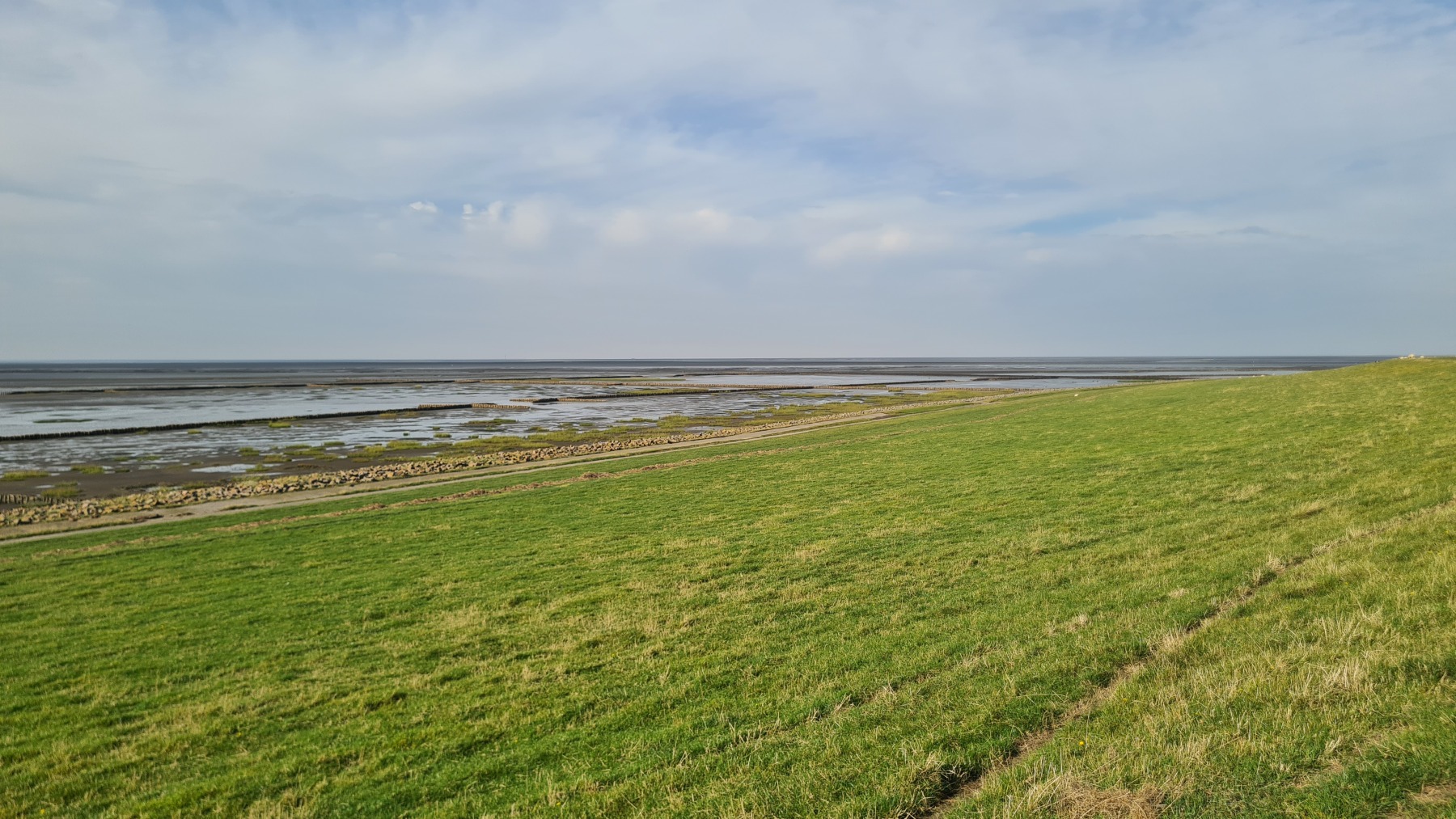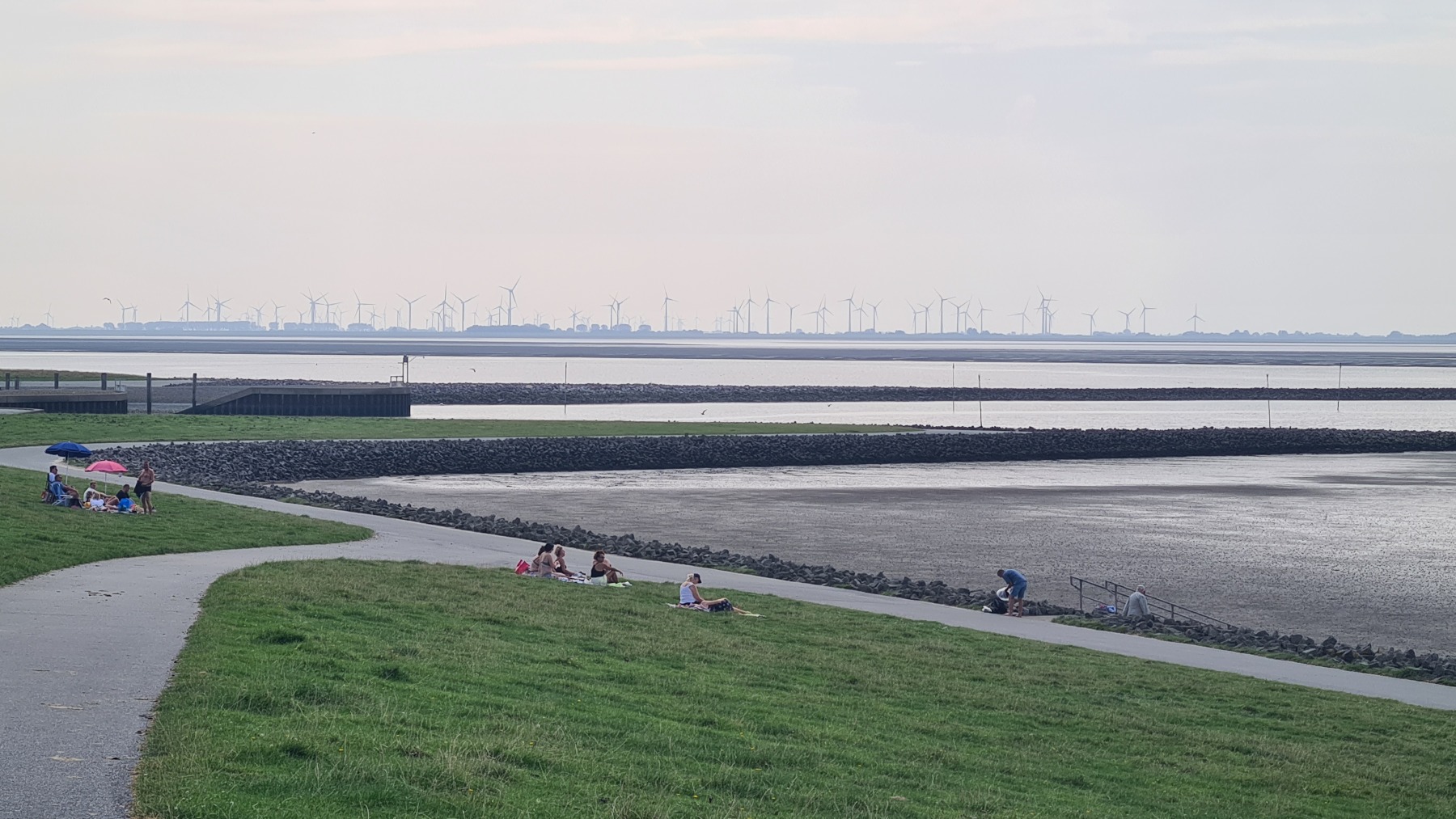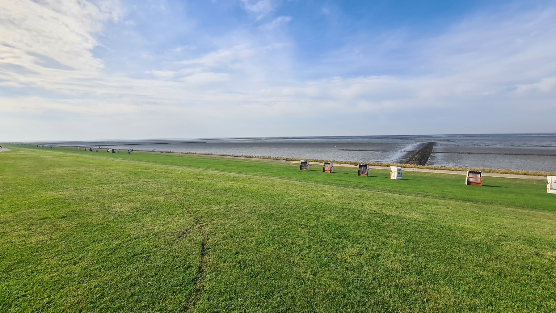 Ce matin nous avons retrouvé Eurovelo 12 à l’embouchure de l’Eider pour suivre la côte. Nous avons de nouveau roulé sur une piste goudronnée entre la mer et la digue enherbé dans ce ruban qui forme un énorme pâturage pour les moutons interrompu par des « plages » de gazon avec leurs sièges en location.