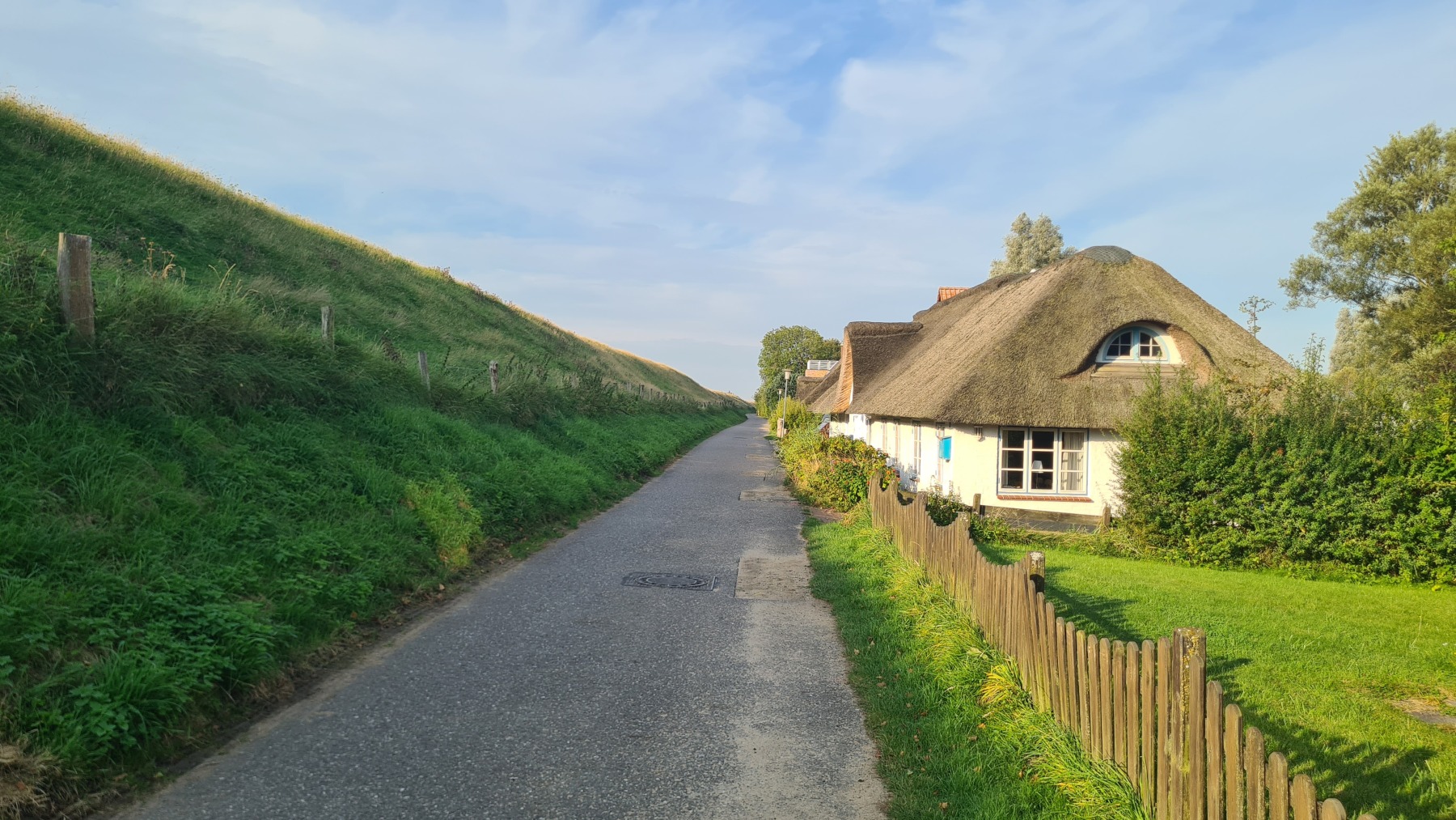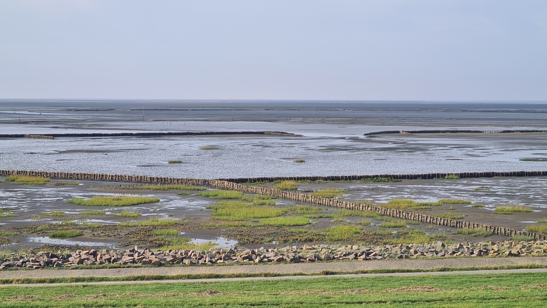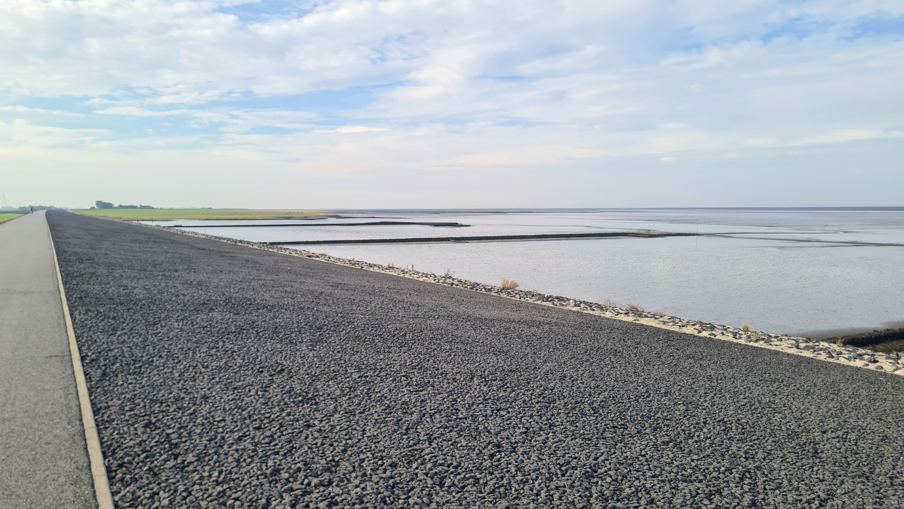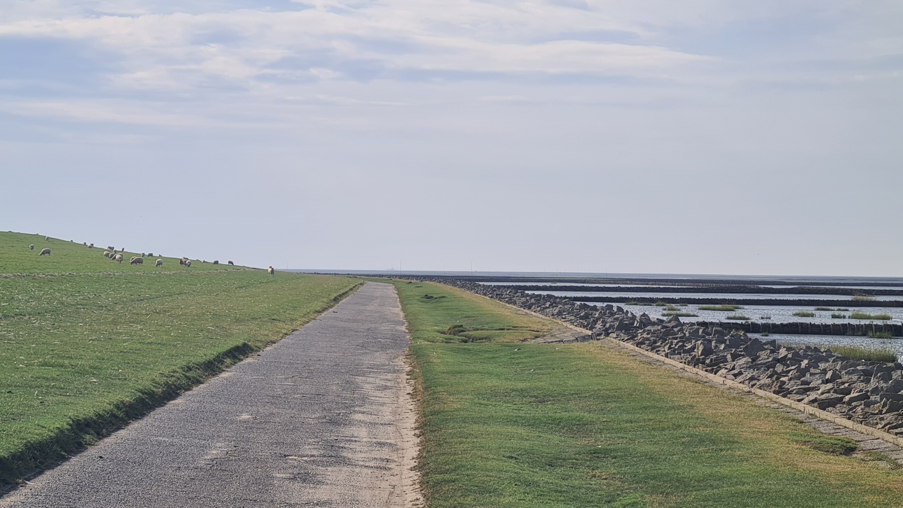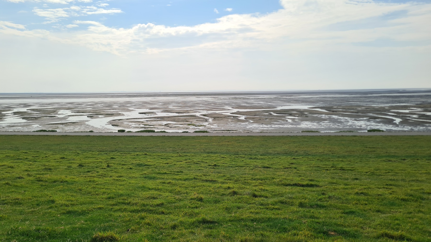 Ce matin nous avons retrouvé Eurovelo 12 à l’embouchure de l’Eider pour suivre la côte. Nous avons de nouveau roulé sur une piste goudronnée entre la mer et la digue enherbé dans ce ruban qui forme un énorme pâturage pour les moutons interrompu par des « plages » de gazon avec leurs sièges en location.