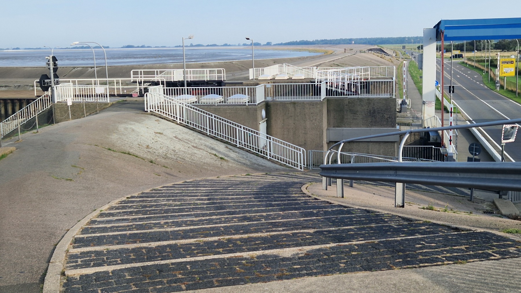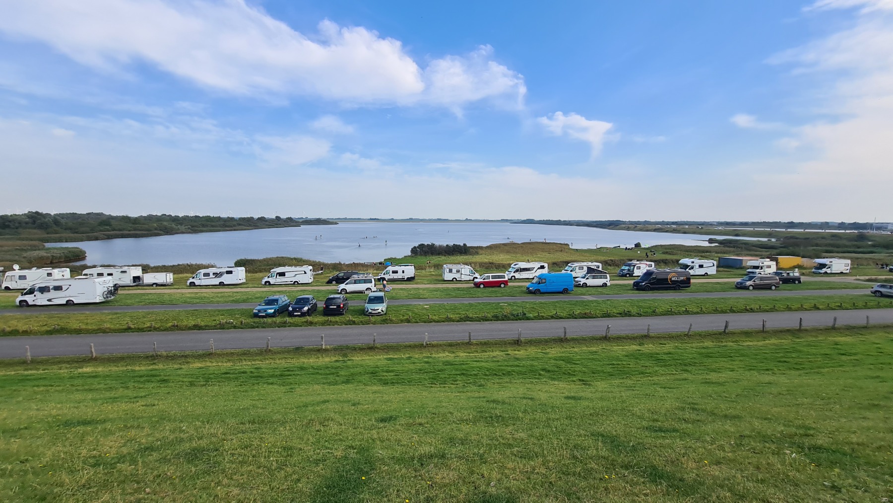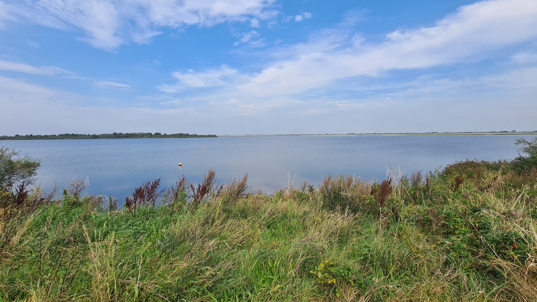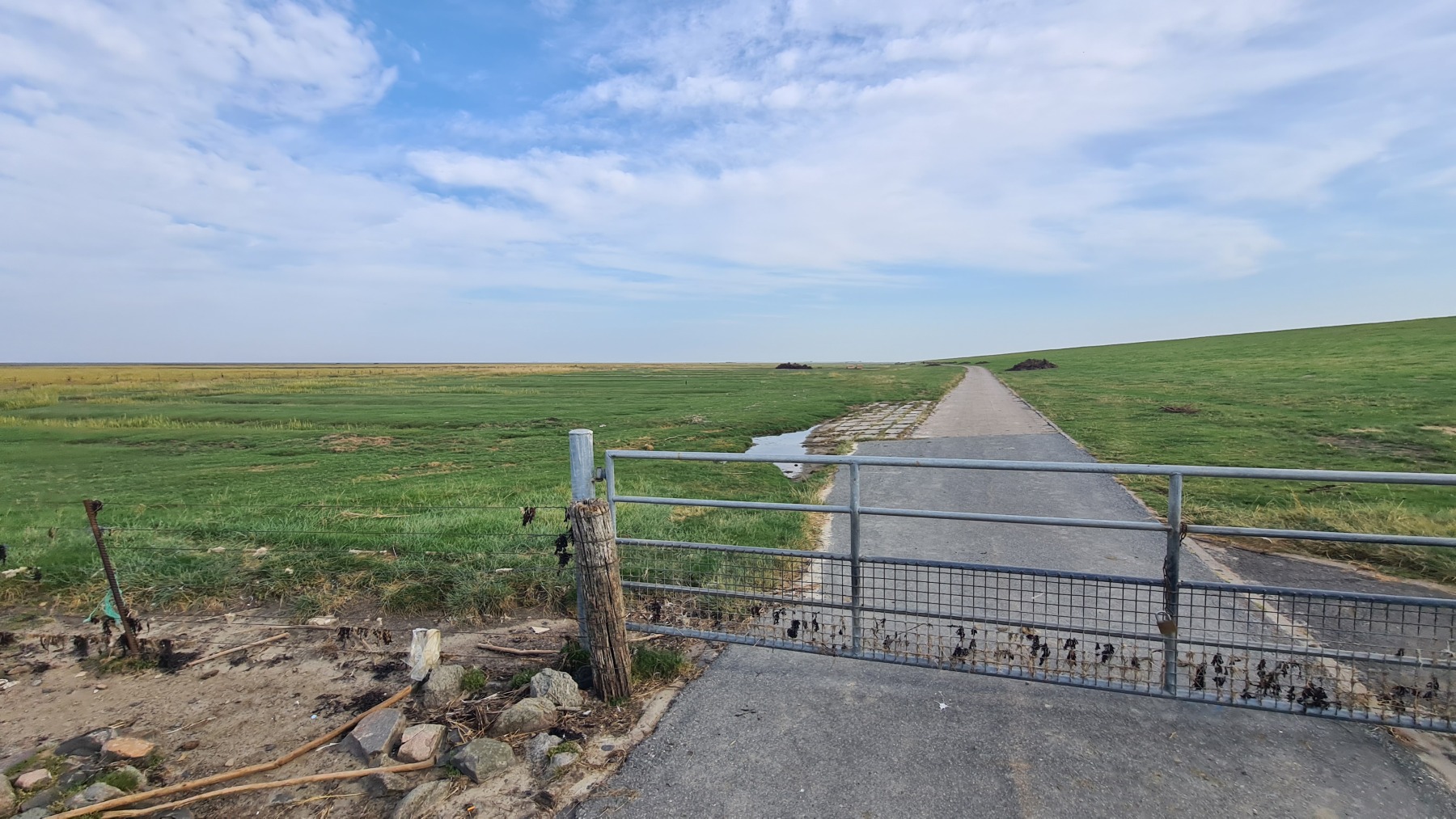 Ce matin nous avons retrouvé Eurovelo 12 à l’embouchure de l’Eider pour suivre la côte. Nous avons de nouveau roulé sur une piste goudronnée entre la mer et la digue enherbé dans ce ruban qui forme un énorme pâturage pour les moutons interrompu par des « plages » de gazon avec leurs sièges en location.