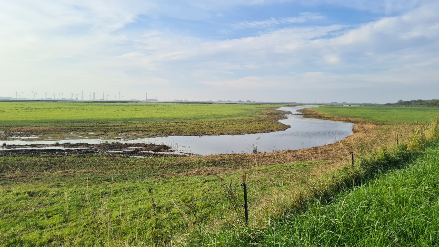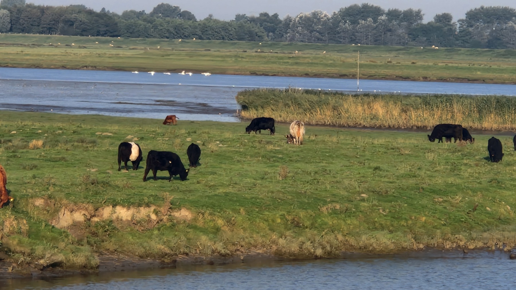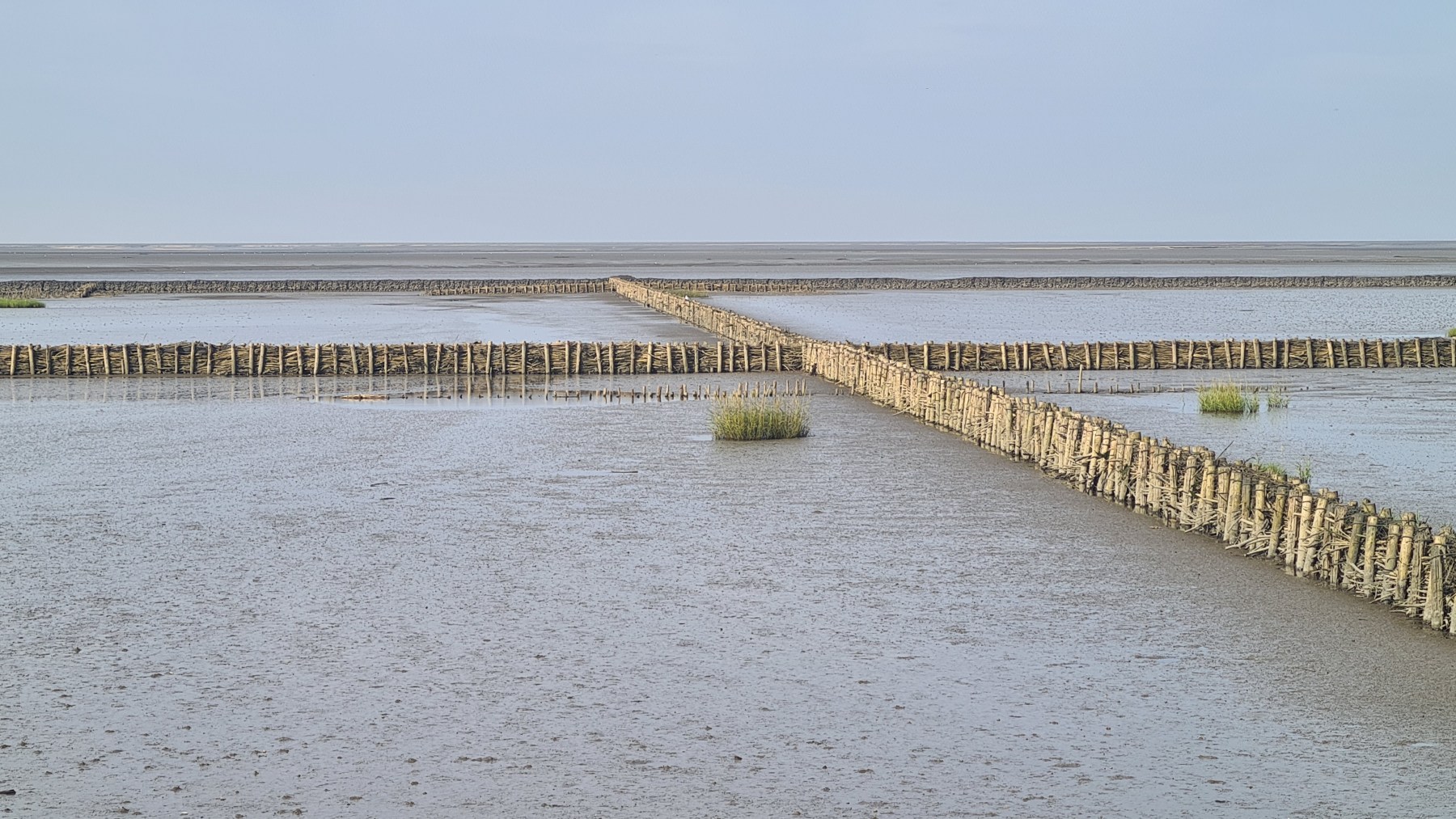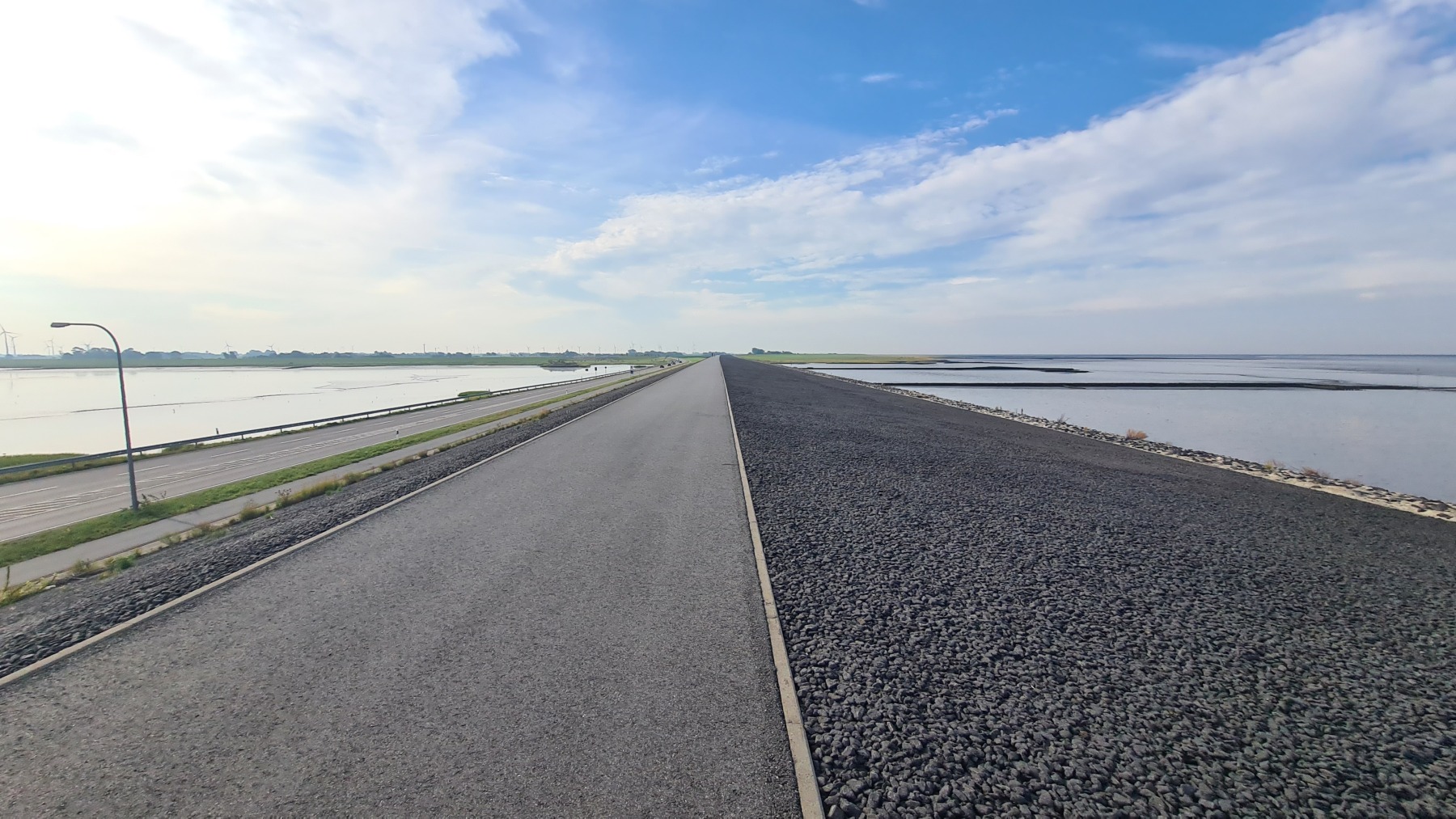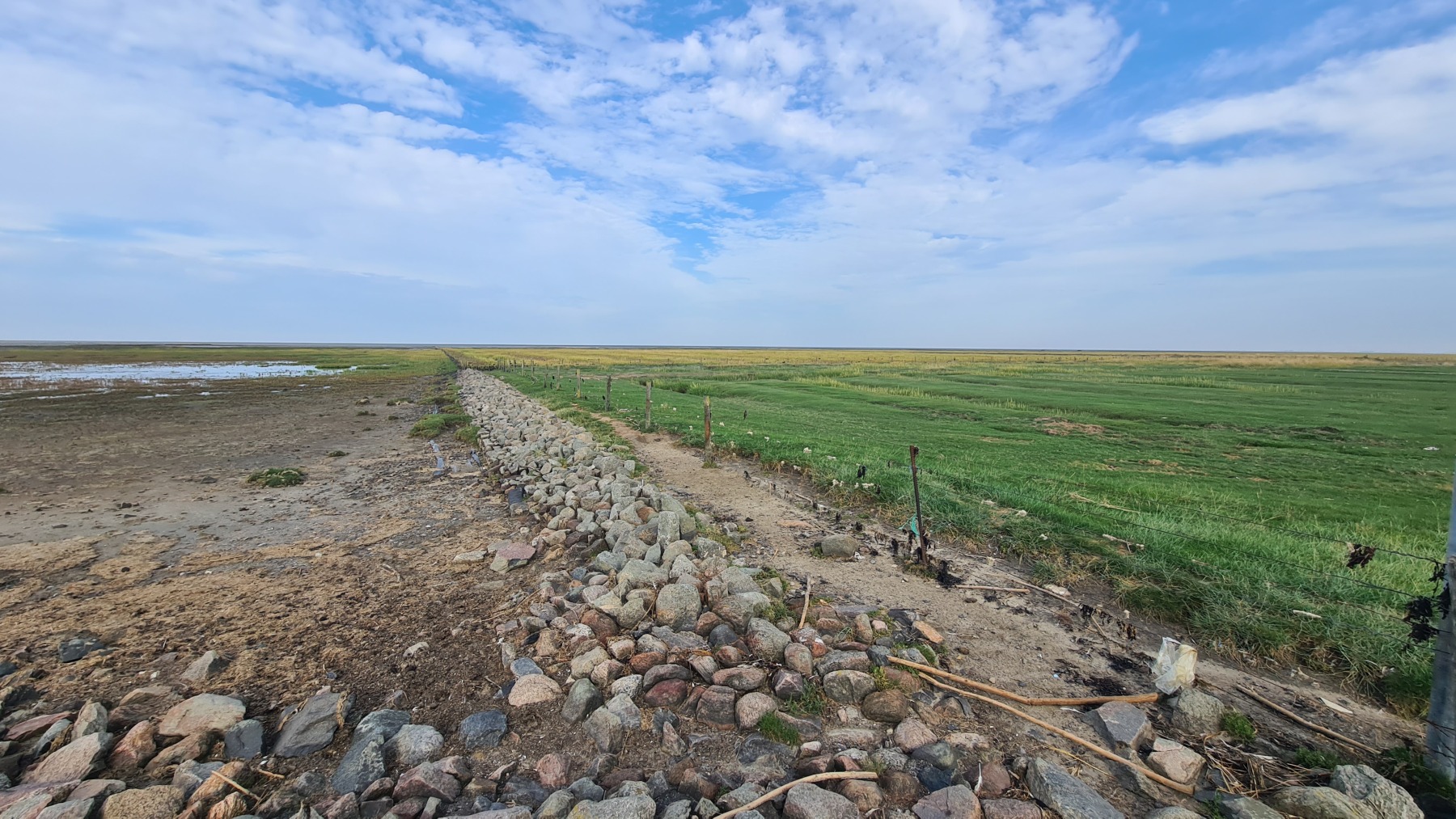 Ce matin nous avons retrouvé Eurovelo 12 à l’embouchure de l’Eider pour suivre la côte. Nous avons de nouveau roulé sur une piste goudronnée entre la mer et la digue enherbé dans ce ruban qui forme un énorme pâturage pour les moutons interrompu par des « plages » de gazon avec leurs sièges en location.