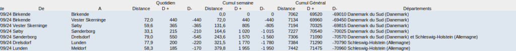 Un jour de repos à pied et en voiture avec Pierre et Lena (en vert) et six jours de vélo avec un peu de ferry (en bleu) pour cette semaine danoise et allemande.