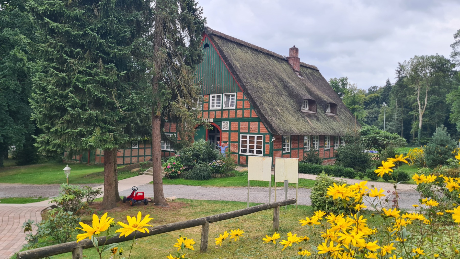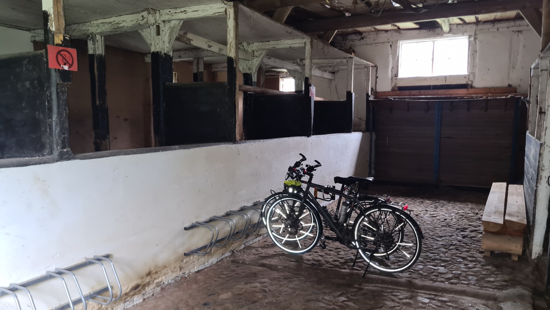 Ce soir nous dormons dans un hôtel à Wingst où nous sommes logés, ainsi que nos vélos, dans d’anciennes écuries. L’hôtel est réputé pour son restaurant… qui est fermé le marfi soir. Comme il a commencé à pleuvoir et que le restaurant le plus proche est à plus de 2 km nous avons diné de semoule de couscous dans notre chambre.