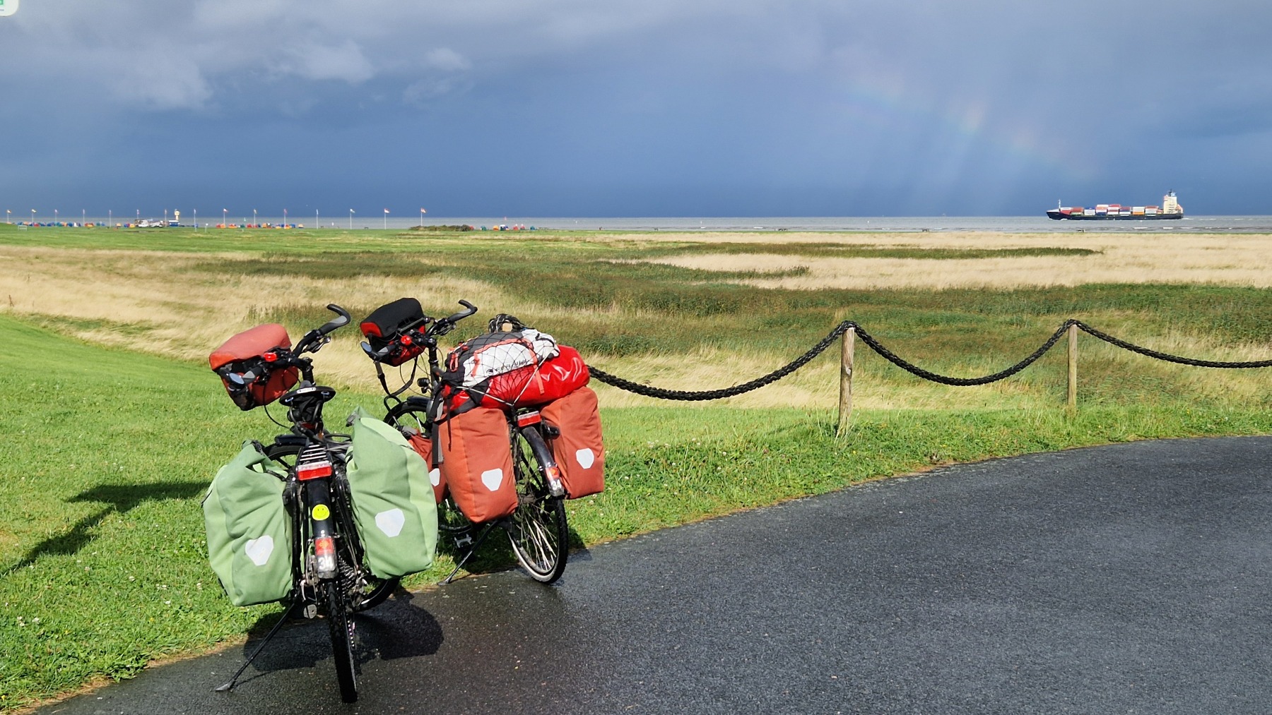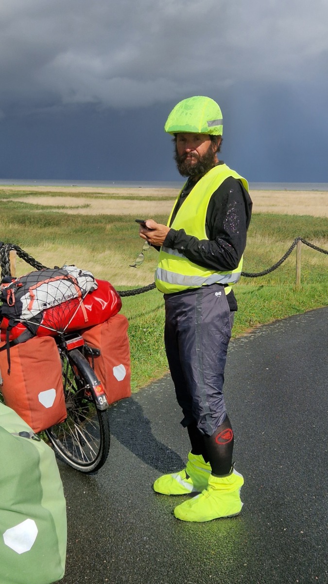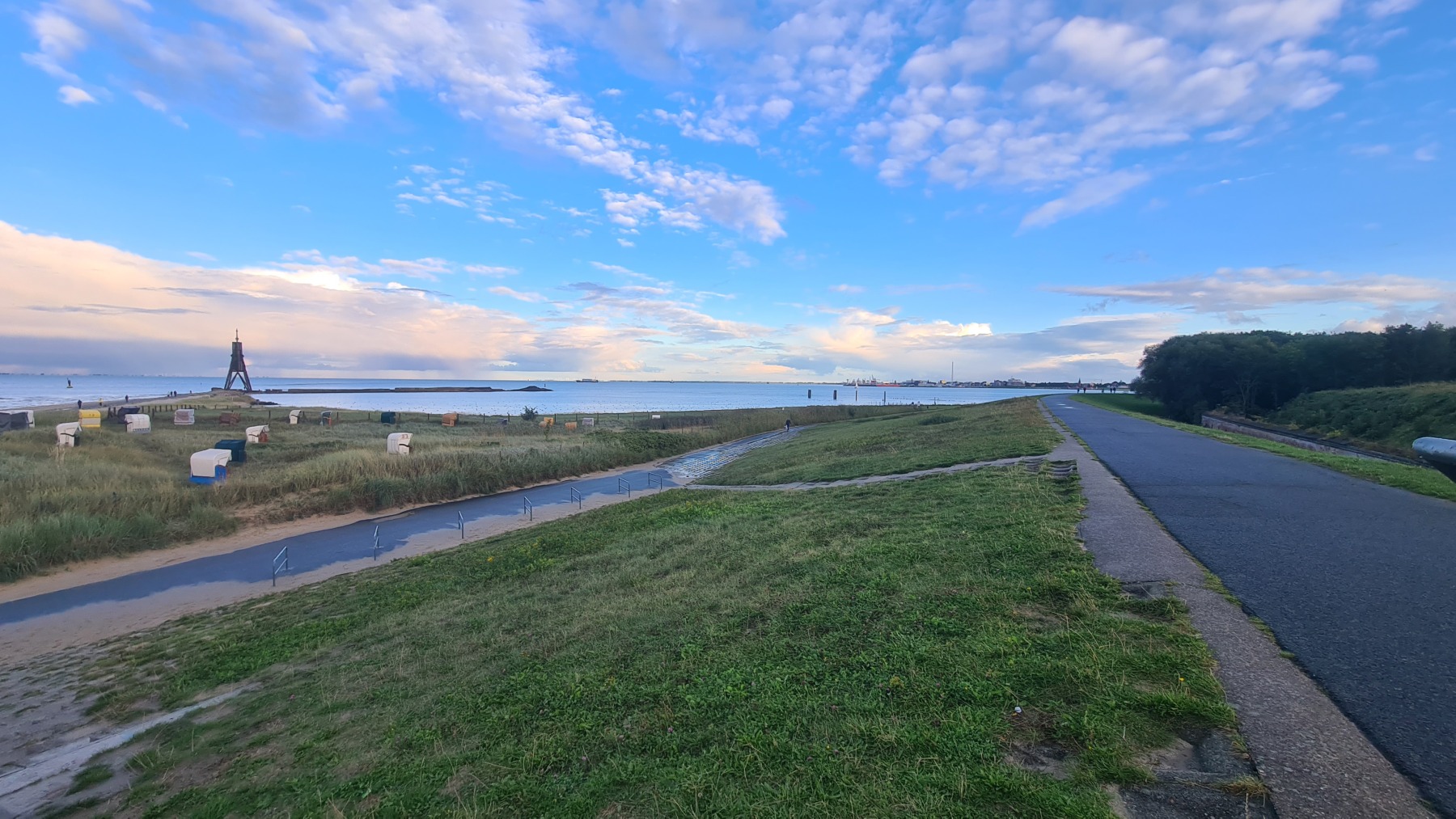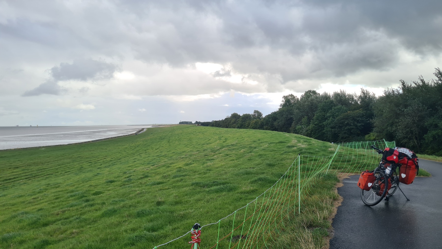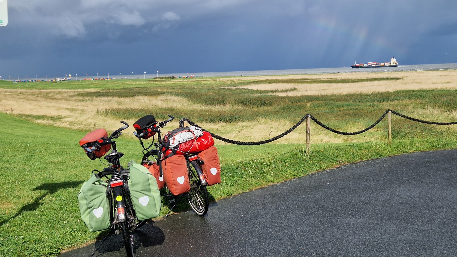 La météo ne s’était pas trop trompée et nous avons pédalé sous une alternance d’ondées et d’éclaircies. Nous avons déjeuné à Cuxhaven et nous sommes allé faire la sieste à la « gasthaus » où nous dormons avant d’aller voir la « Kugelbake« , balise qui marque la limite entre l’Elbe et la mer du Nord et de diner dans un restaurant grec.