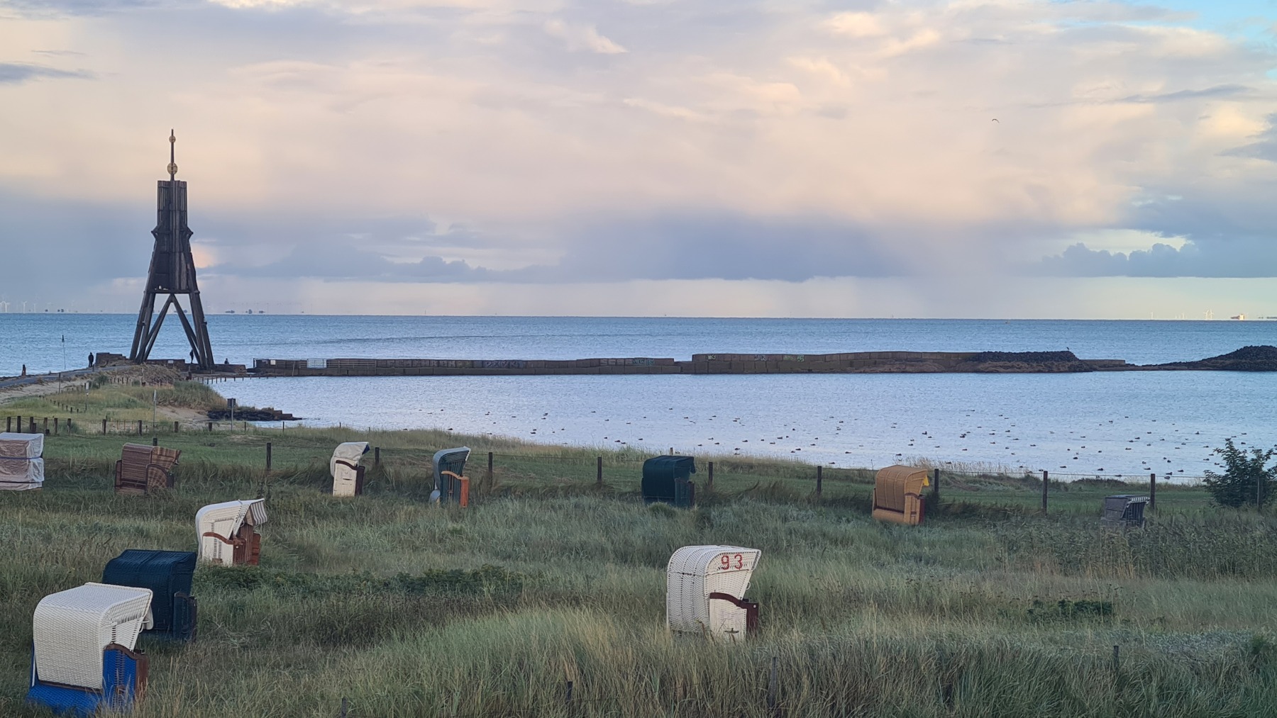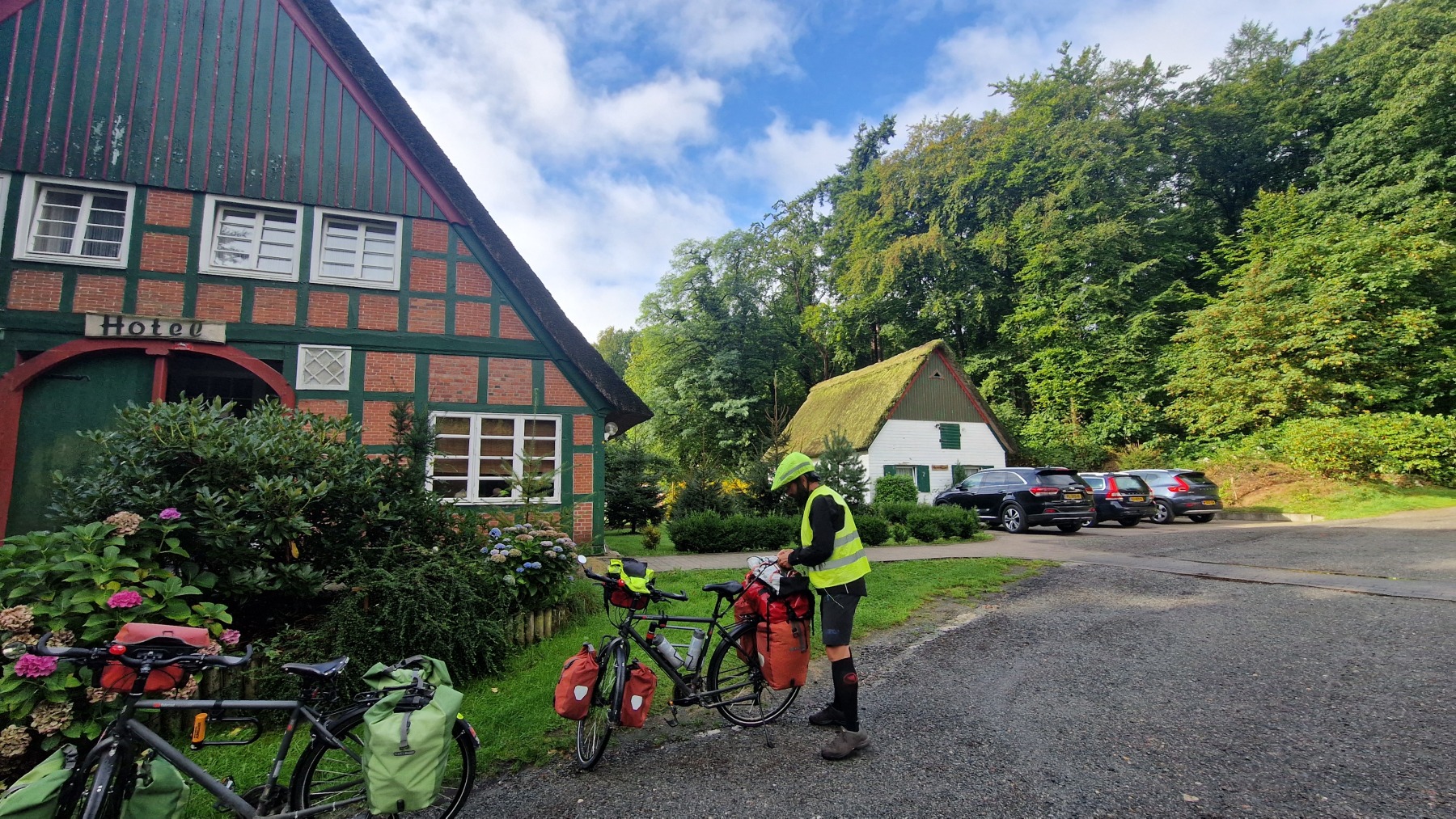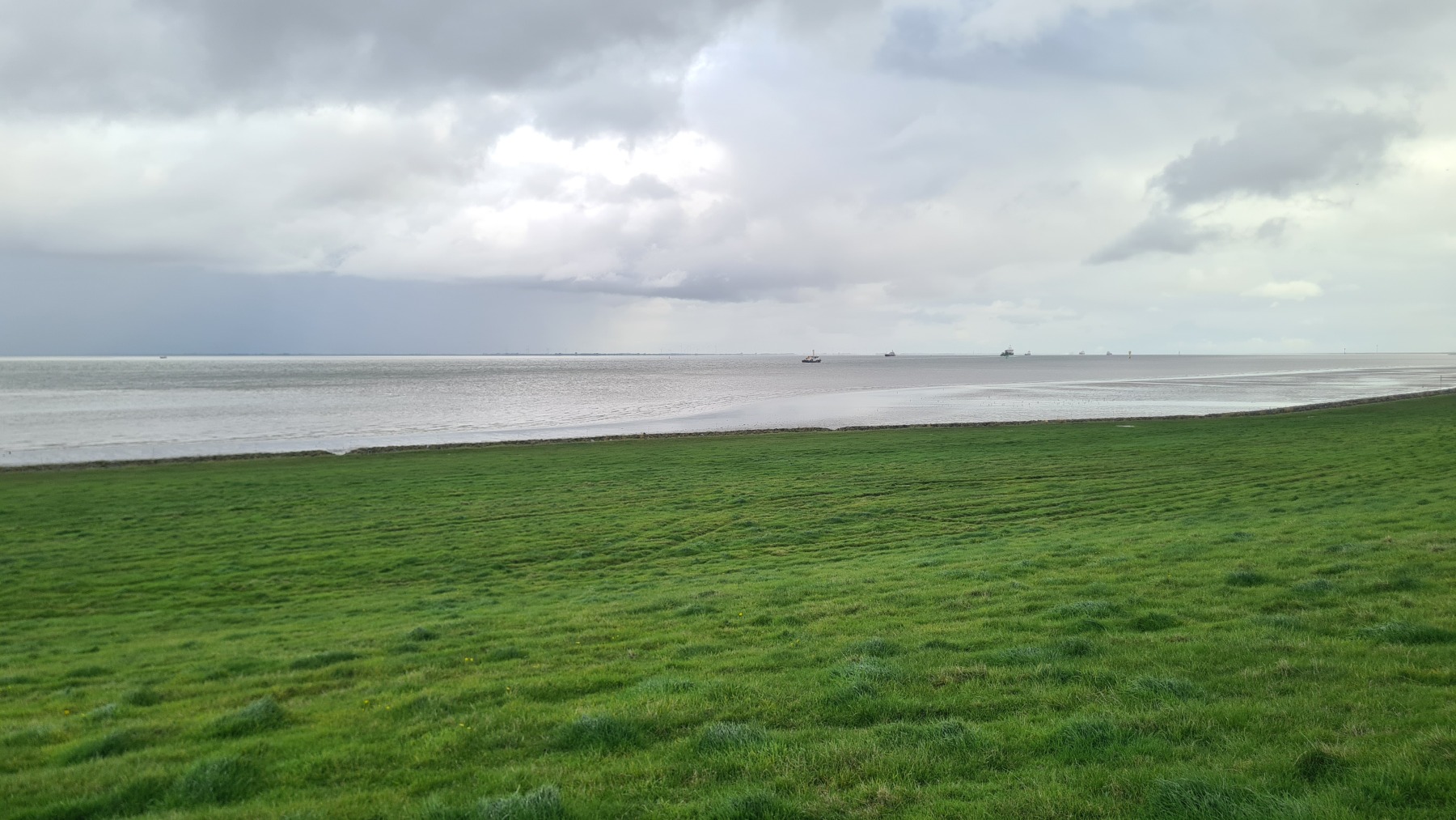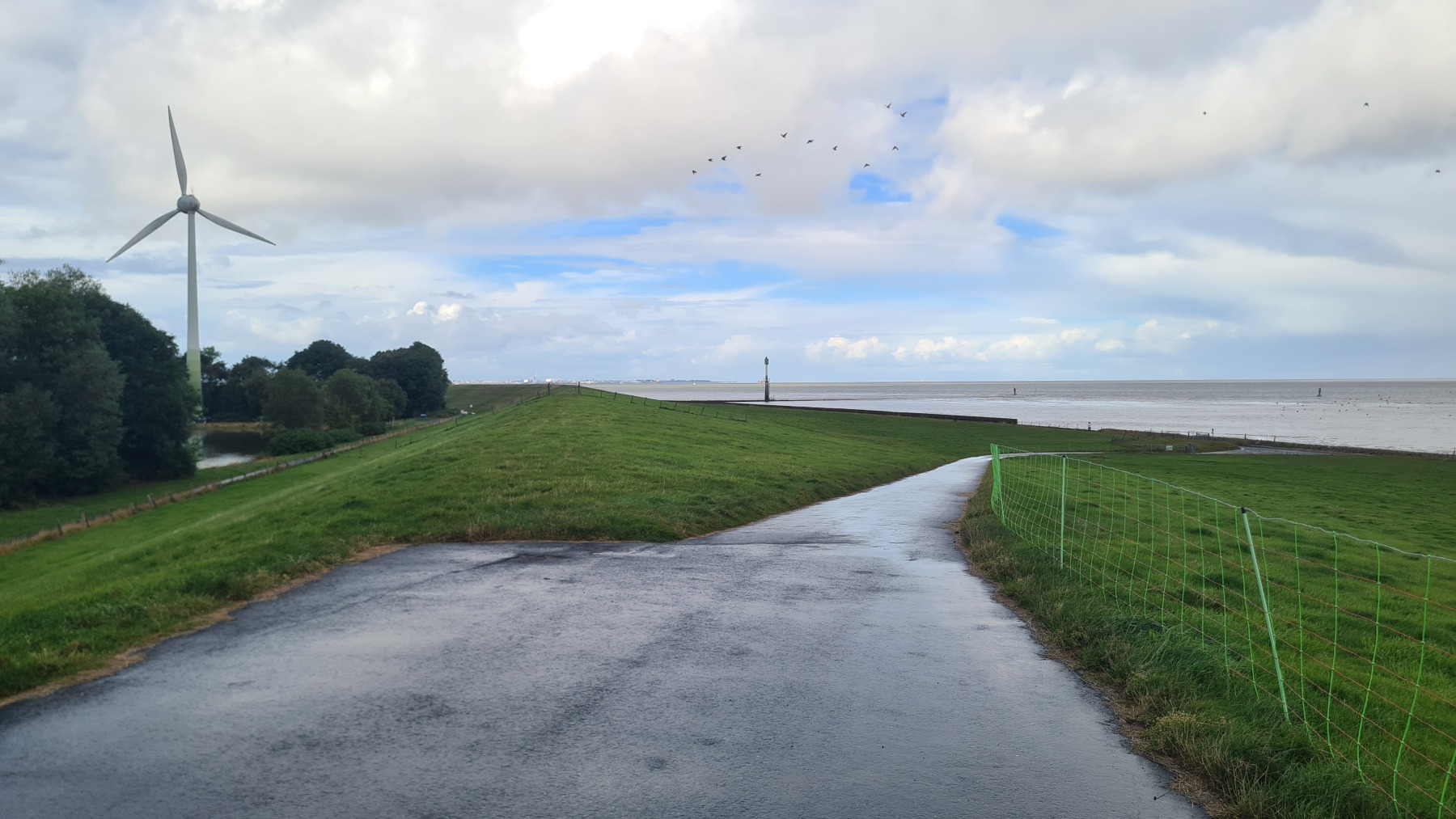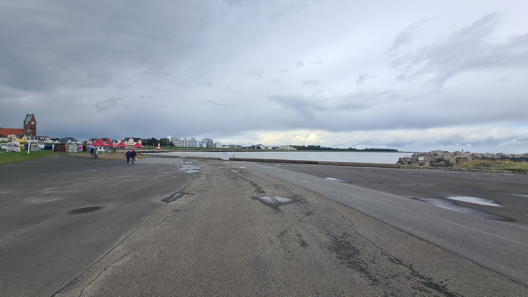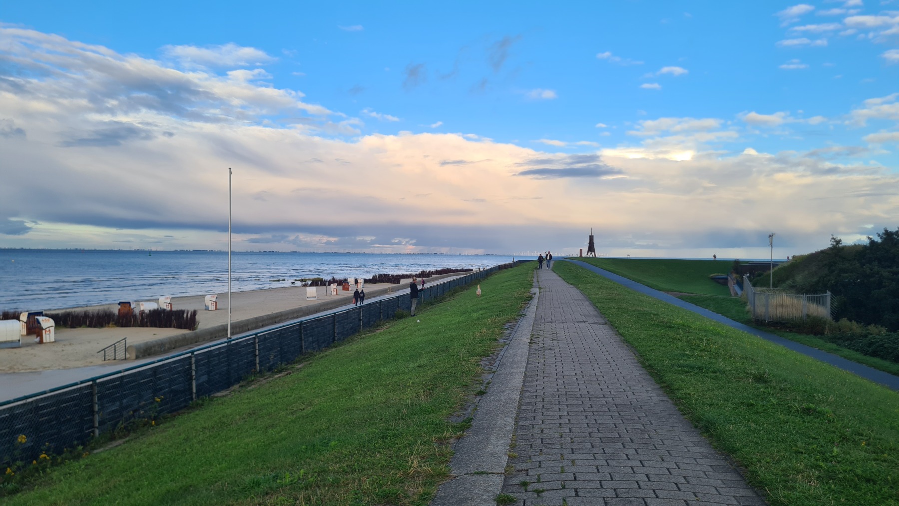 La météo ne s’était pas trop trompée et nous avons pédalé sous une alternance d’ondées et d’éclaircies. Nous avons déjeuné à Cuxhaven et nous sommes allé faire la sieste à la « gasthaus » où nous dormons avant d’aller voir la « Kugelbake« , balise qui marque la limite entre l’Elbe et la mer du Nord et de diner dans un restaurant grec.