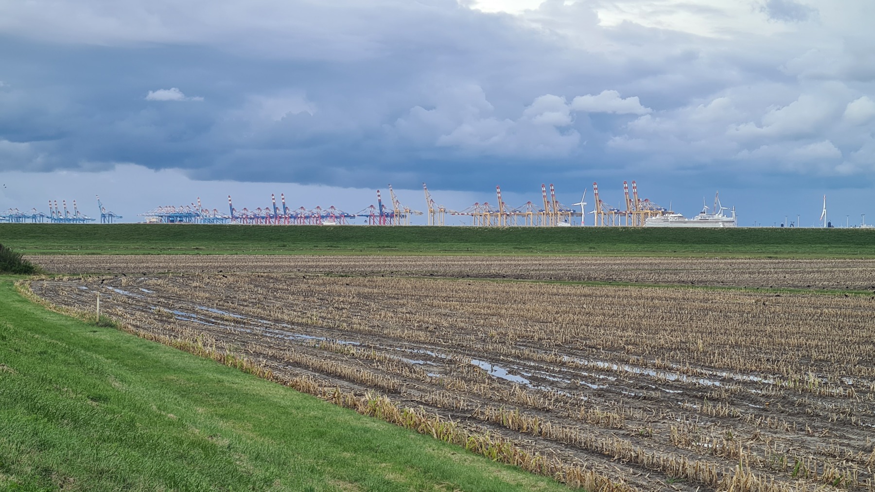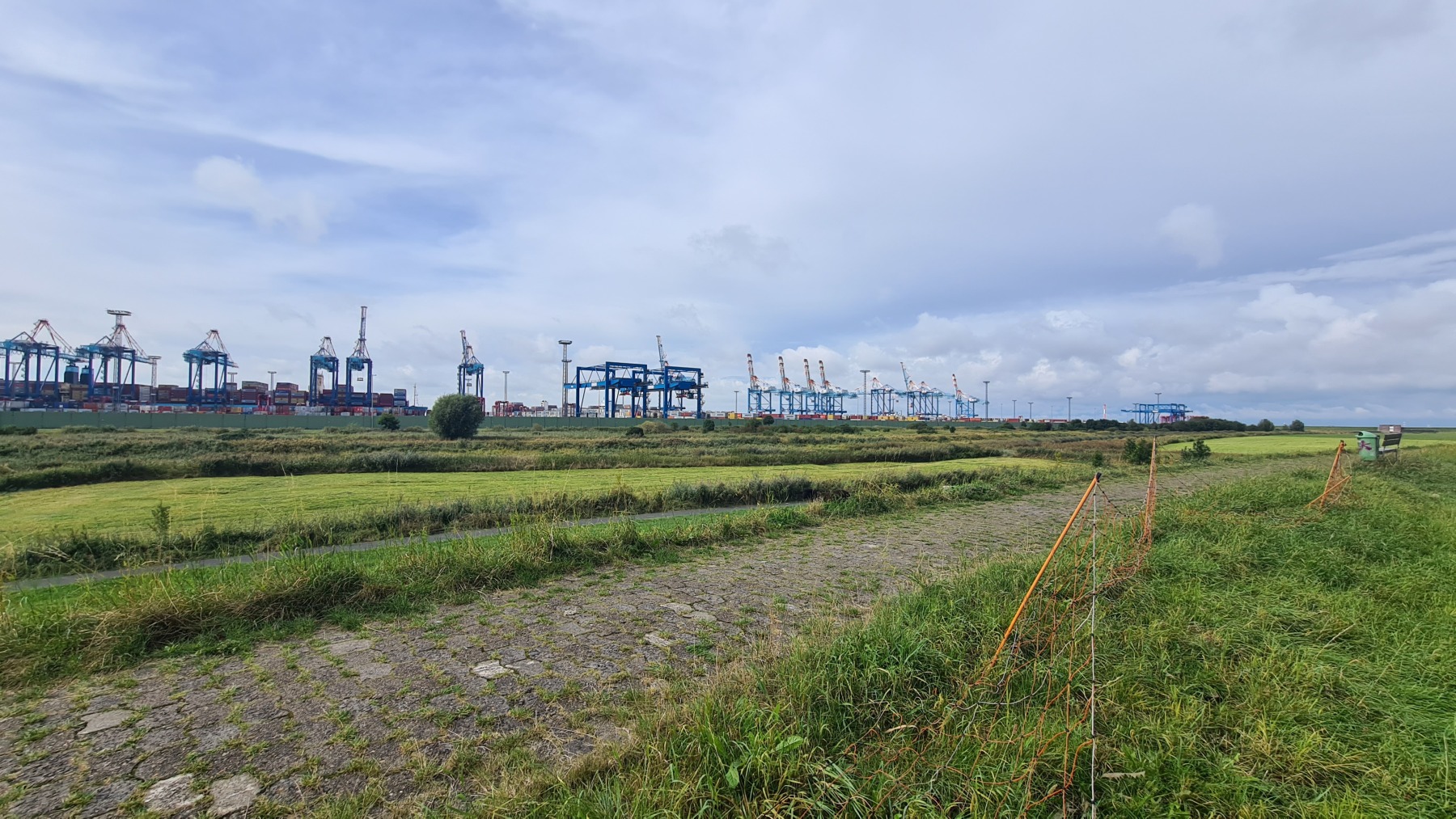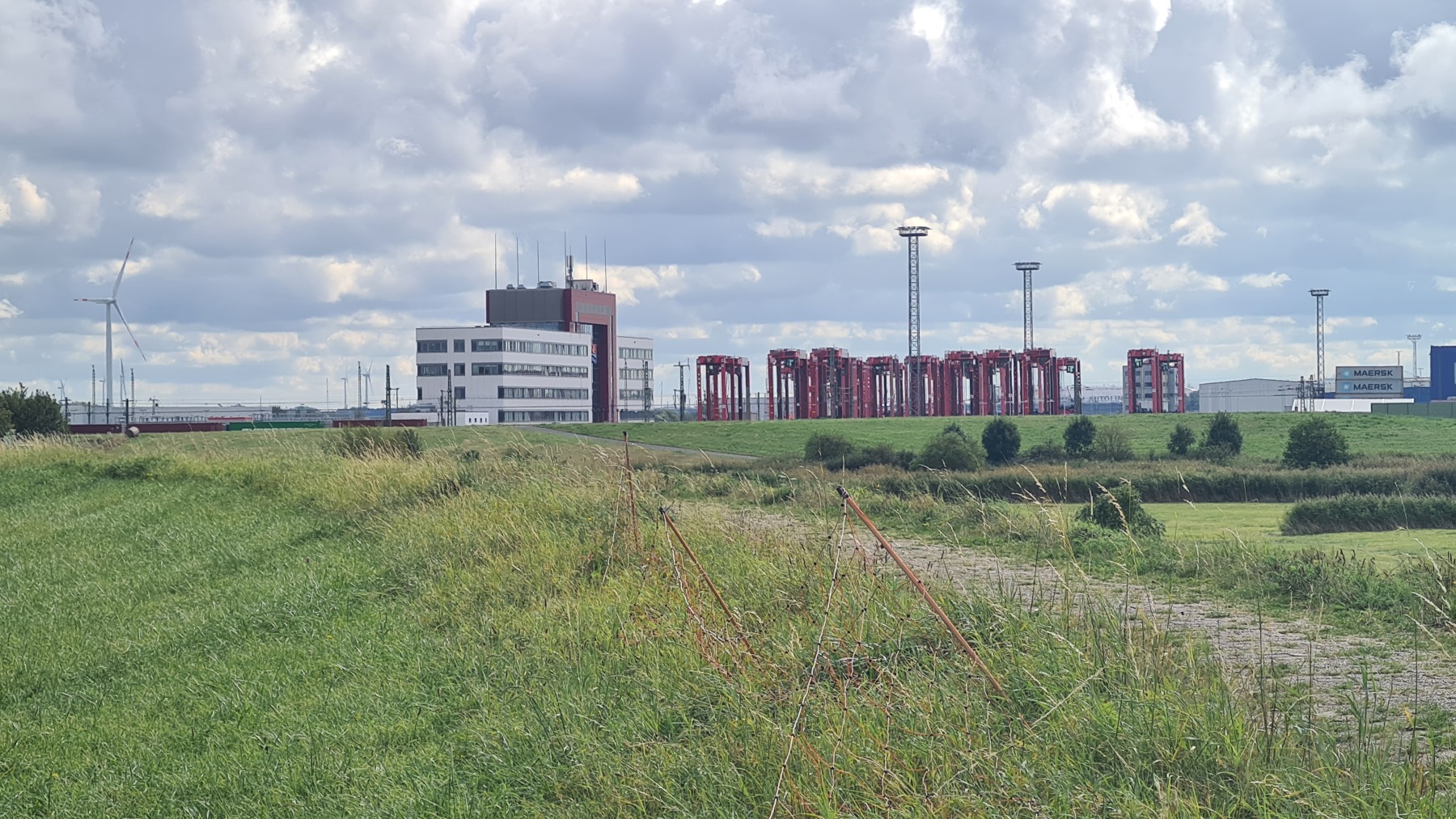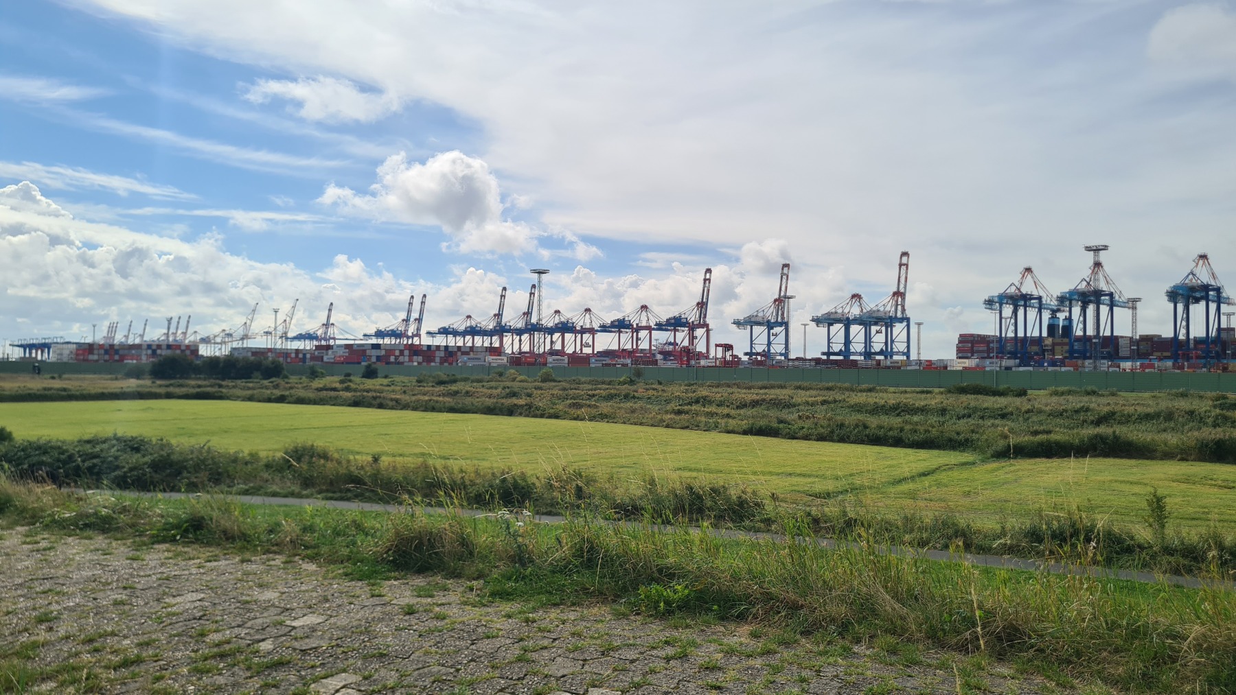 Cette étape bien aérée (rafales de face à 35 km/h) nous a fait traverser le port de Bremerhaven. Eurovelo 12 chemine au milieu d’un terminal conteneur démesuré avant de passer devant les quais de chargement et déchargement de voitures où les mercedes croisent les voitures coréennes et chinoises.
