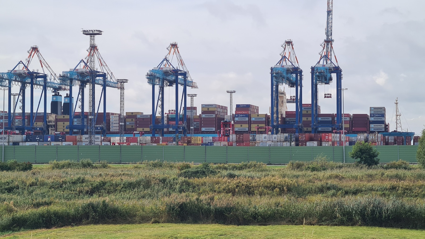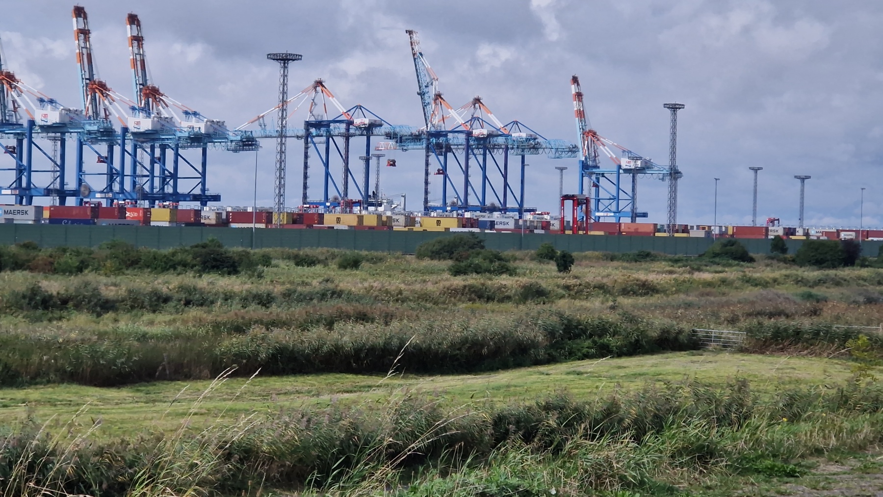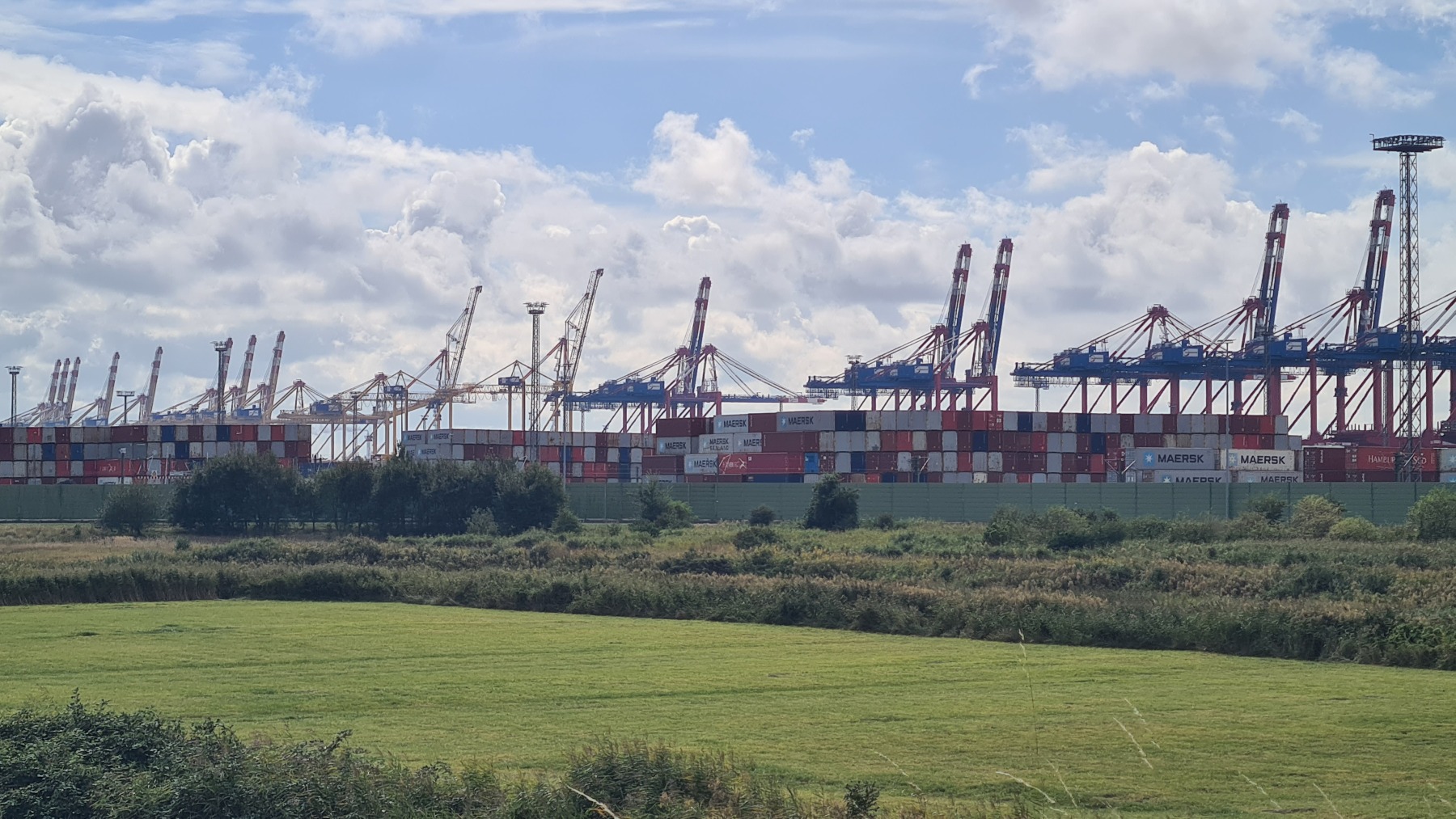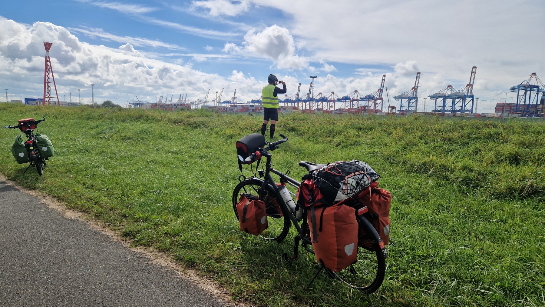 Cette étape bien aérée (rafales de face à 35 km/h) nous a fait traverser le port de Bremerhaven. Eurovelo 12 chemine au milieu d’un terminal conteneur démesuré avant de passer devant les quais de chargement et déchargement de voitures où les mercedes croisent les voitures coréennes et chinoises.