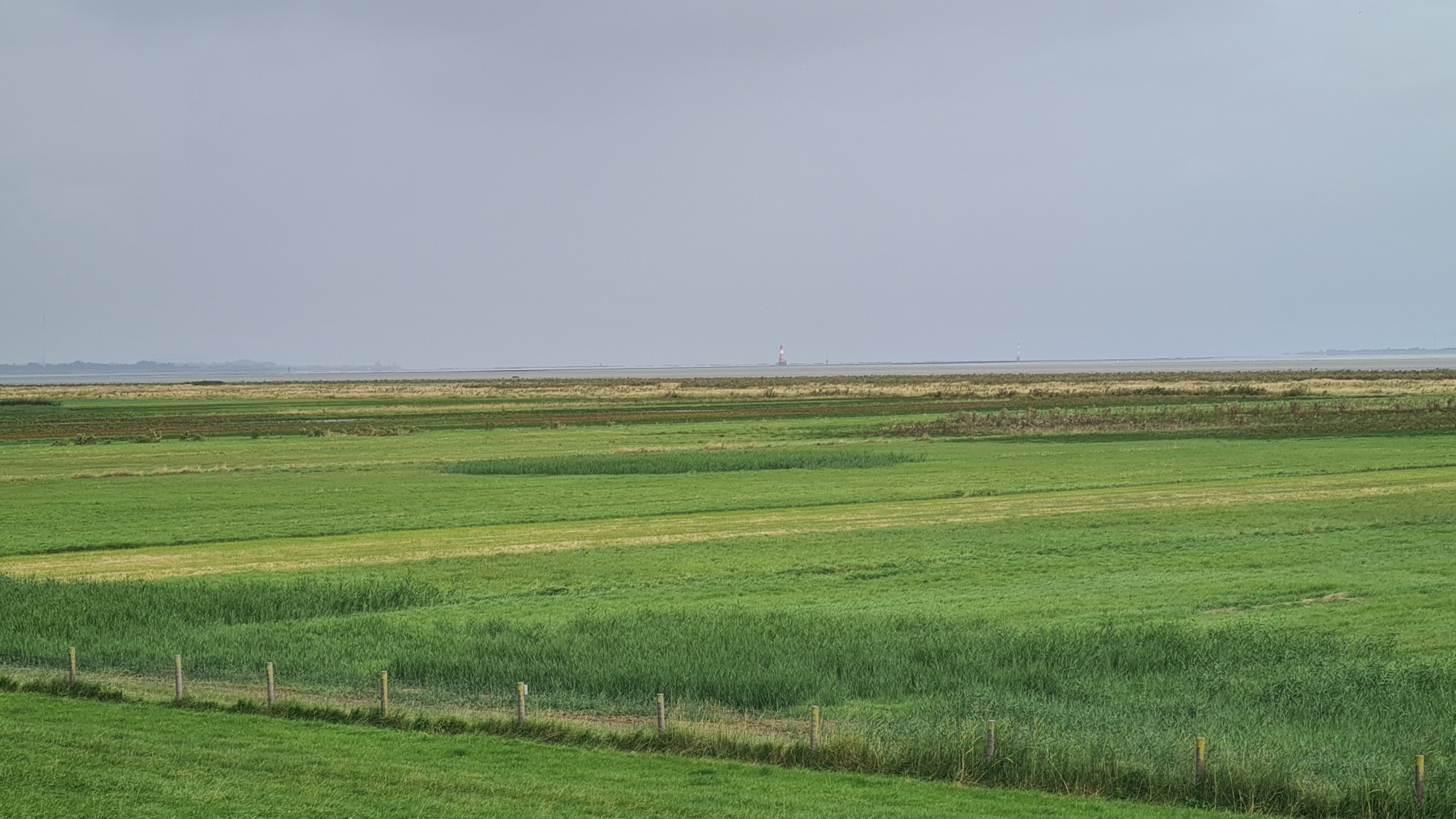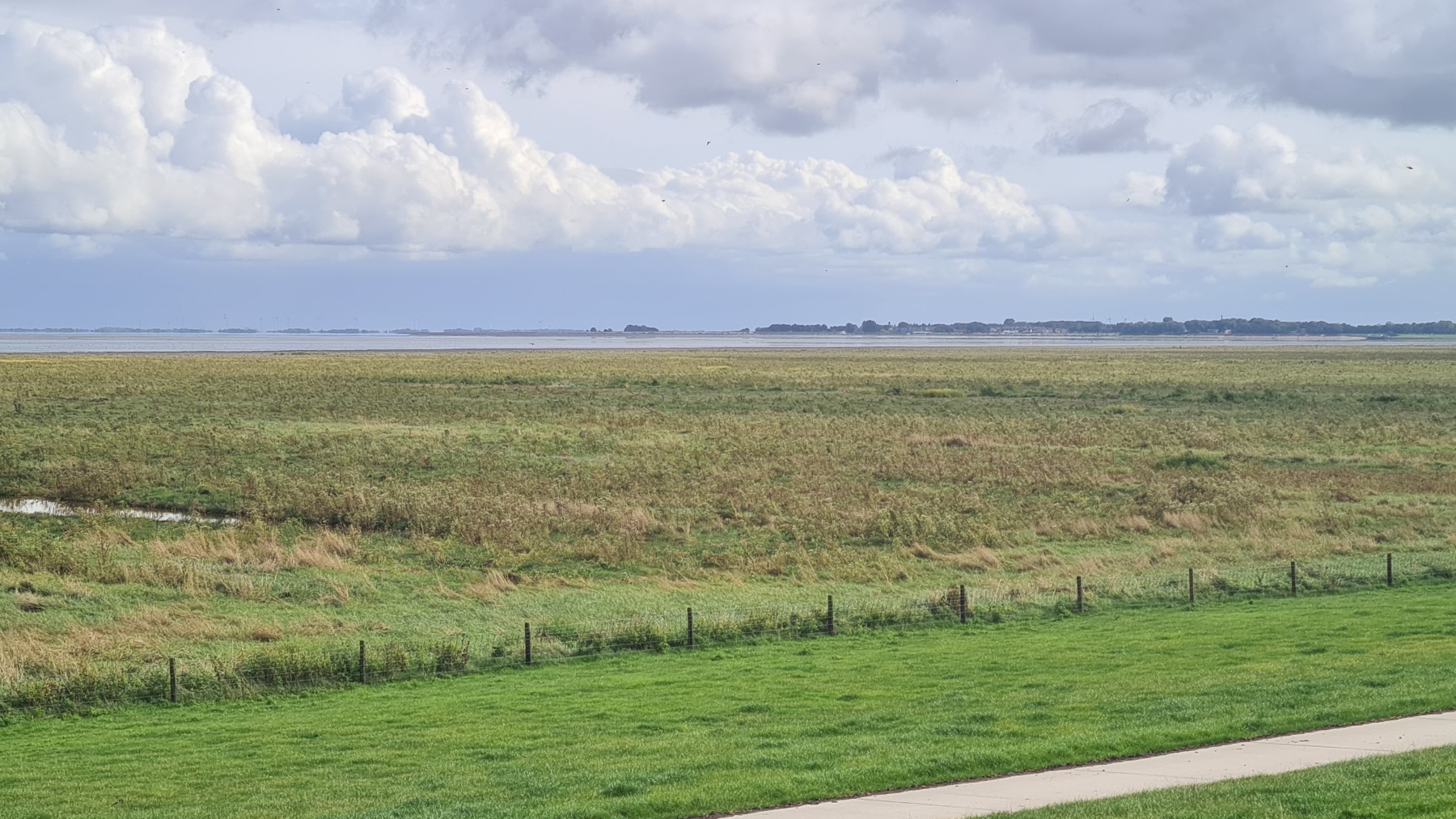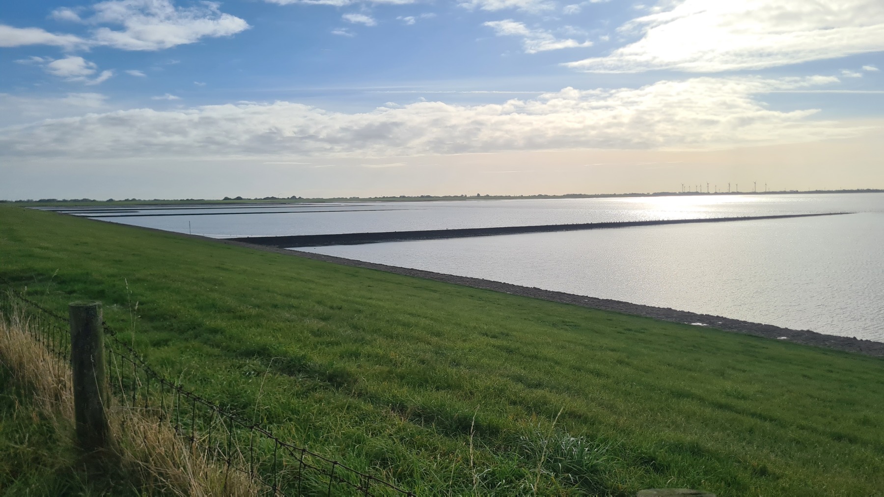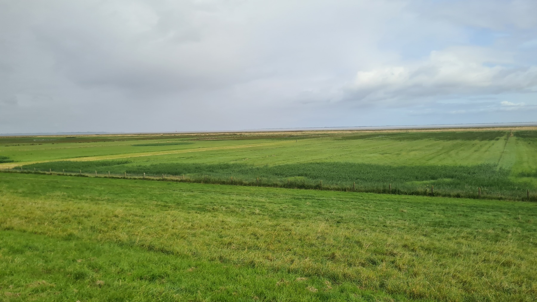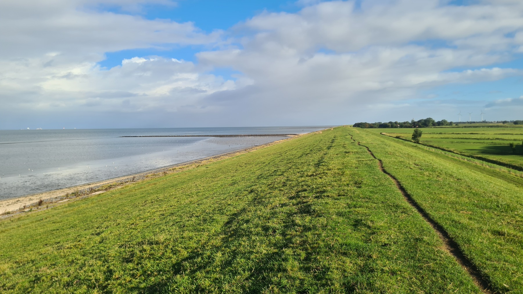 En début de journée mon GPS était toujours aussi décalé mais cela s’est un peu arrangé pendant le déjeuner et la position est plus correcte cet après midi…Nous poursuivons notre progression le long des digues enherbées et des moutons. Aujourd’hui le vent a tourné et il vient maintenant du Nord. Nous avons apprécié ce matin, un peu moins cet après midi quand nous avons tourné nous aussi et l’avons retrouvé en face de nous ! Nous avons également pris quelques averses non prévues par la météo ce qui n’a pas empêché la journée d’être agréable.