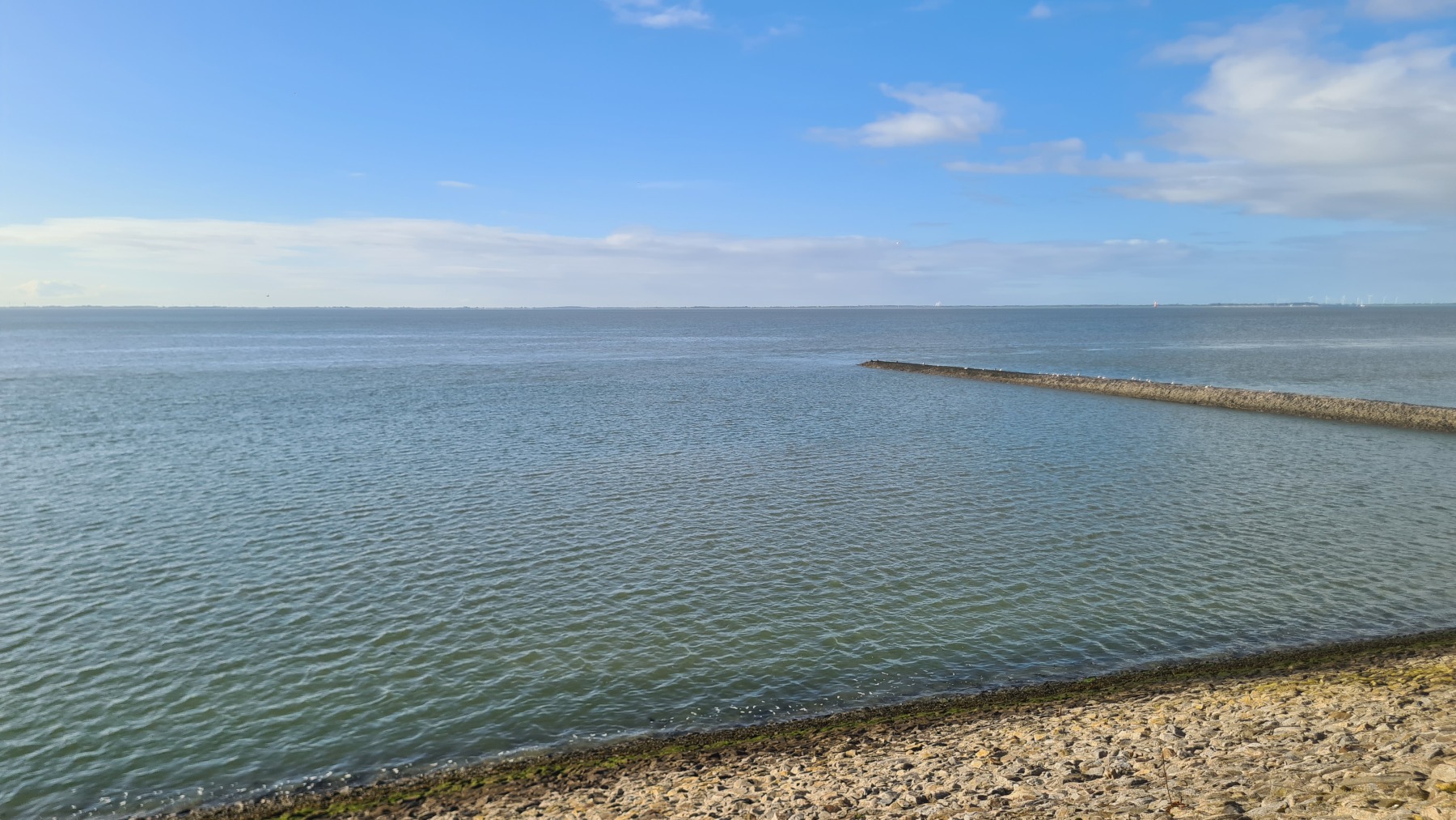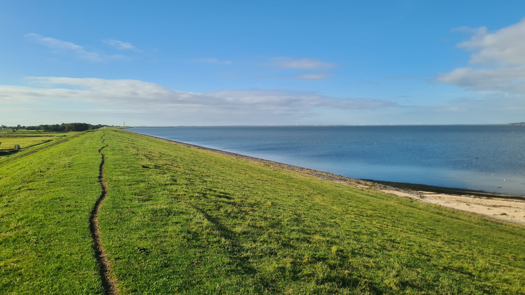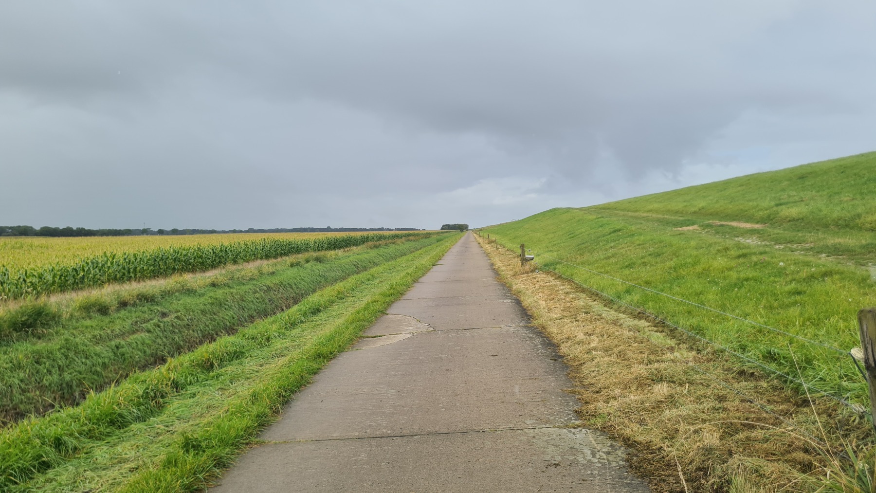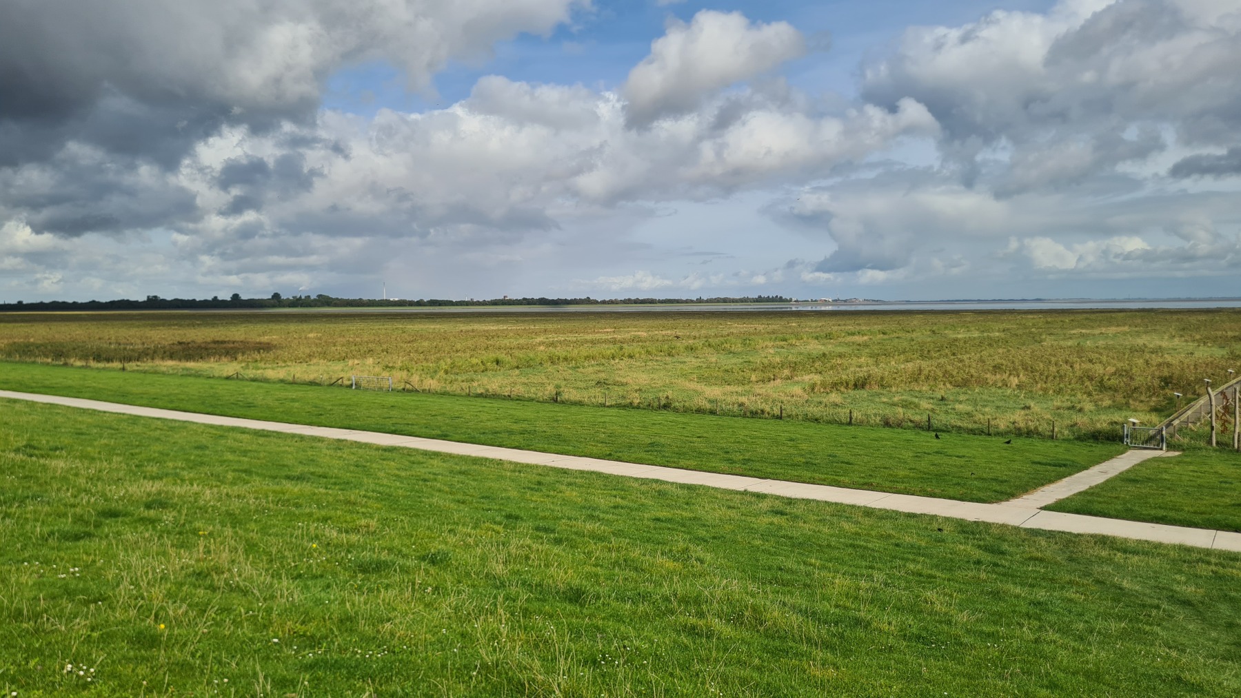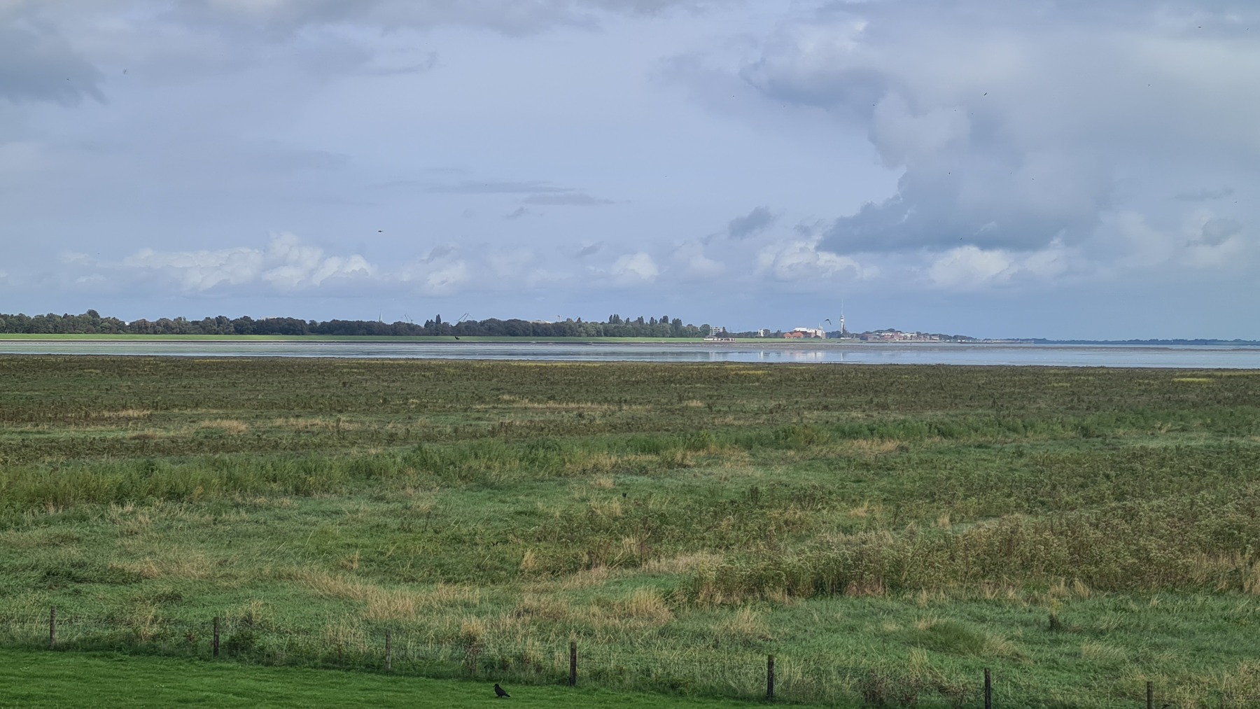 En début de journée mon GPS était toujours aussi décalé mais cela s’est un peu arrangé pendant le déjeuner et la position est plus correcte cet après midi…Nous poursuivons notre progression le long des digues enherbées et des moutons. Aujourd’hui le vent a tourné et il vient maintenant du Nord. Nous avons apprécié ce matin, un peu moins cet après midi quand nous avons tourné nous aussi et l’avons retrouvé en face de nous ! Nous avons également pris quelques averses non prévues par la météo ce qui n’a pas empêché la journée d’être agréable.