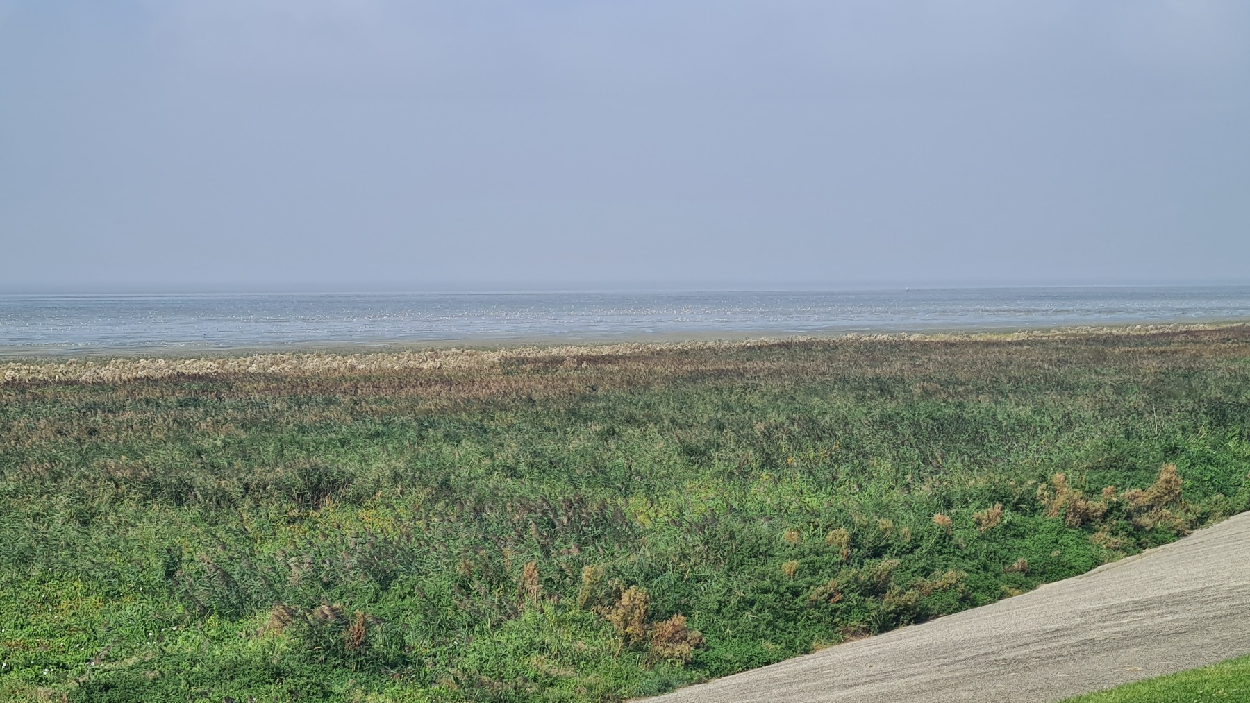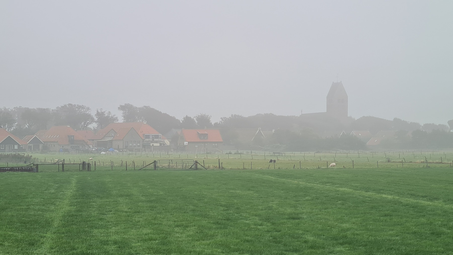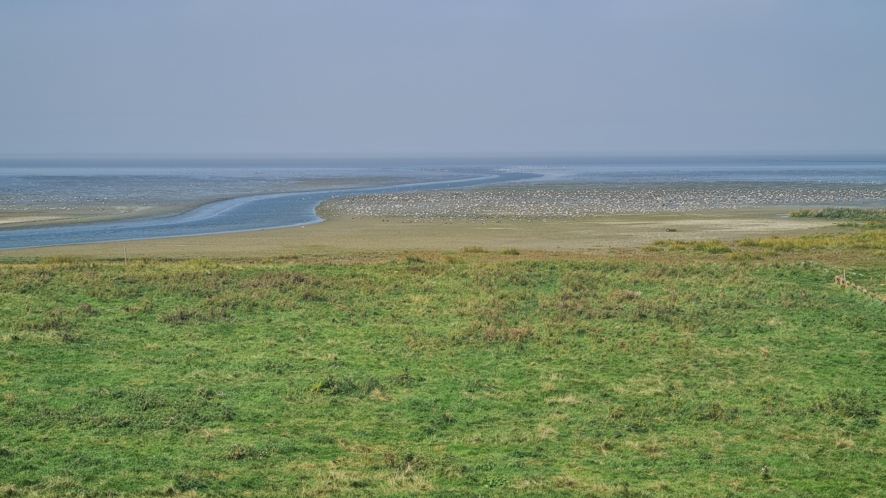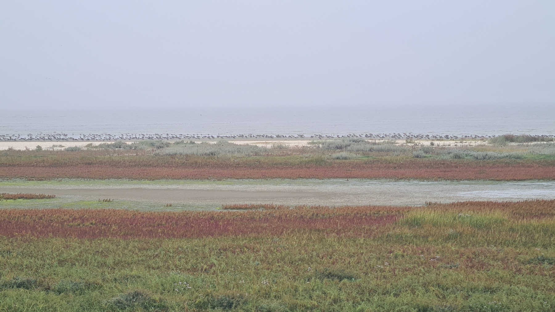 Ce matin nous avons fait le trajet inverse pour retourner prendre le ferry au port de Nes. Le temps était brumeux et la marrée haute et l’ambiance était très différente de celle de ces deux derniers jours. Le seul point commun étaient les oiseaux toujours présents en nombre. Nous avions le vent d’Est en face et les 13 km ont été bien longs !