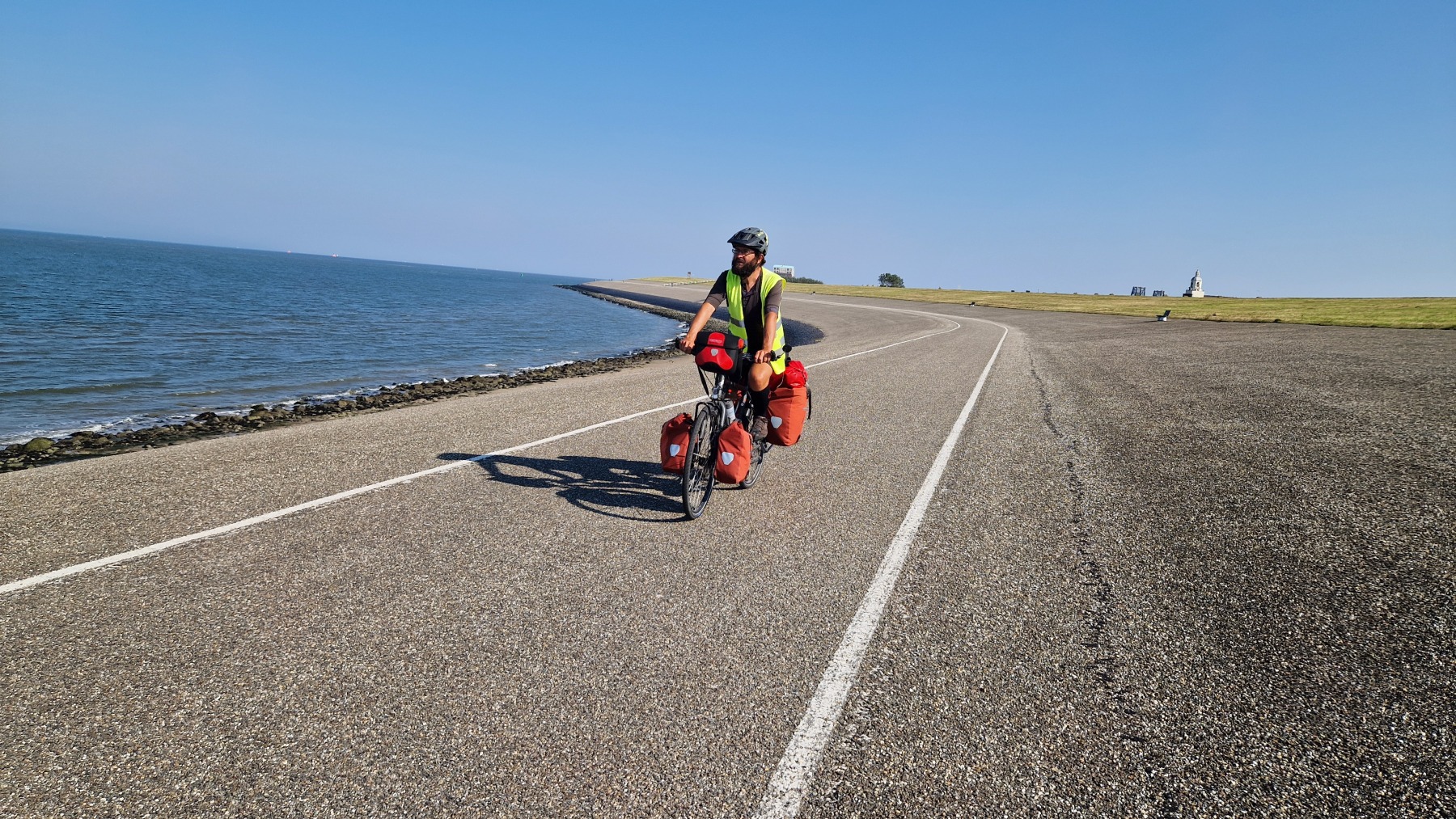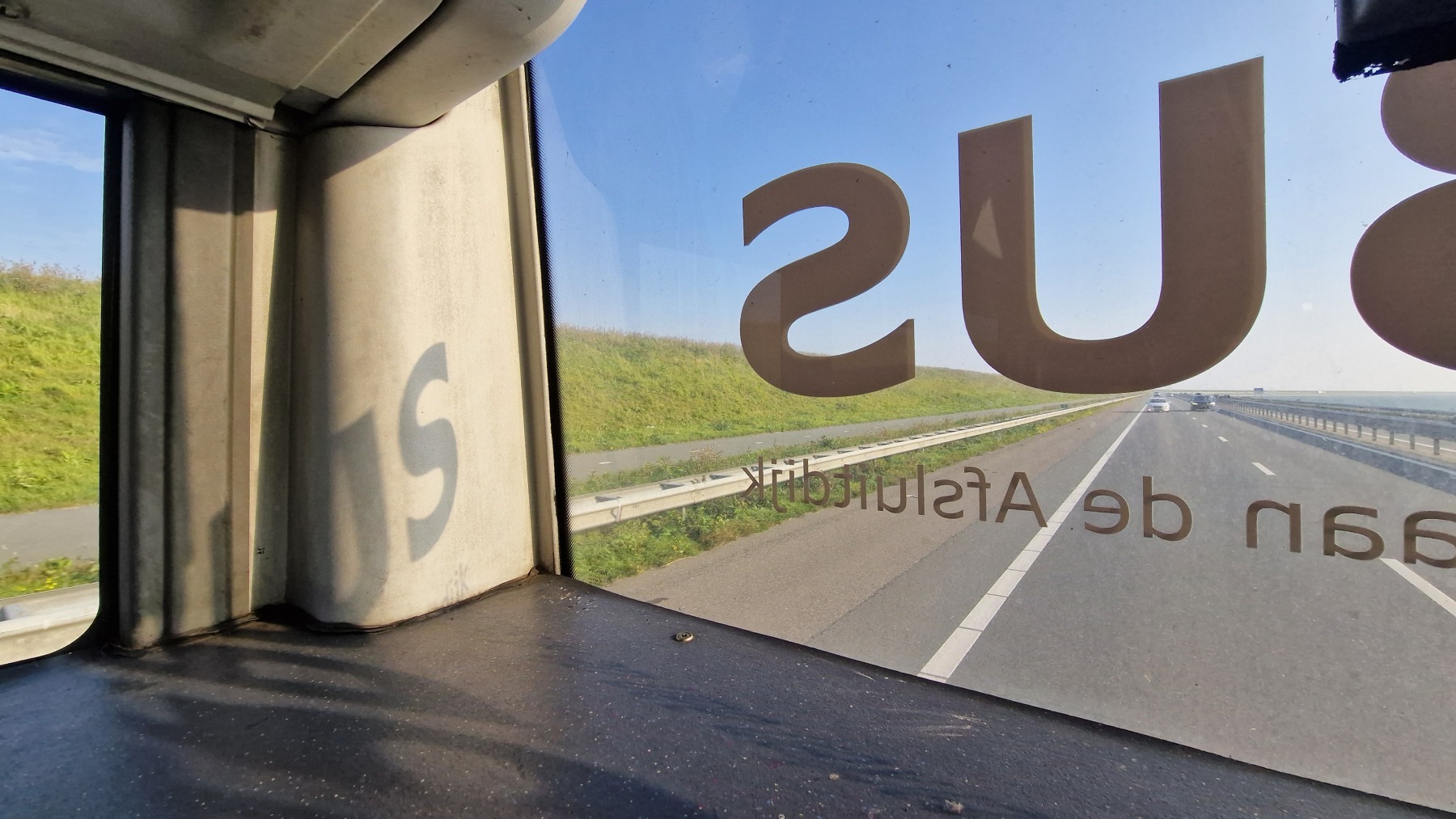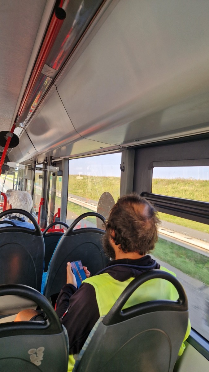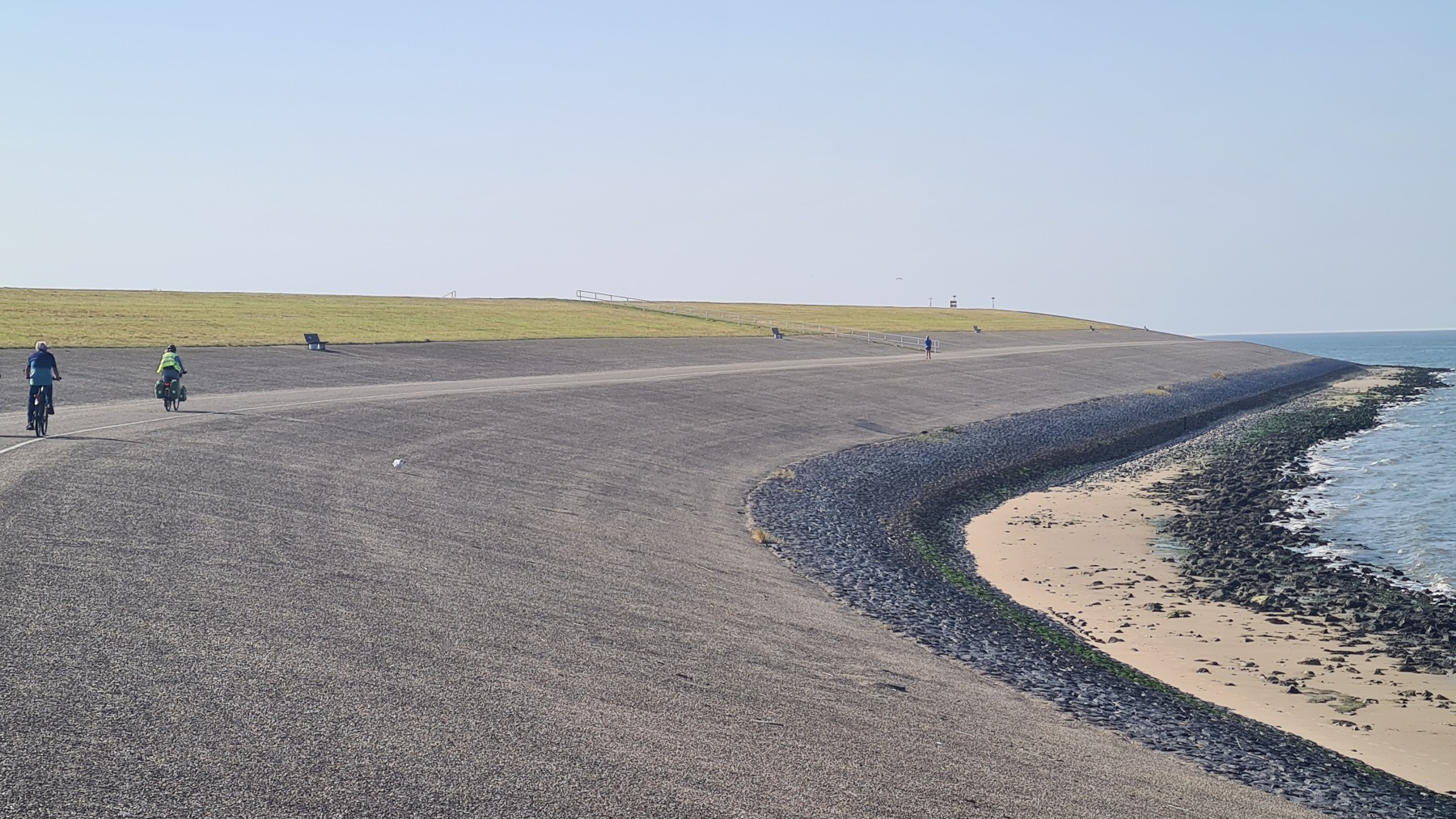 Si tous les Néerlandais semblent au courant que la piste cyclable qui circule sur cette digue est fermée pour travaux sur les écluses situées aux deux extrémités de la digue, ce n’est indiqué nulle part sur Eurovelo 12 que ce soit sur son trajet ou sur son site web… S’agissant des Pays-Bas les pouvoirs publics ont pensé aux cyclistes et ils ont mis en place une navette gratuite par bus pour les vélos mais ça ne remplace pas une traversée en vélo !