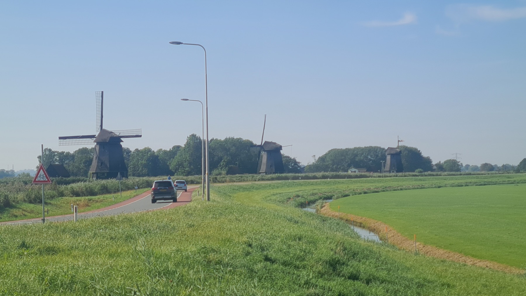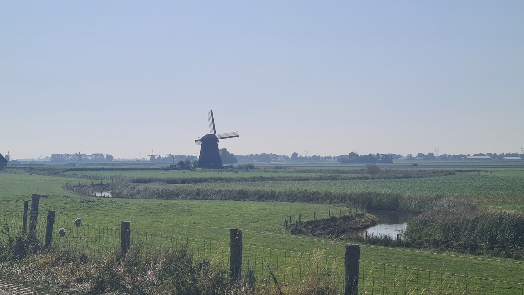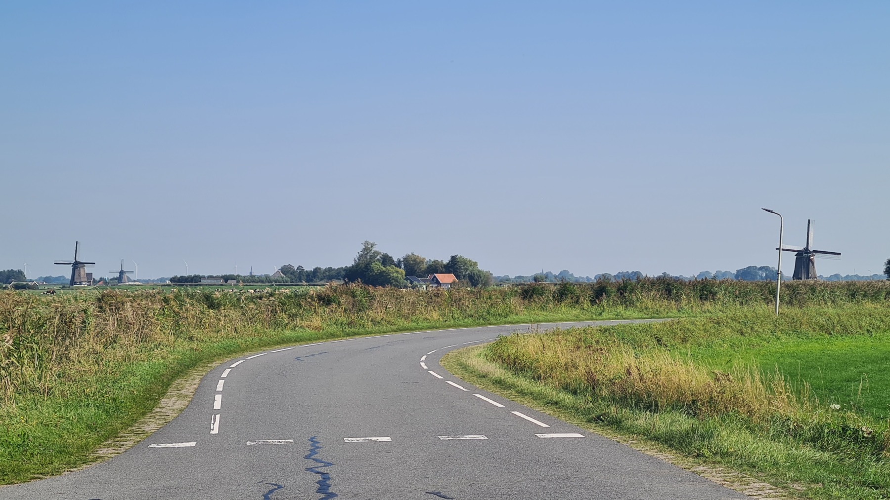 Après avoir quitté la côte nous avons roulé dans un paysage typiquement hollandais, très plat, avec ses moulins, ses champs séparés par des canaux de drainage et ses maisons bien coquettes.