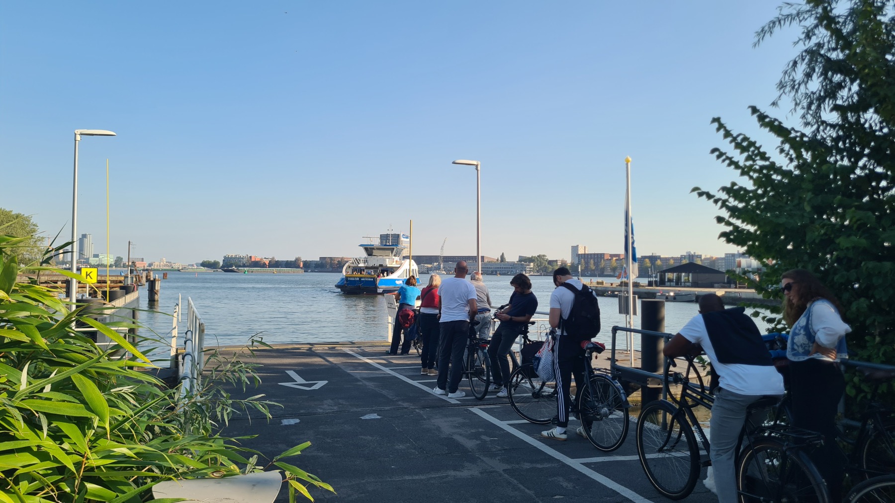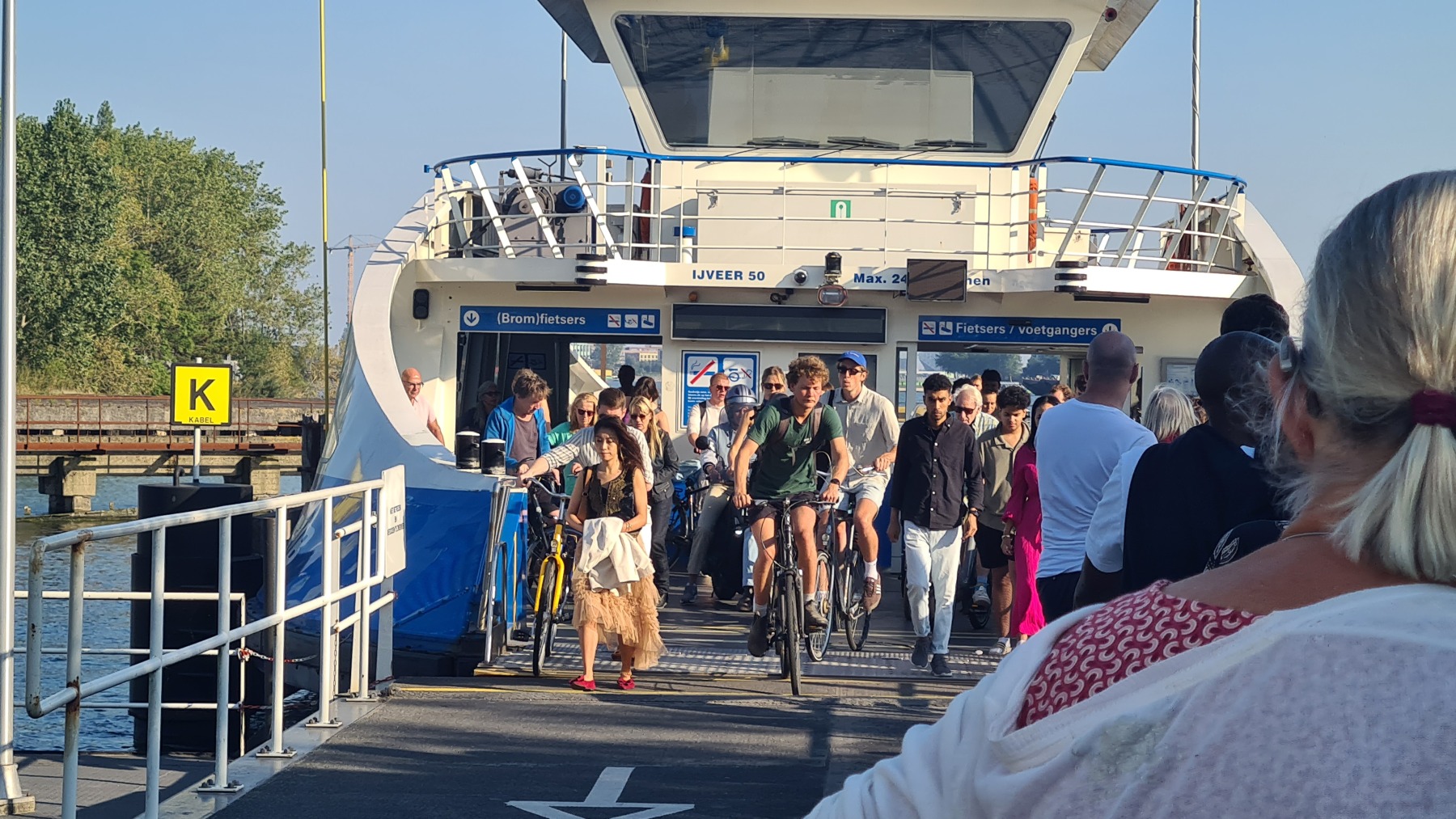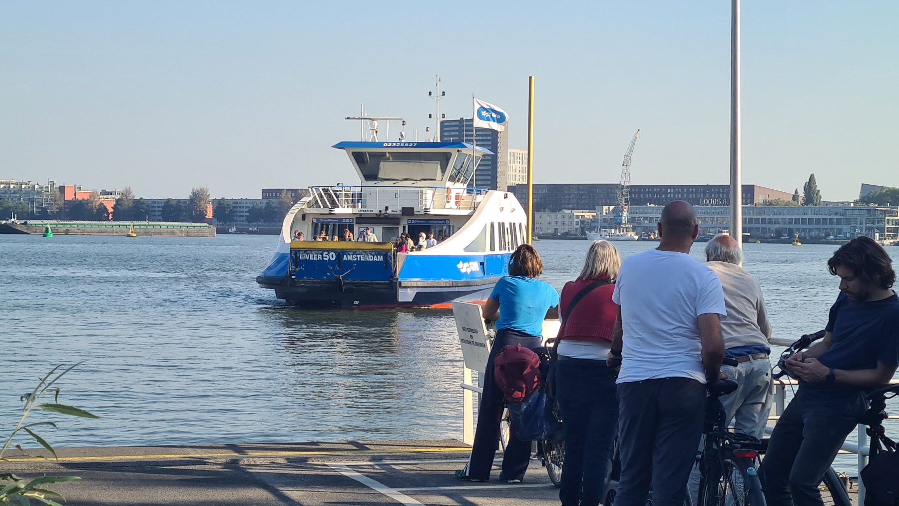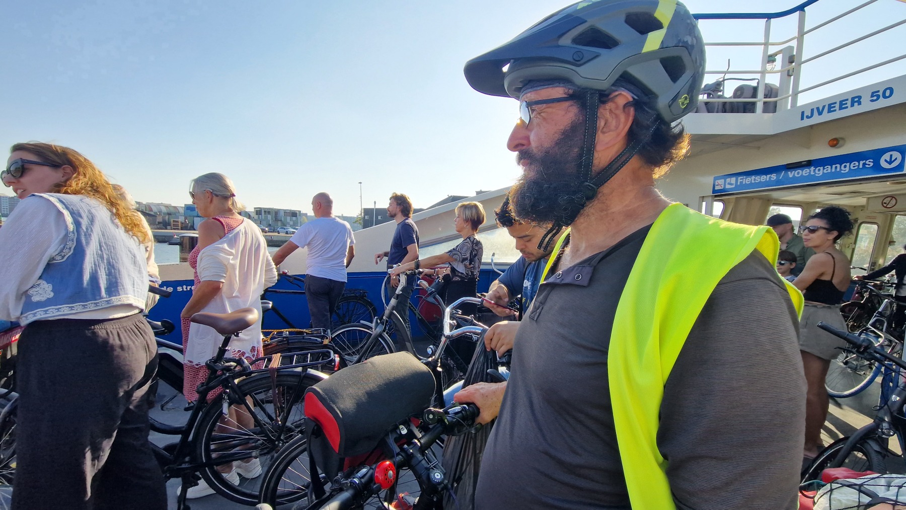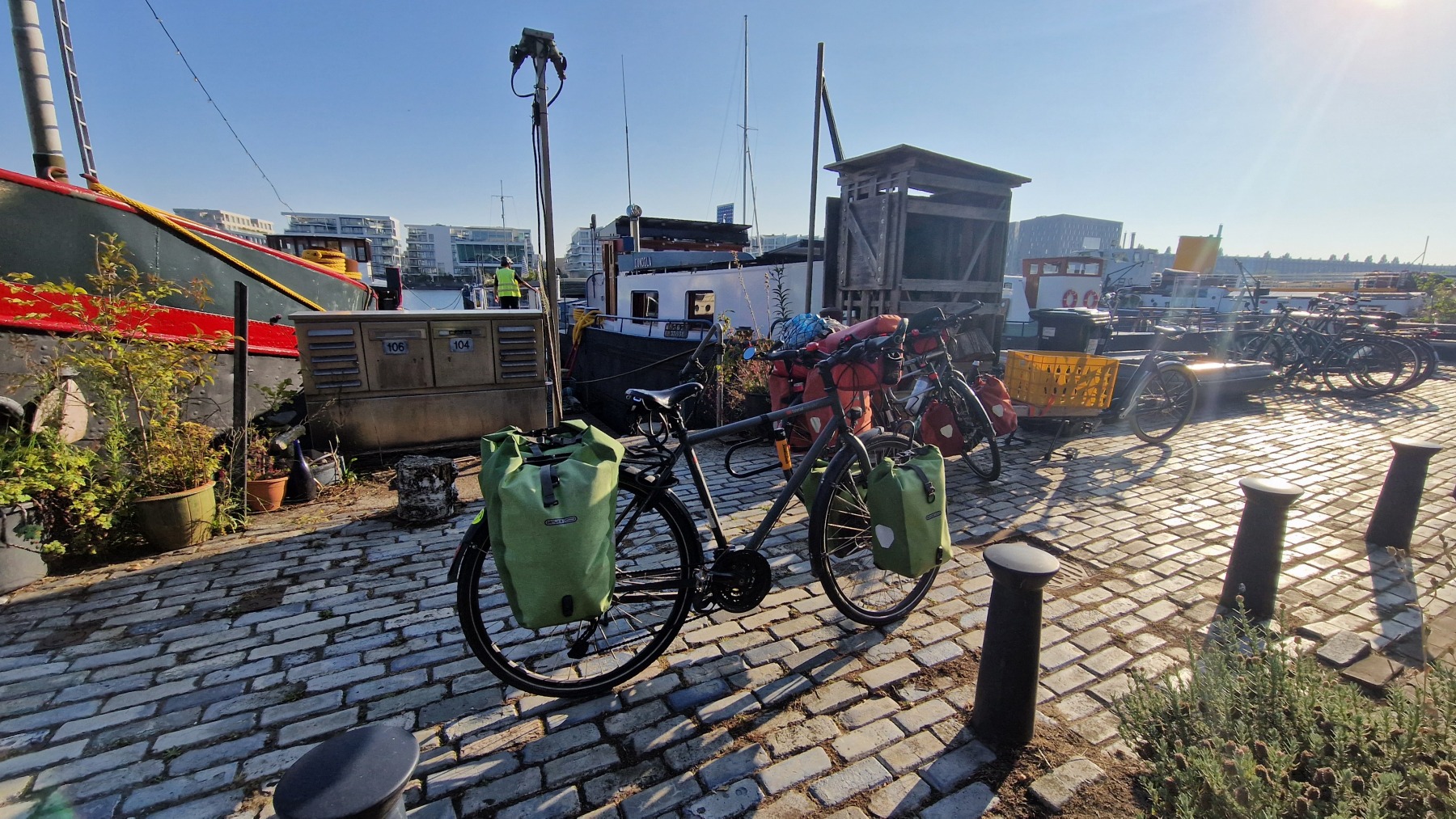 L’IJmeer et les canaux qui le relient à la mer du Nord ont freiné l’expansion de la ville, l’arrivée sur Amsterdam depuis le nord est très agréable et on roule en pleine campagne jusqu’à l’entrée de la ville. Des ferrys gratuits pour piétons et vélos tentent de désenclaver le nord d’Amsterdam et nous avons pris l’un d’entre eux pour arriver jusqu’à la péniche où nous habiterons pendant notre séjour.