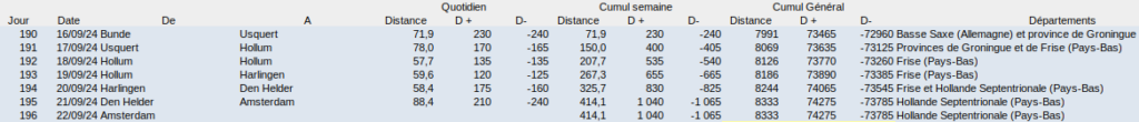 Cinq jours de vélo avec bagages, un jour sans bagages (en vert), un jour de repos (en vert), deux traversées en ferry (en bleu) et un passage de digue en bus (en bleu) pour cette première semaine aux Pays-Bas qui nous voit dépasser les 8000 km depuis notre départ.